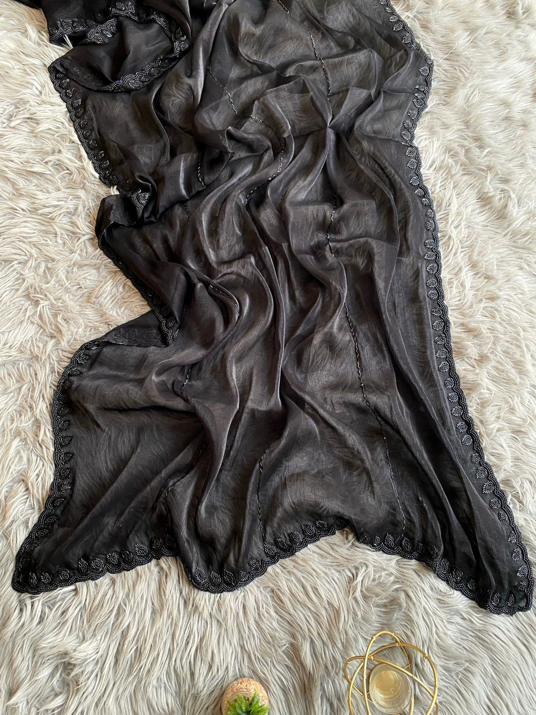 Black Georgette Saree With Satin Polka Dot Lace Border VT1117