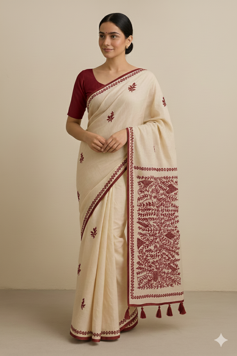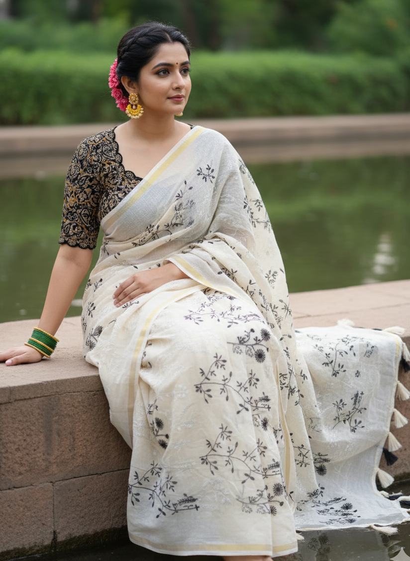 Fabric & Color: The saree is crafted from a lightweight, ivory or off-whiteΒ chanderi-style fabric...