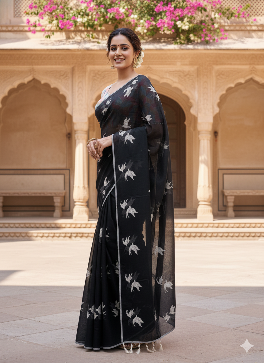 Premium ivory designer saree with soft, flowy drape Elegant black floral embroidery across the saree...