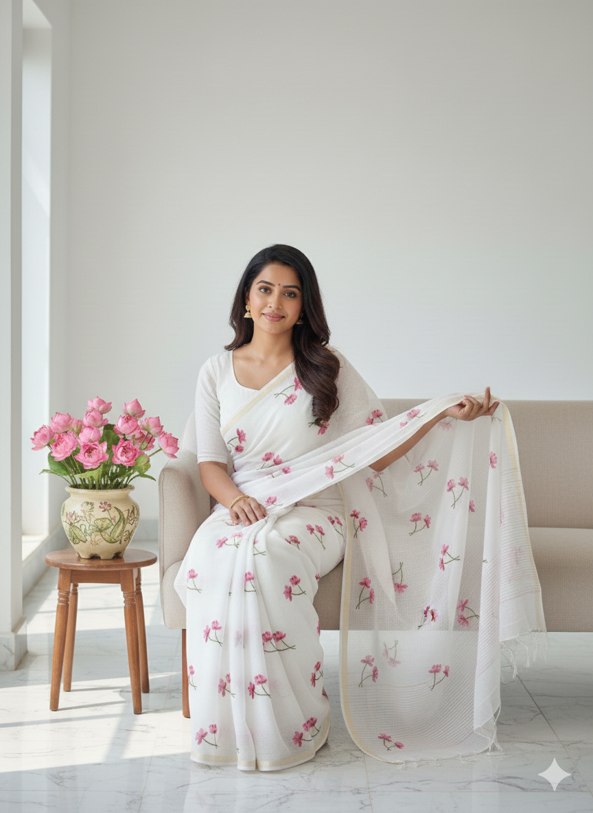 Blooming Blossom White Saree, a beautiful blend of elegance and freshness. Crafted on soft, breathable...