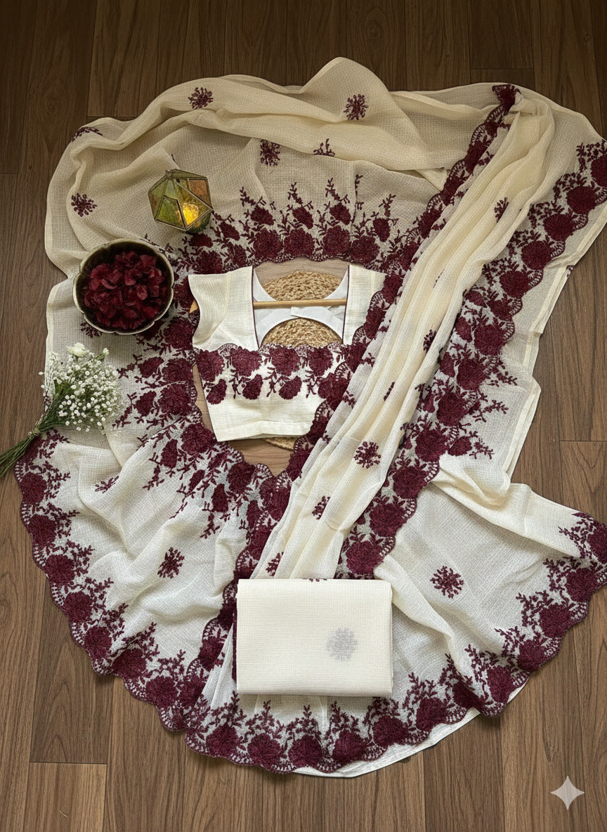 A drop-from-heaven kind of saree, with a burgundy shade over industrial kota fabric with exquisite...