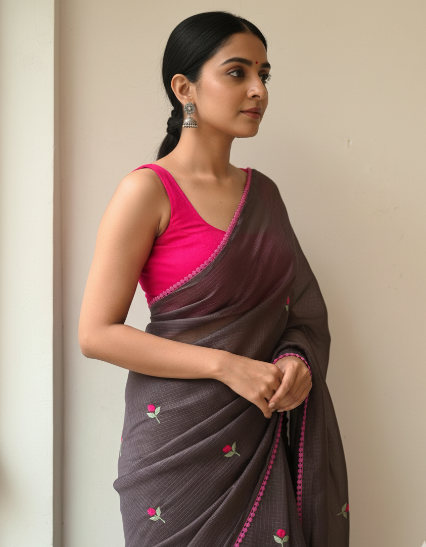 Saree Fabric:Β High-quality, breathable Linen or Cotton blend in a sophisticated dark brown shade. Style:Β Perfect for...