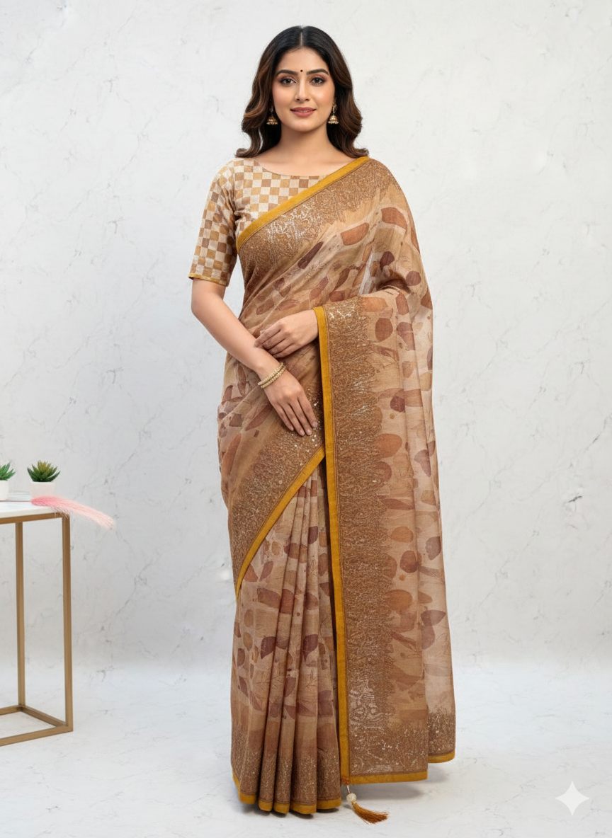 Premium Soft Georgette Military Digital Print Saree With Heavy Sequence Lace Border