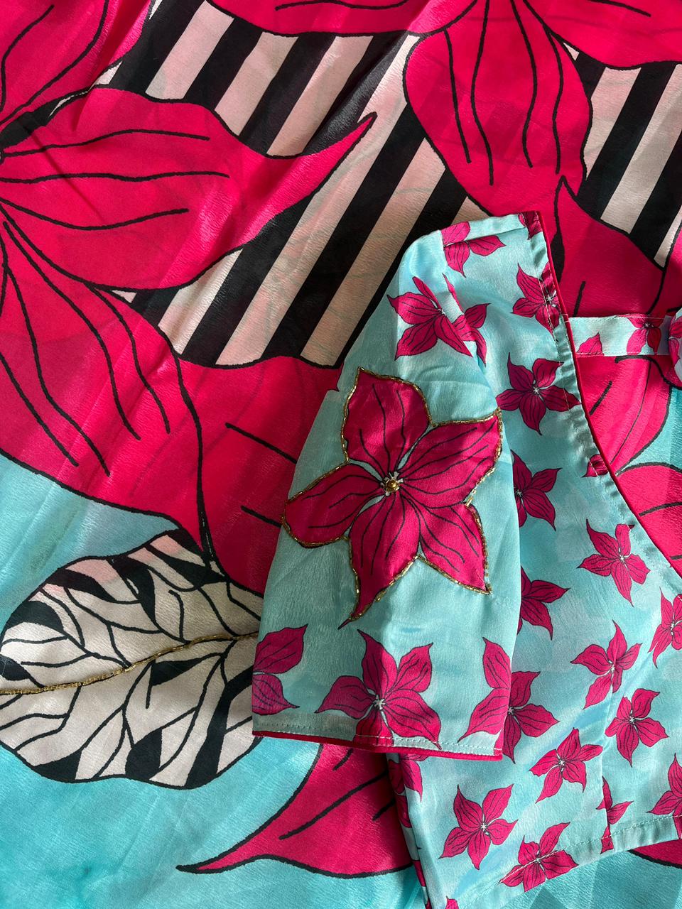 This elegant saree features a refreshing aqua blue base adorned with bold magenta floral prints...