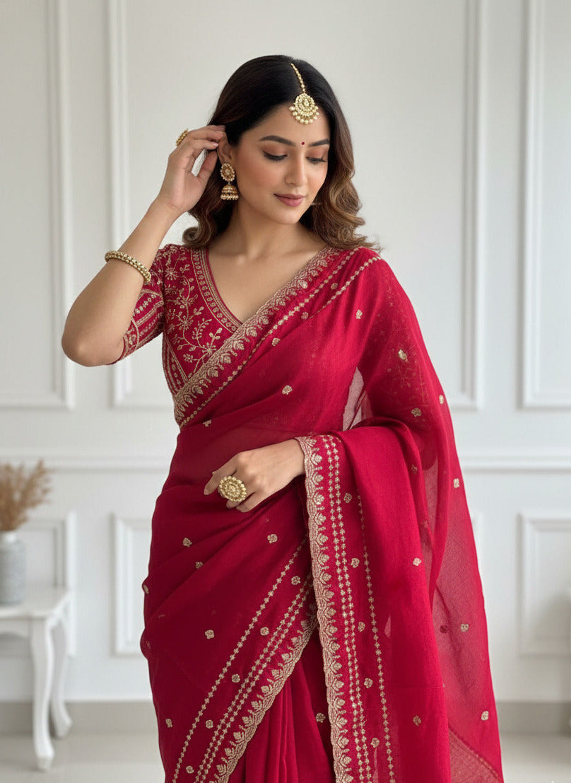 Make a statement of timeless elegance with this royal red Banarasi saree, beautifully crafted to...