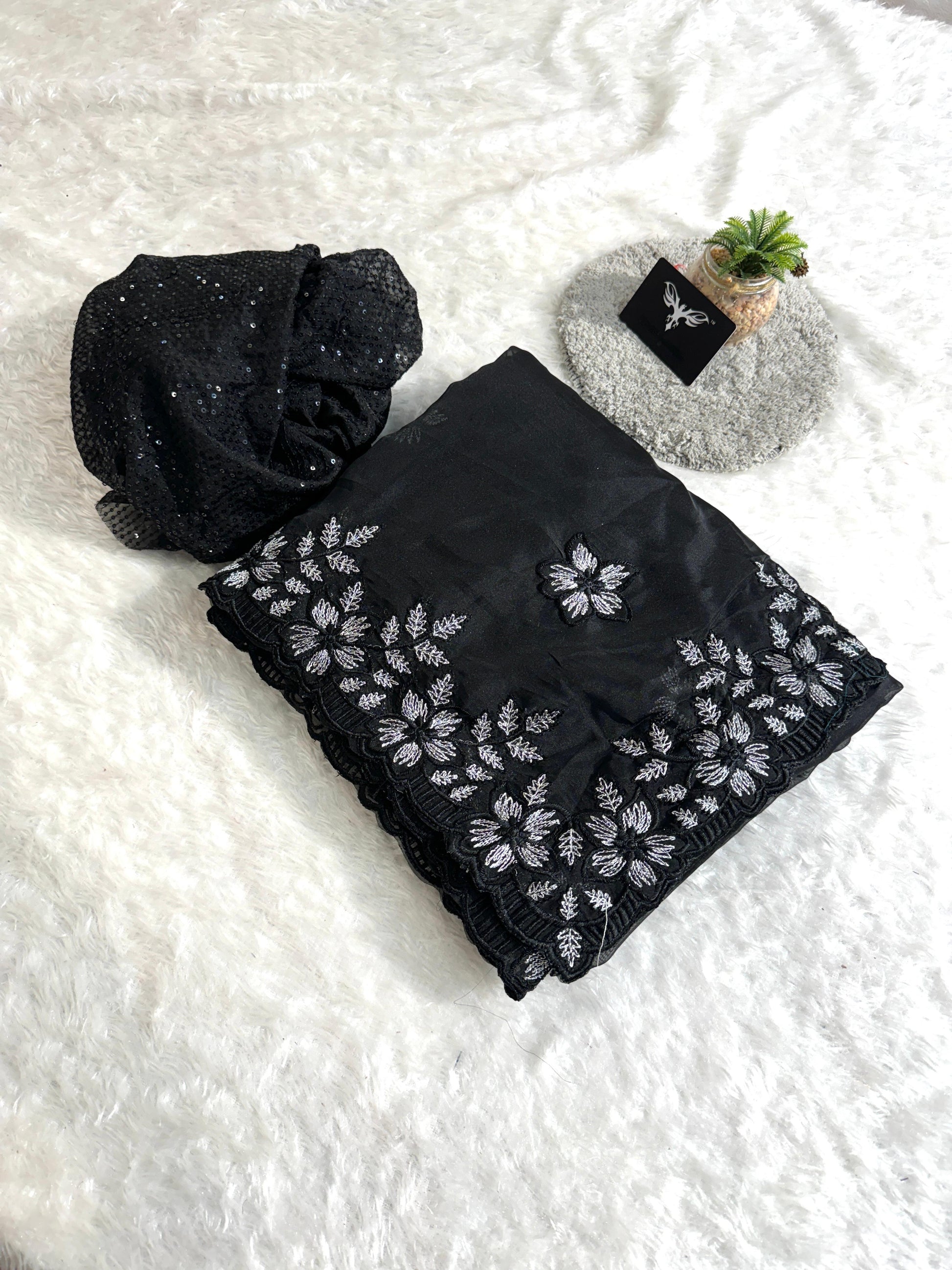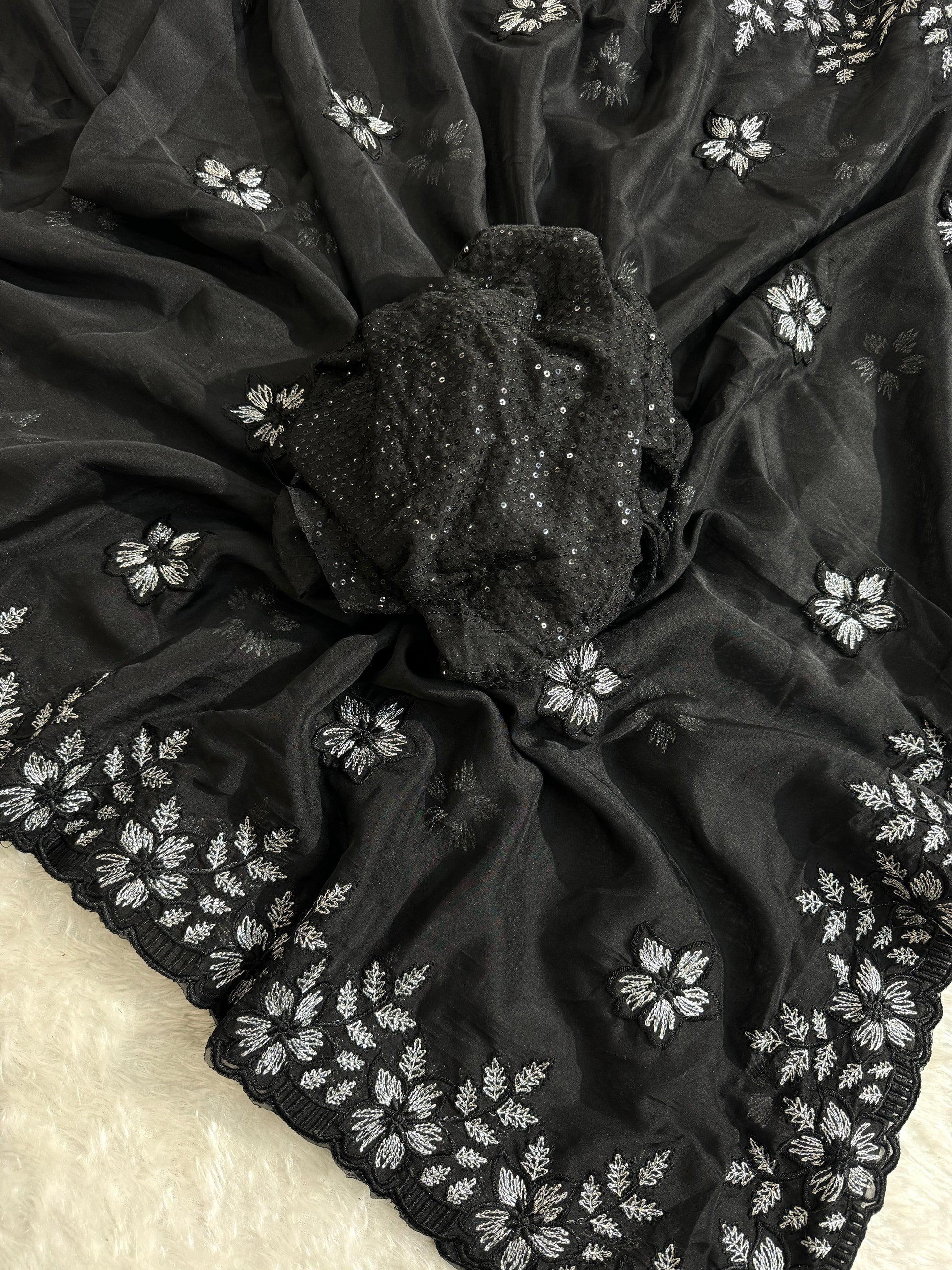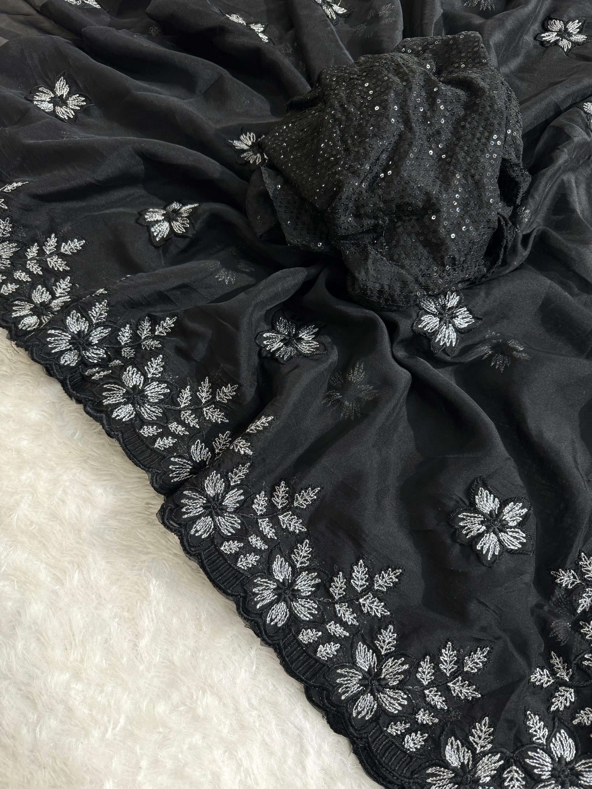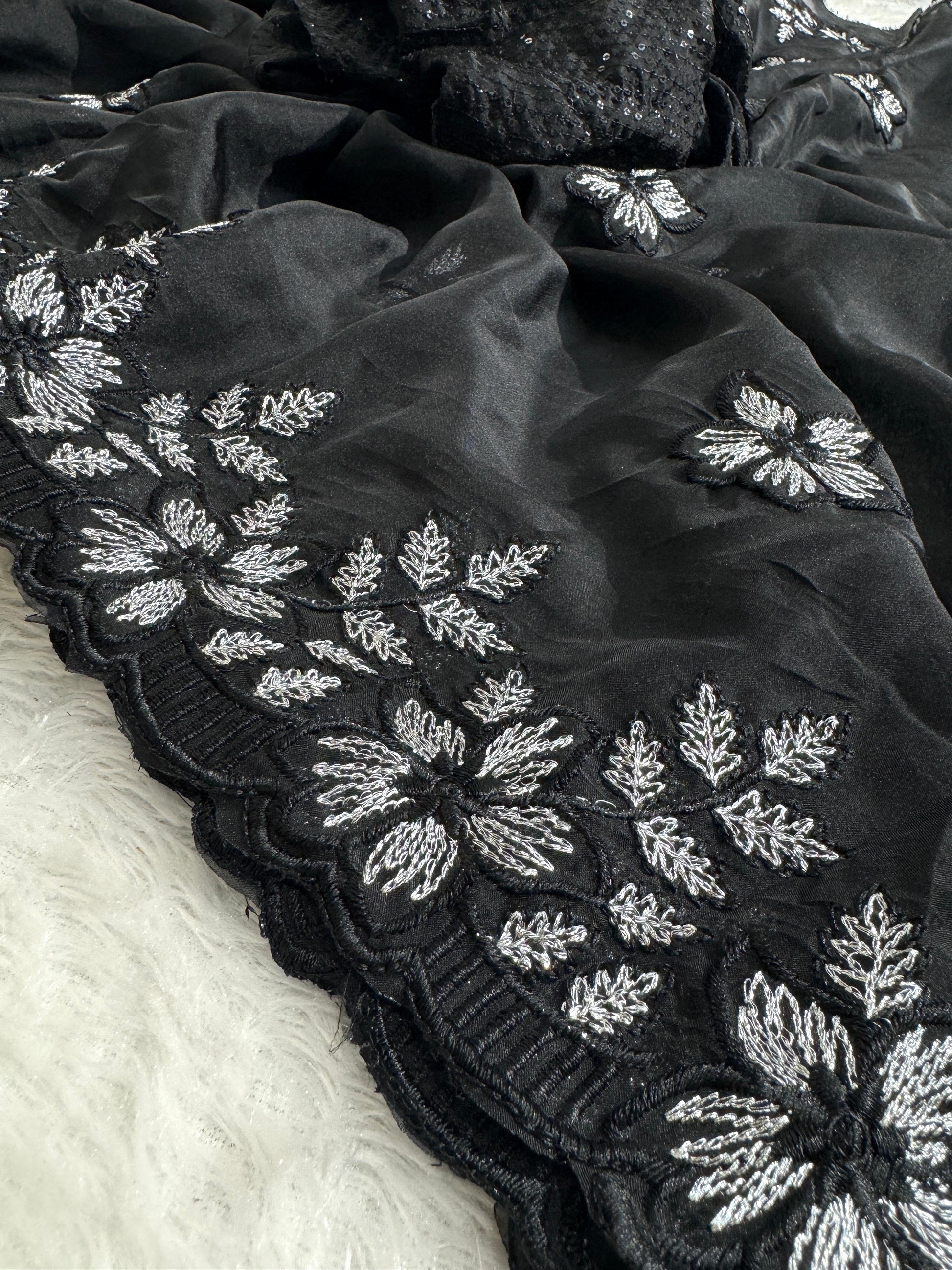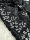 Pure Soft Organza With Multi Black and Silver Thread Work And Cutwork