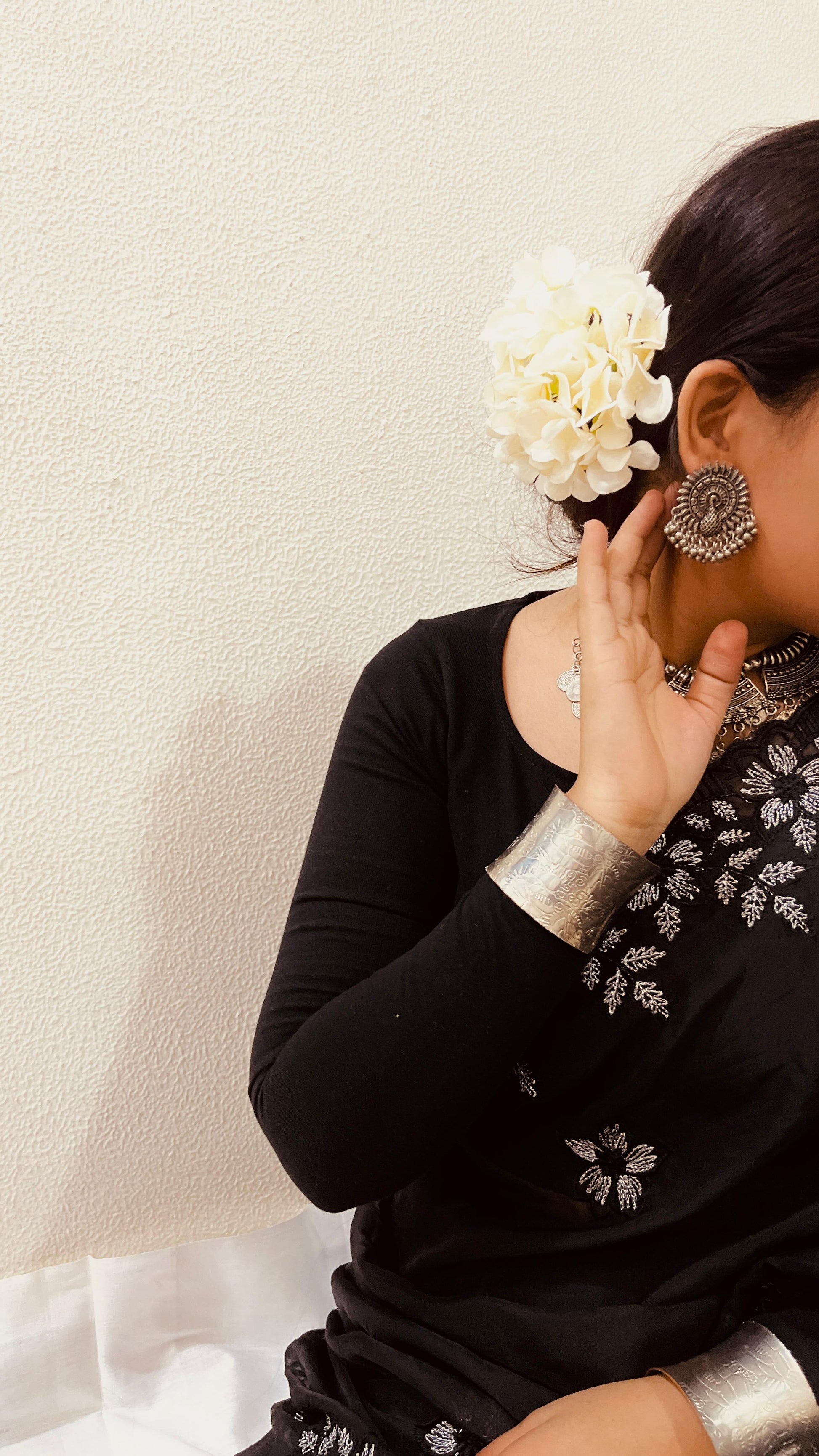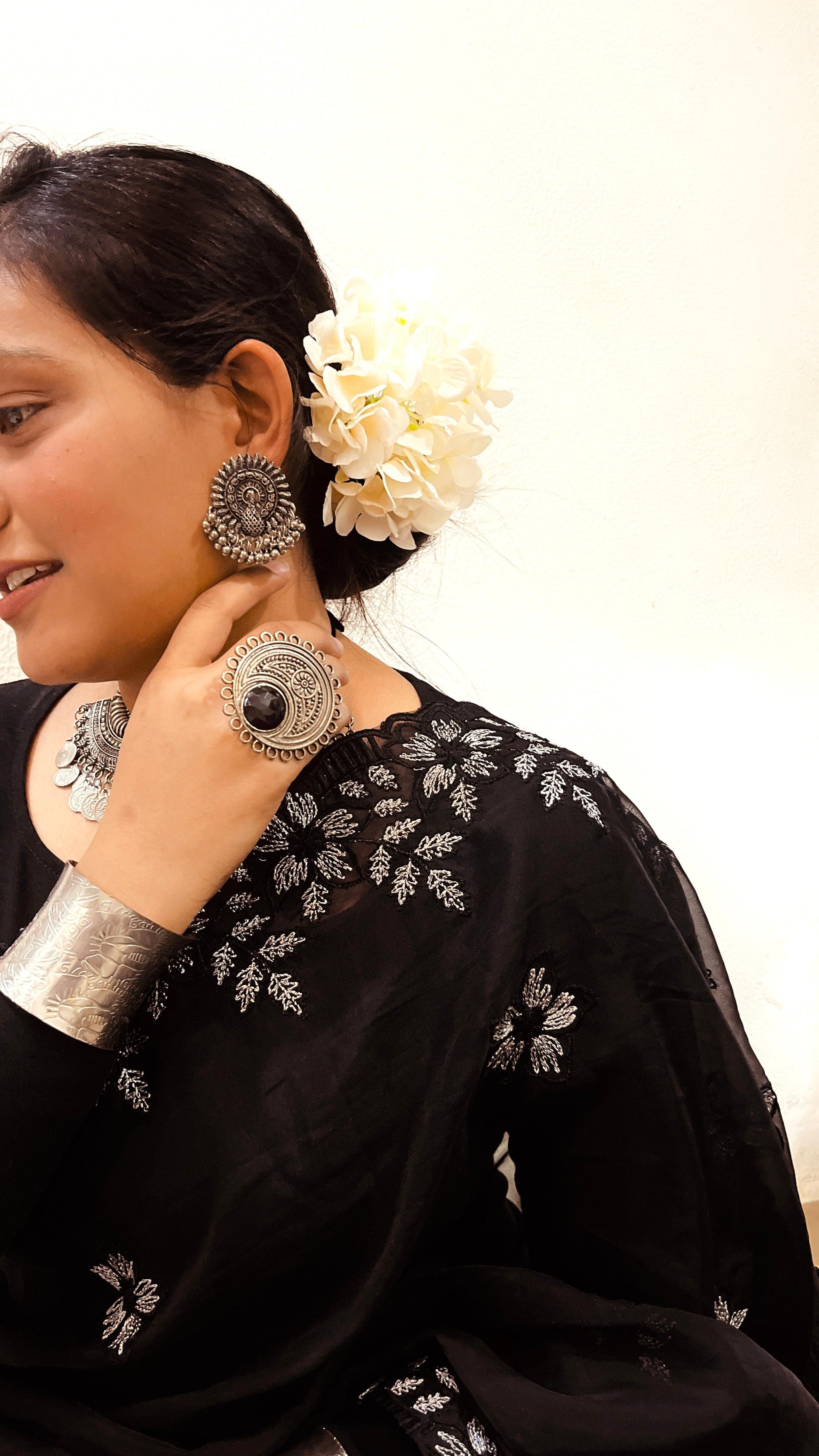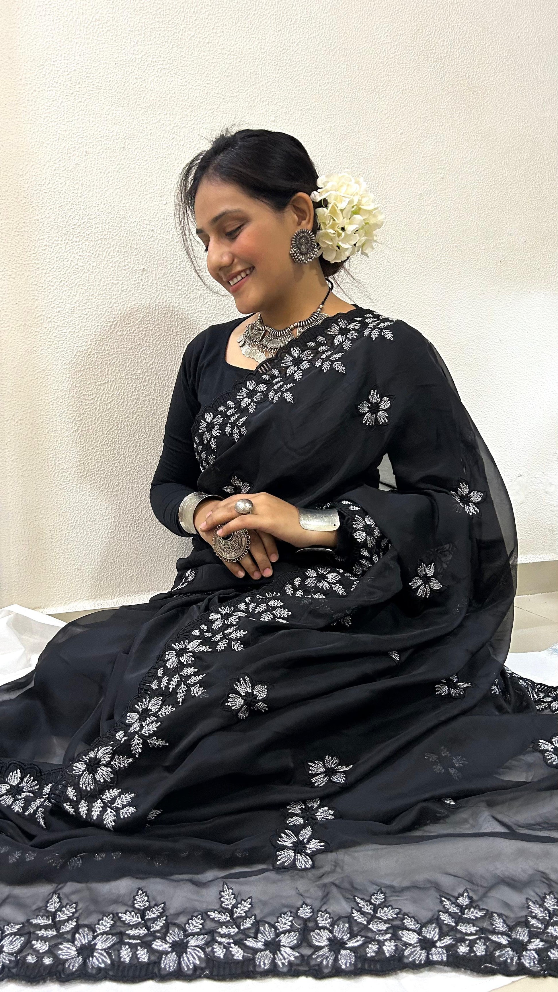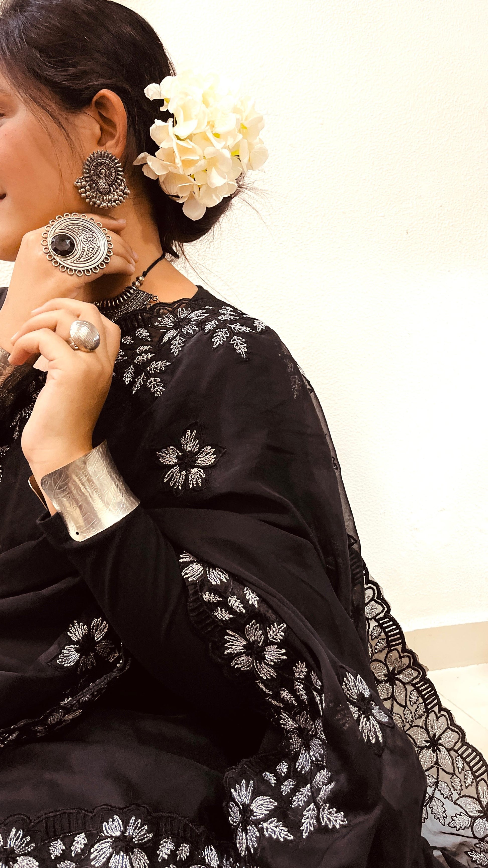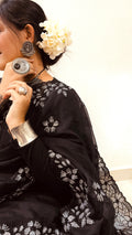Pure Soft Organza With Multi Black and Silver Thread Work And Cutwork