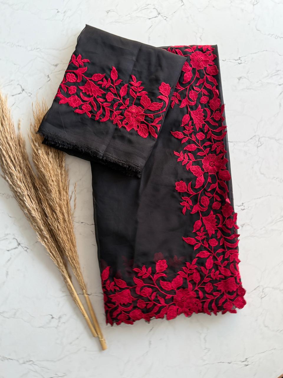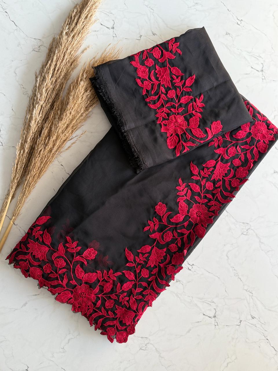 š¤Ā Elegant Black Saree with Striking Red Embroidery