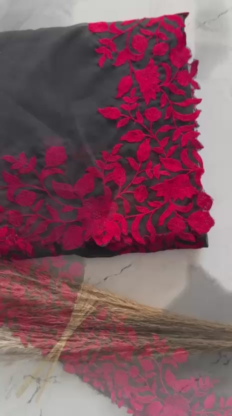 Color:Ā The main body of the saree is a deep, richĀ black, offering a sophisticated and slimming silhouette Ā Ā Embroidery/Work:Ā The saree is heavily adorned with intricateĀ floral and vine-like embroideryĀ in a vibrant, contrastingĀ deep redĀ (possibly a maroon or wine red). Ā