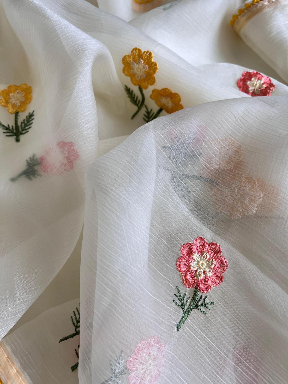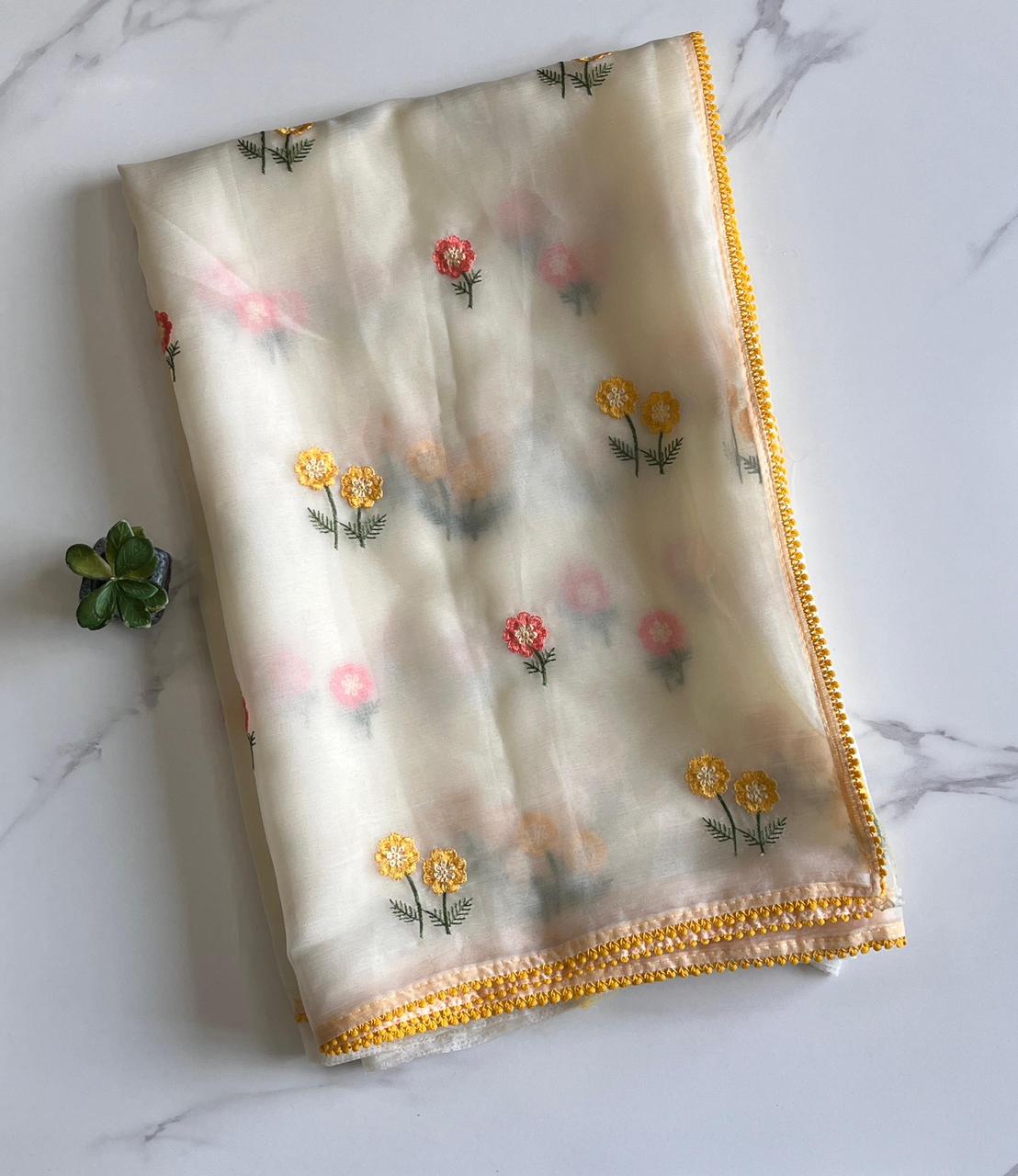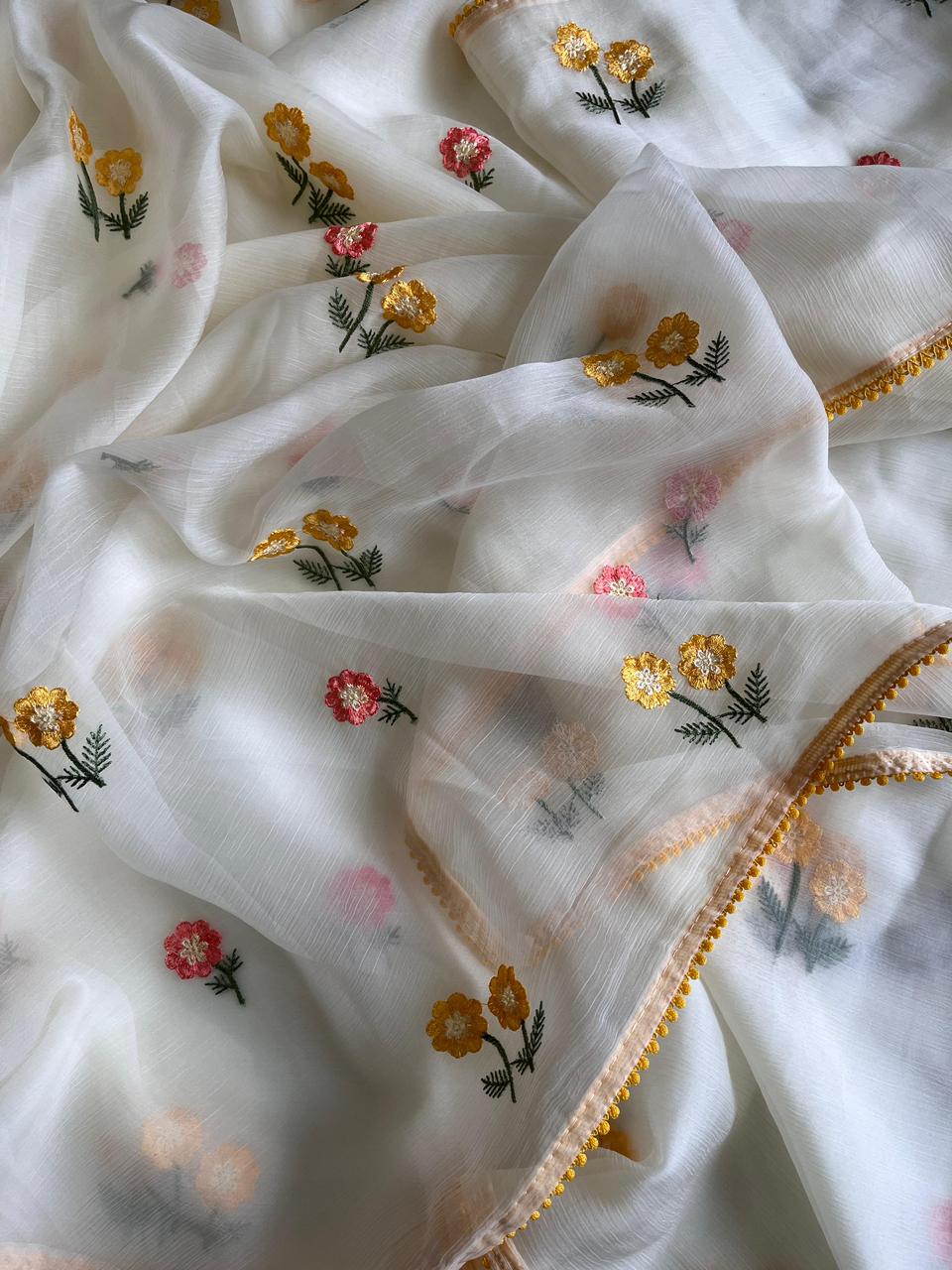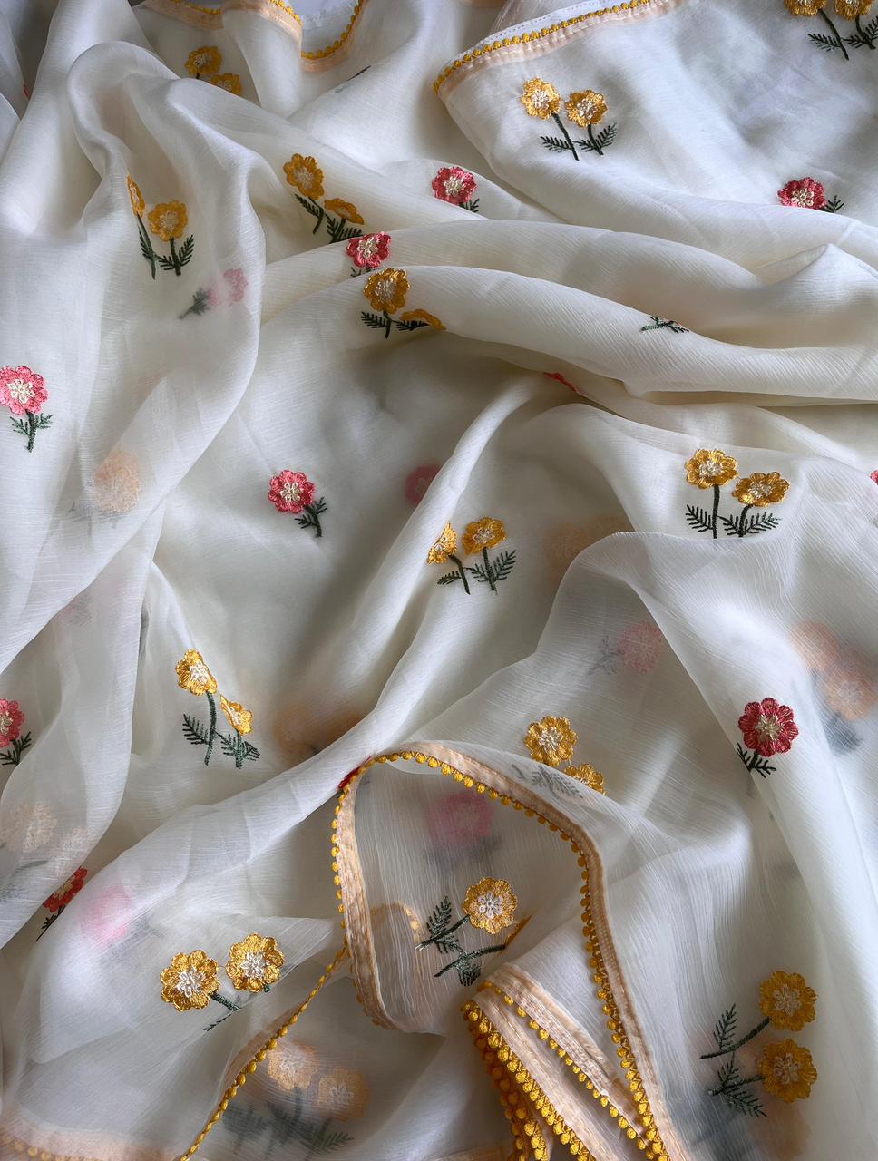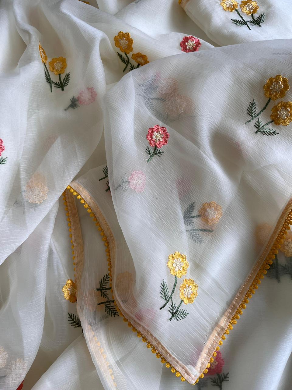 Step into spring regardless of the season! This elegant off-white saree is adorned with multicolor floral buttis and a stunning yellow pom-pom crochet border.