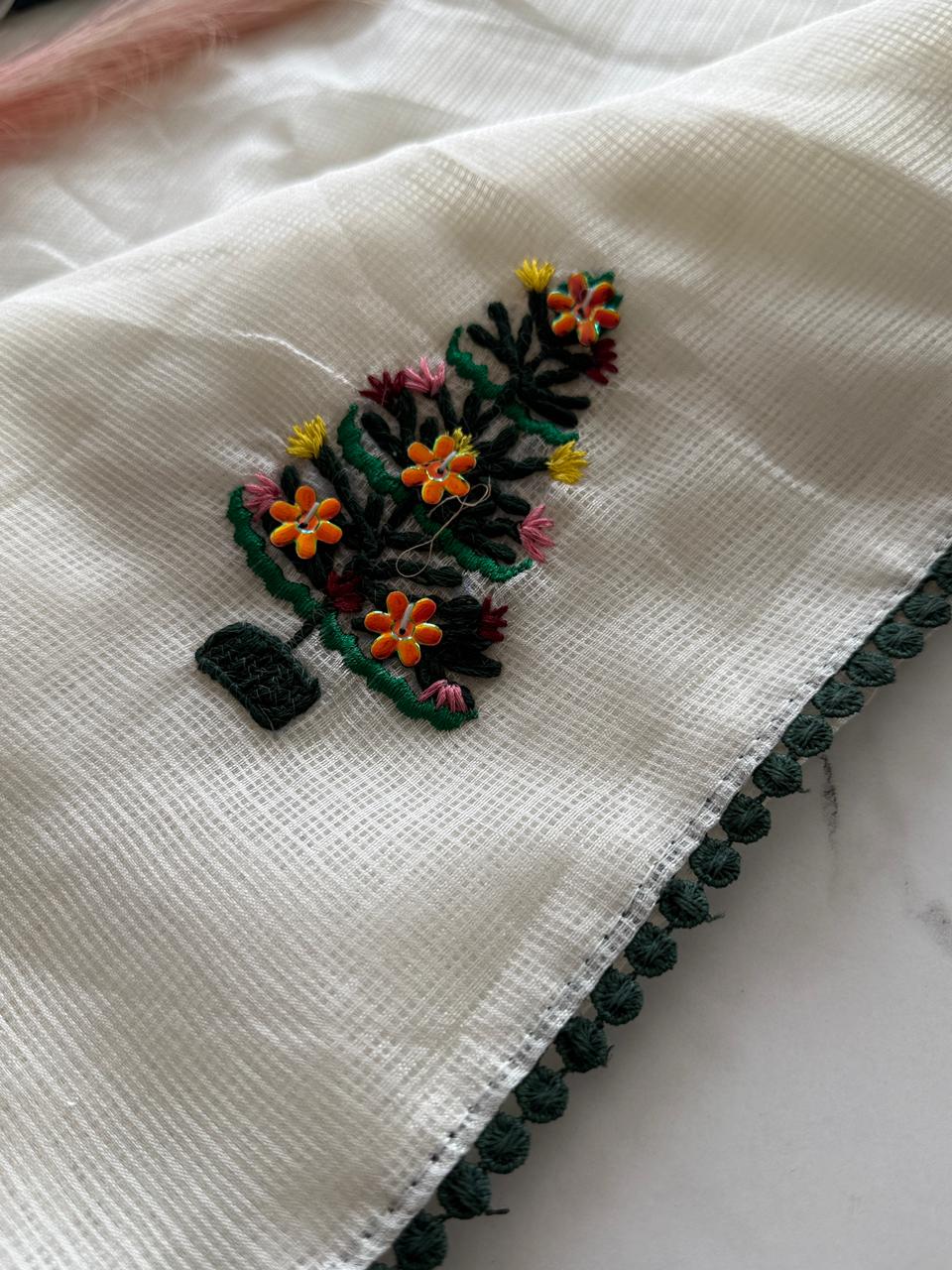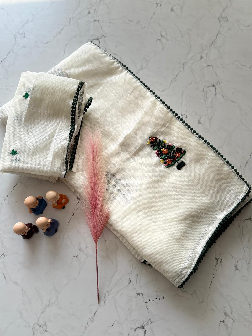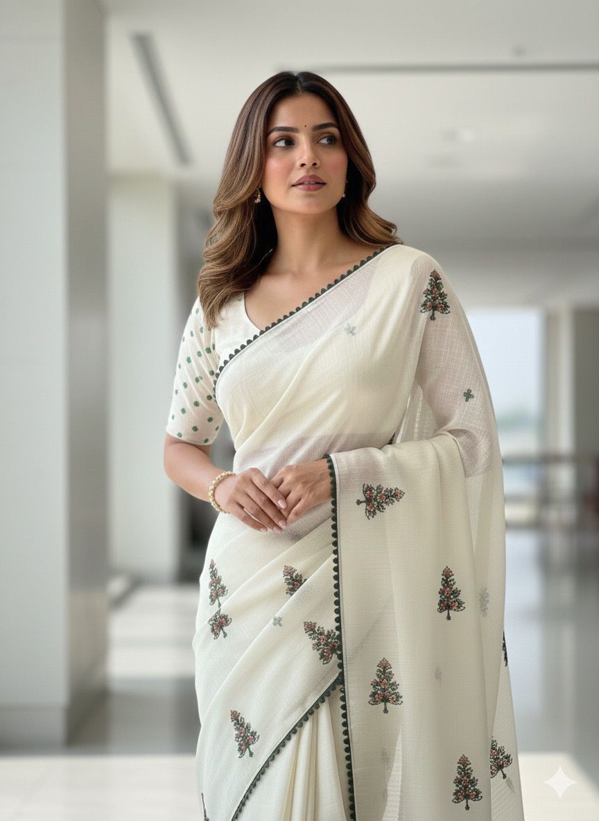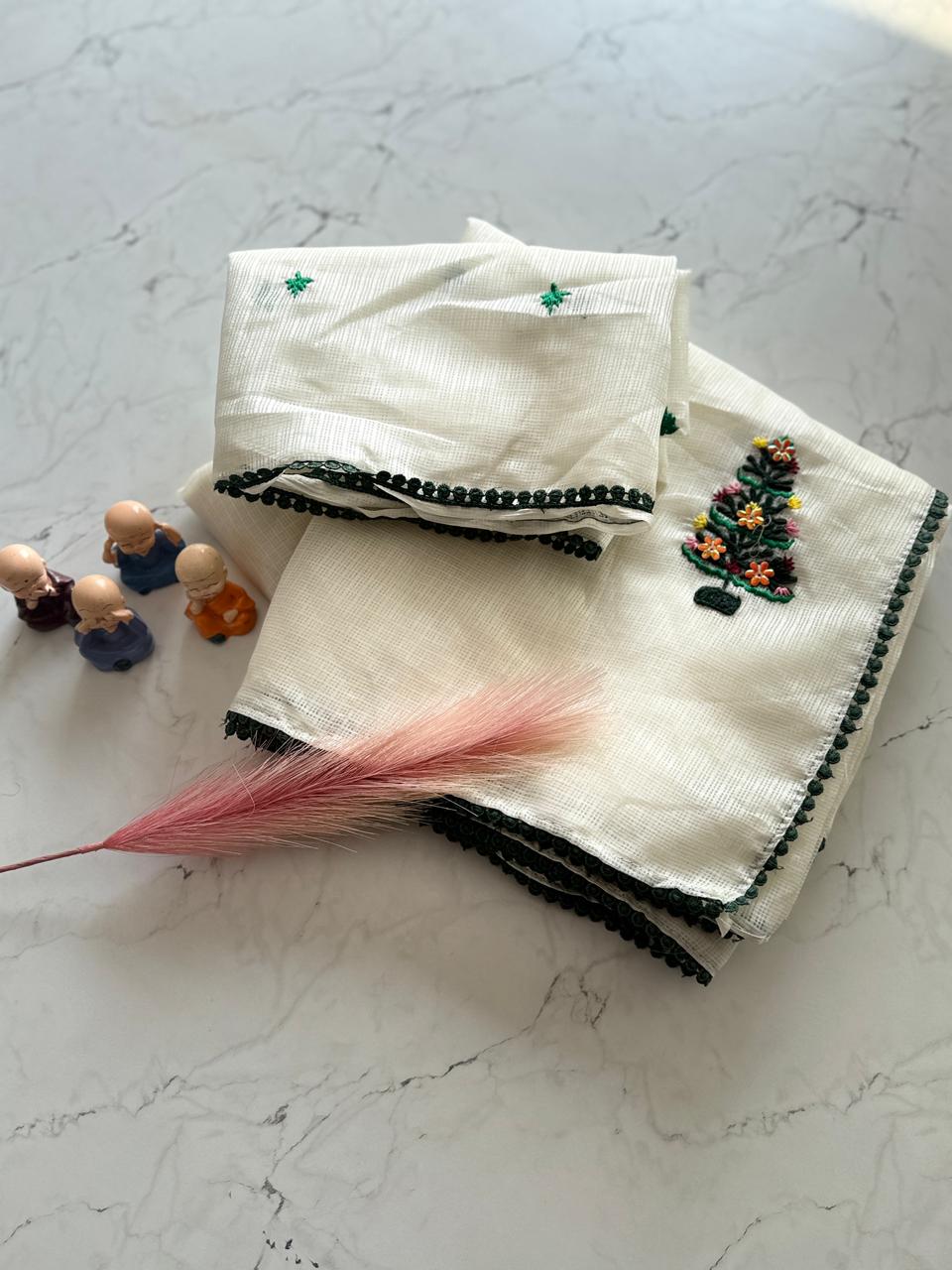 Elevate your festive wardrobe with this elegant Ivory Hand-Embroidered Christmas Tree Saree, crafted to add a soft, graceful glow to your celebrations. Designed in a soothing ivory shade, this saree features delicate tree motifs embroidered with multicolour threadwork, giving it a unique holiday-inspired charm.