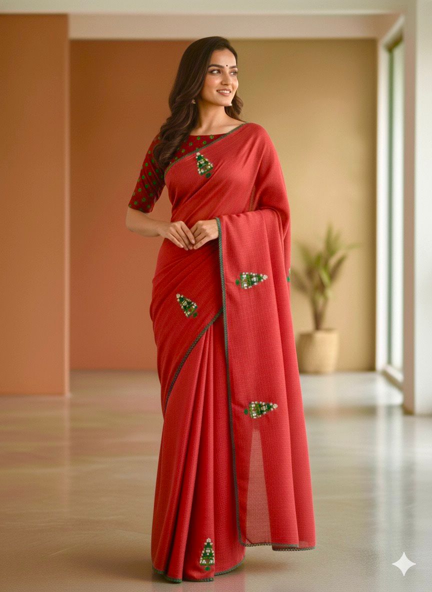 Whether for Christmas celebrations, winter gatherings, or elegant day events, this saree brings a perfect combination of tradition, comfort, and festive elegance.