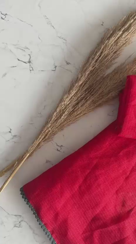 A drop-from-heaven kind of saree, with a burgundy shade over industrial kota fabric with exquisit Handwork embroidery brings out the most elegant look