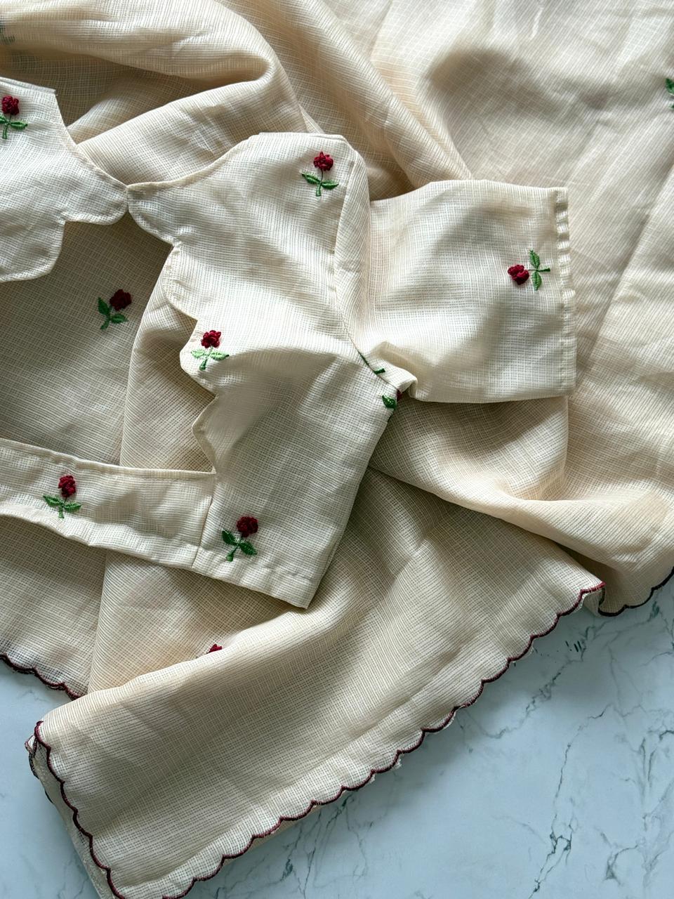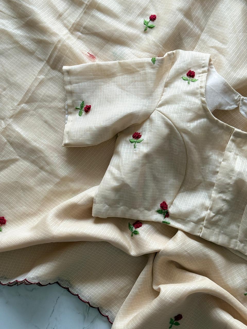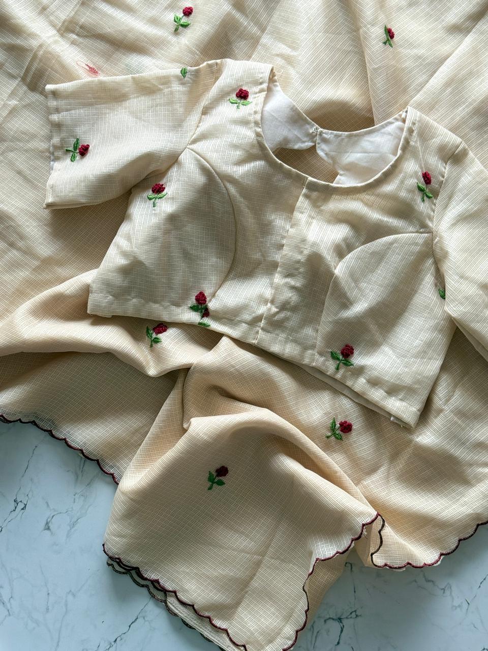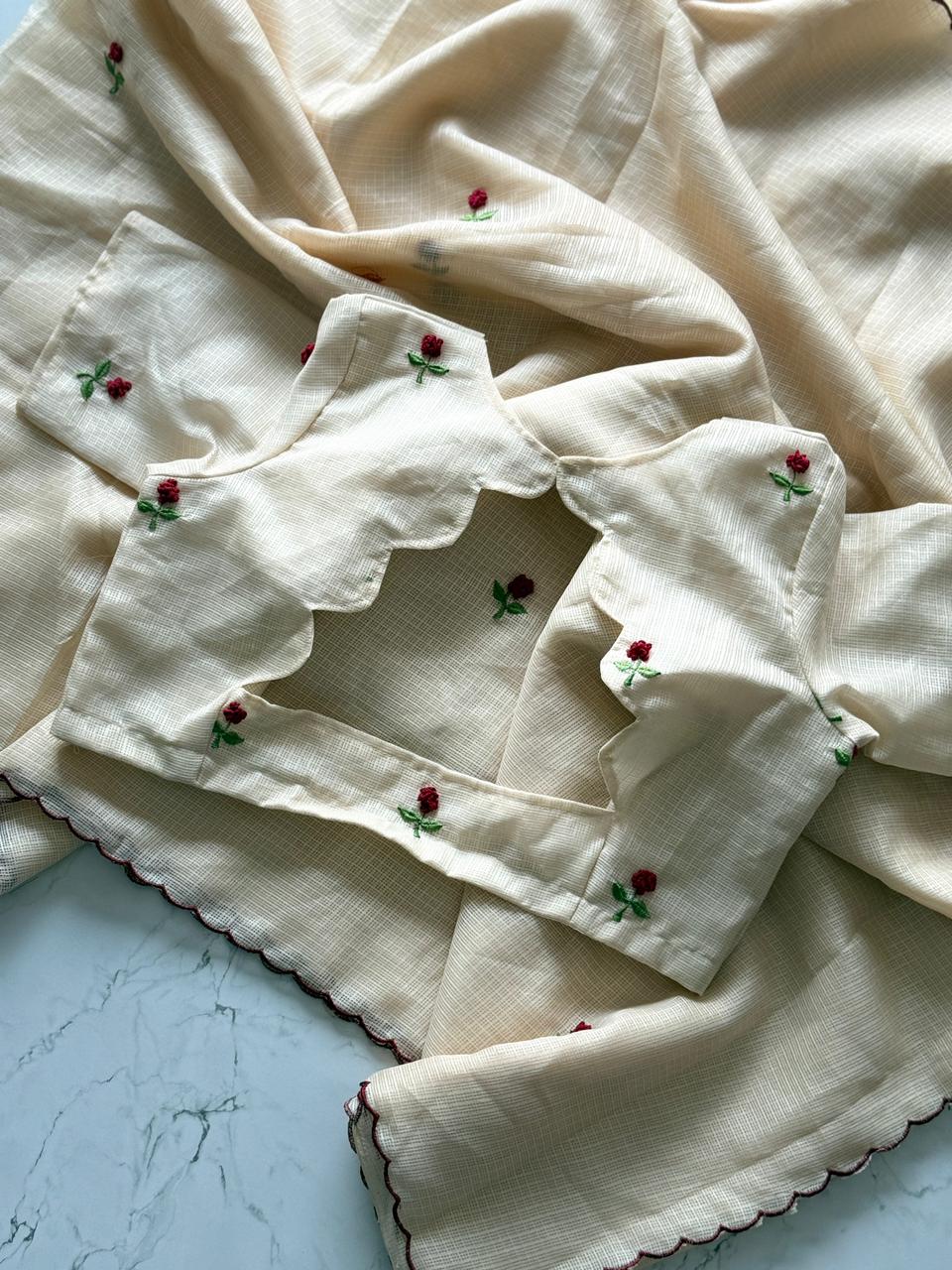 Cream Textured Saree with Rose Embroidery & Scallop Edge SD-1088