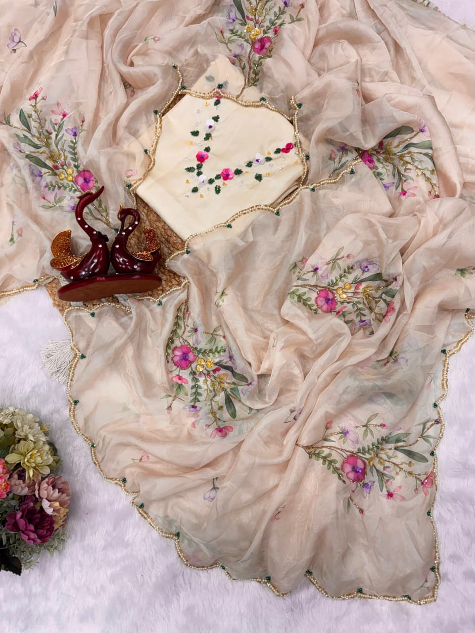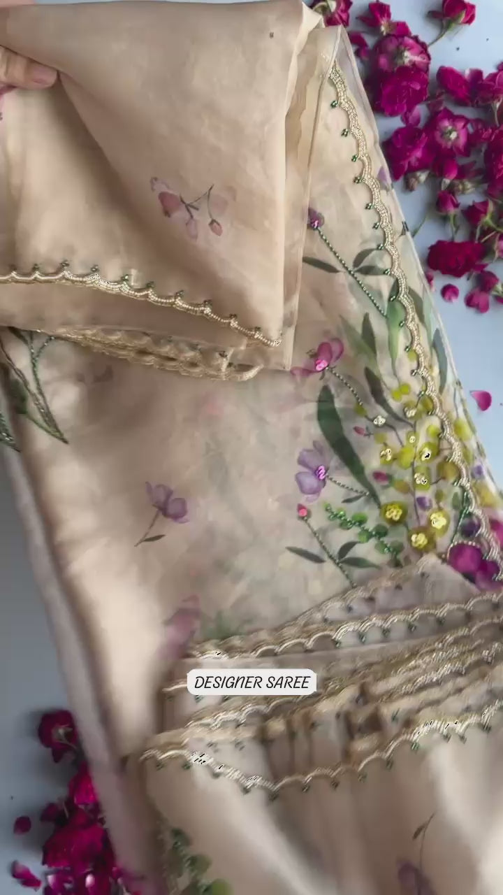 Exuding grace and sophistication, this floral-printed organza saree blends classic beauty with modern elegance. Each delicate petal in the design tells a story of timeless charm, making it the perfect choice for those who appreciate both tradition and contemporary style.