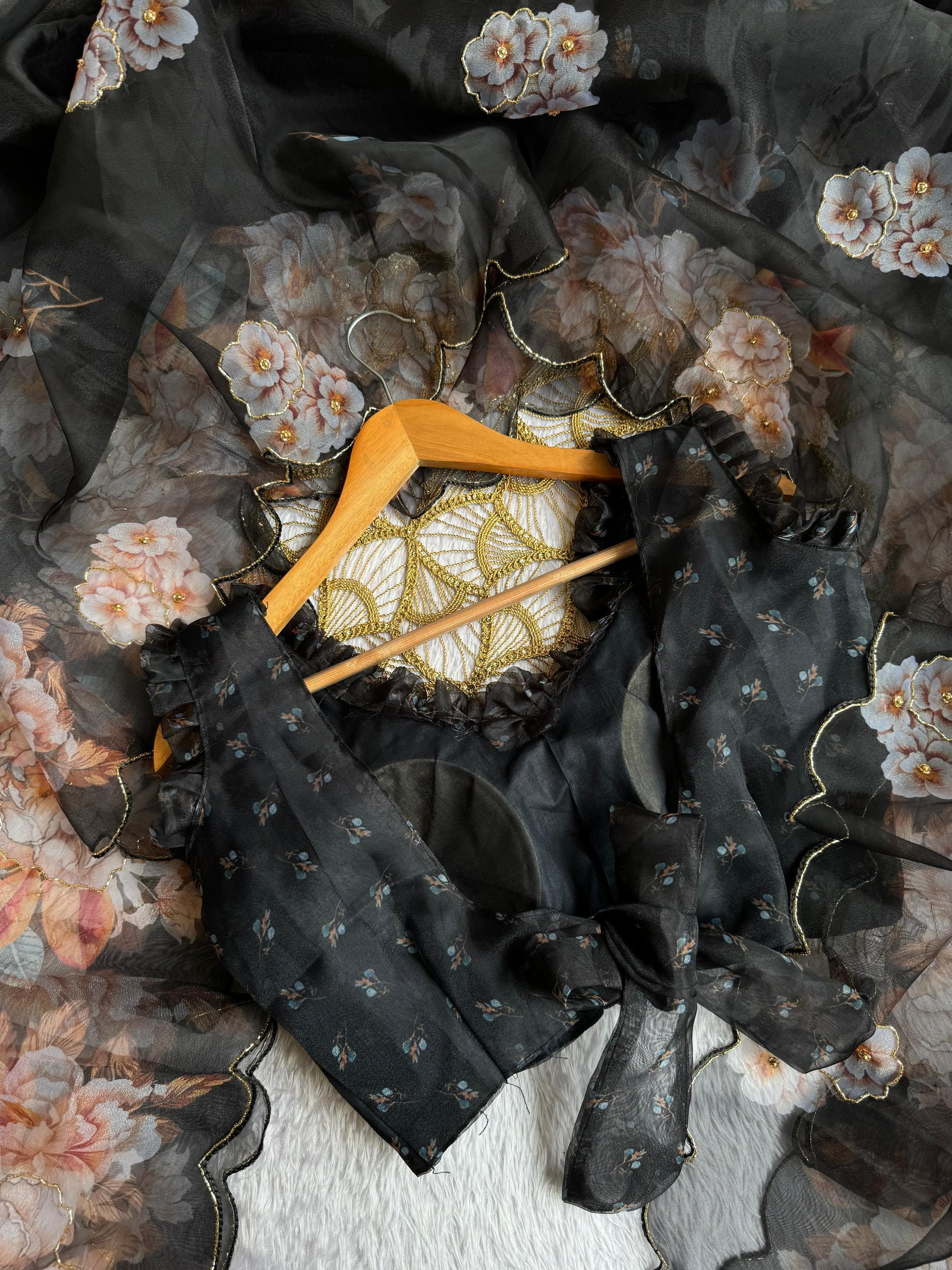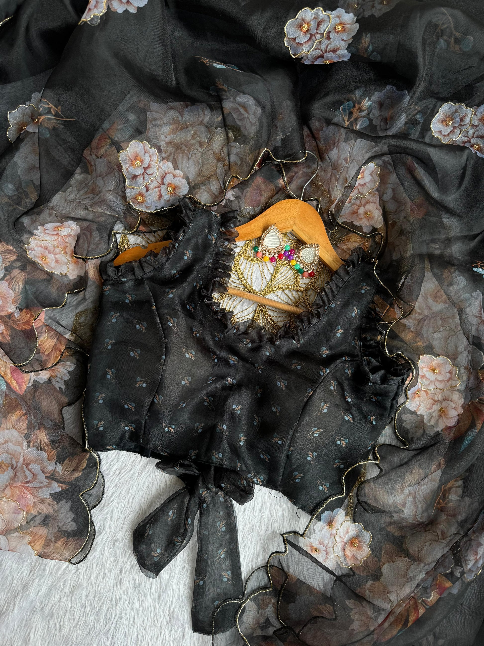 Elegant Black Floral Organza Saree with Designer Ruffle Blousen SD-1070