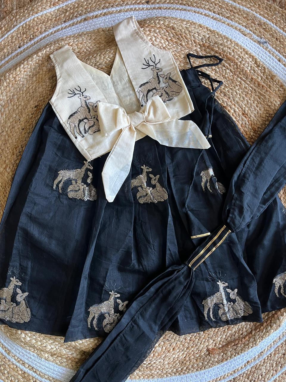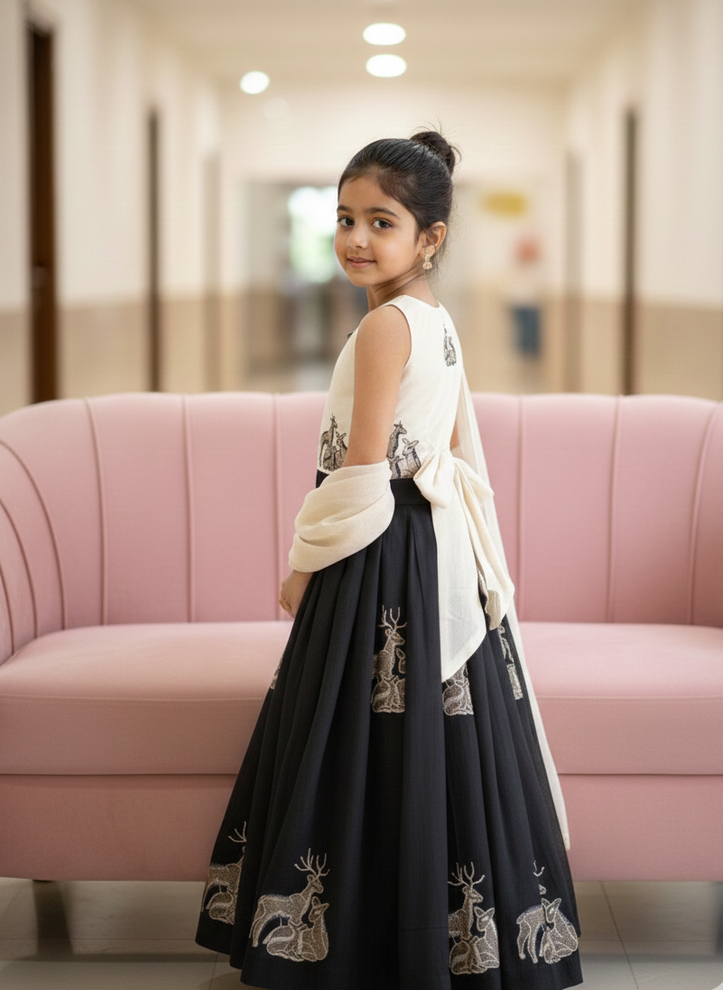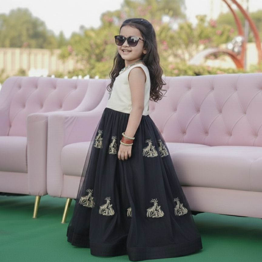 Dress your little princess in timeless elegance with this beautifully designed kids lehenga choli set. Featuring a cream sleeveless blouse paired with a Black flared lehenga, this outfit is adorned with delicate gold-toned motifs that add a graceful ethnic charm. Crafted from soft, lightweight fabric, it ensures maximum comfort while allowing easy movement for kids.