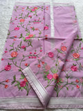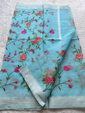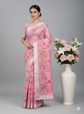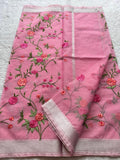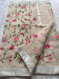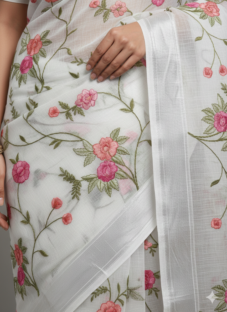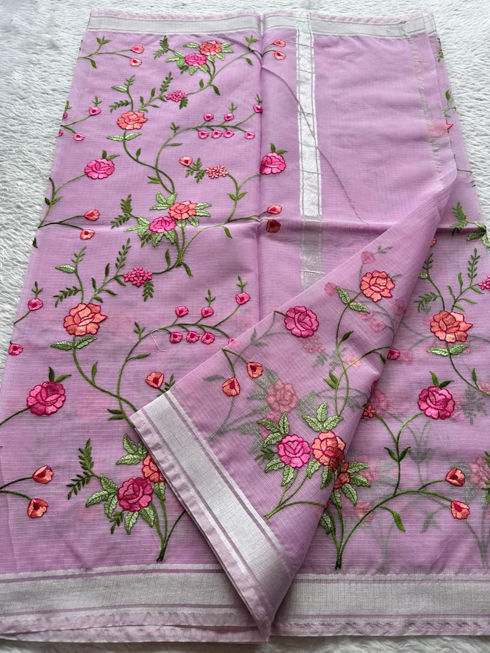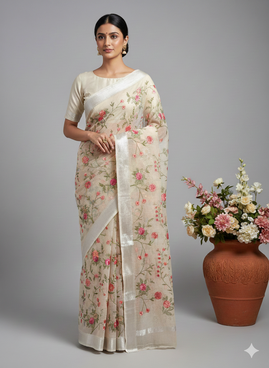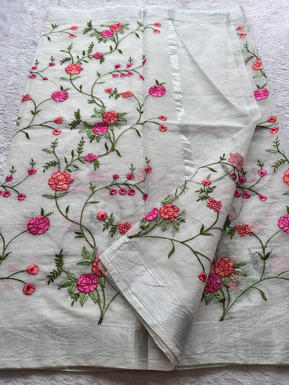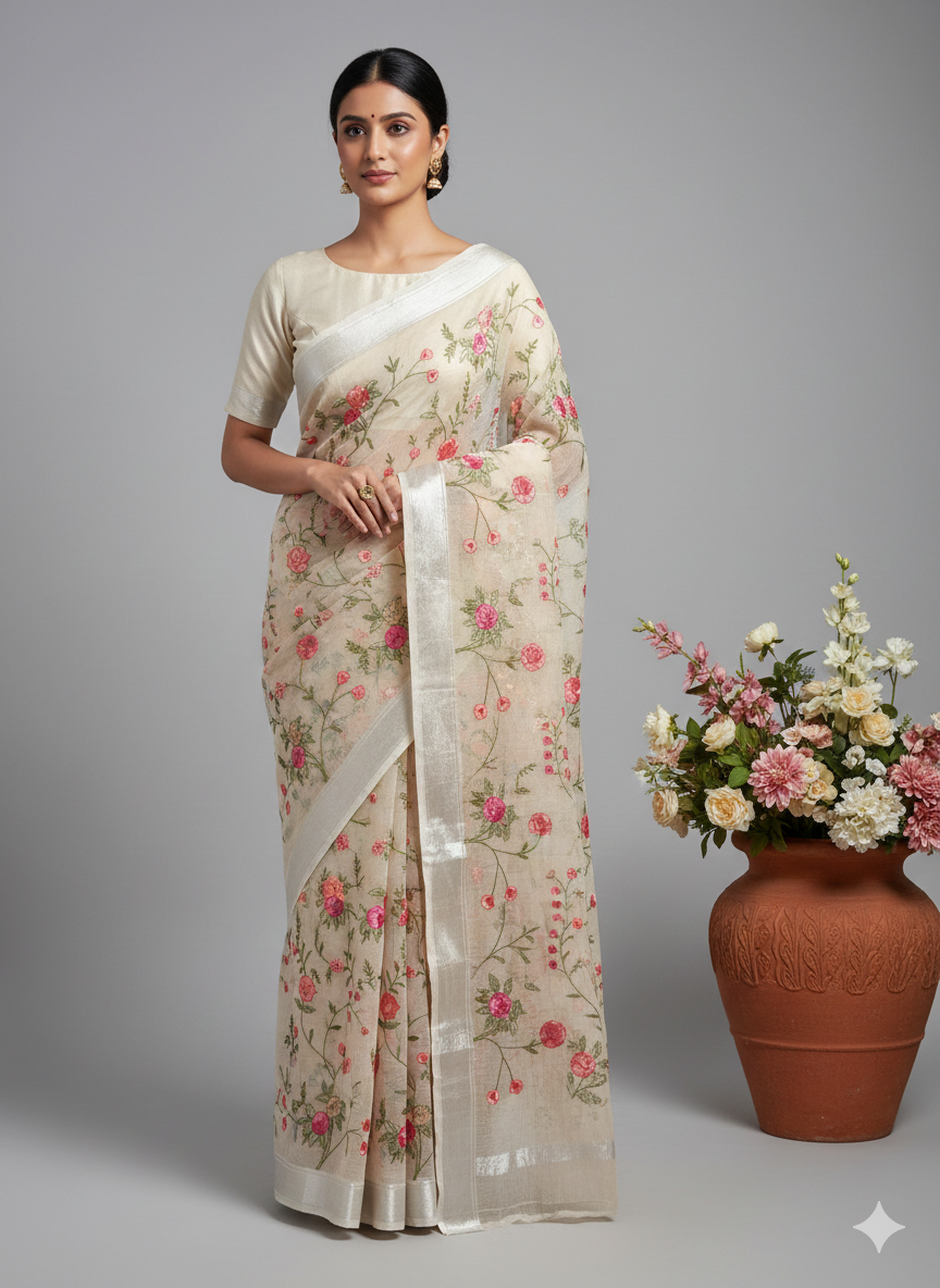 Hand-Embroidered Ivory Kota Doriya Saree with Pink Rose Motifs S-0025