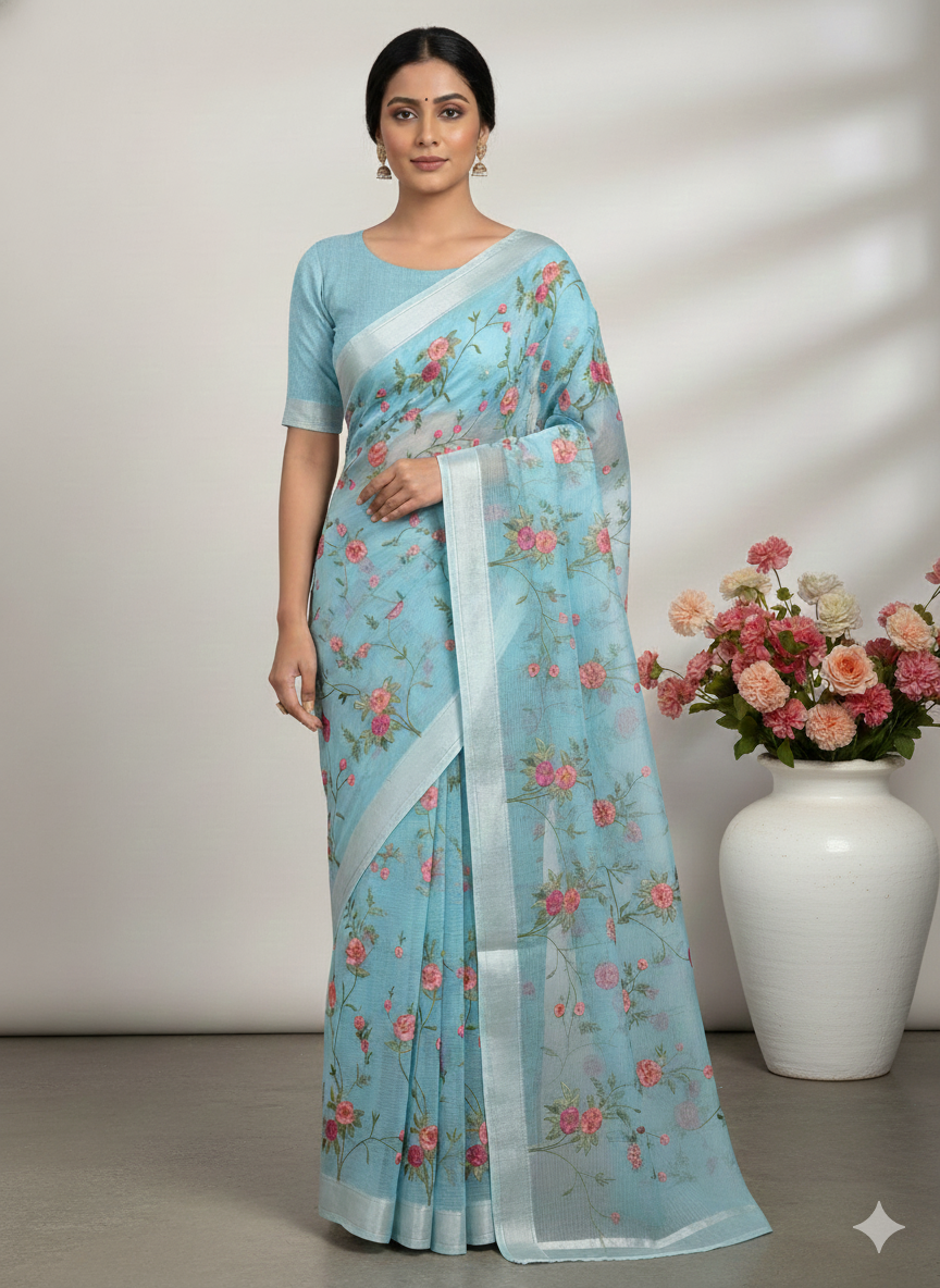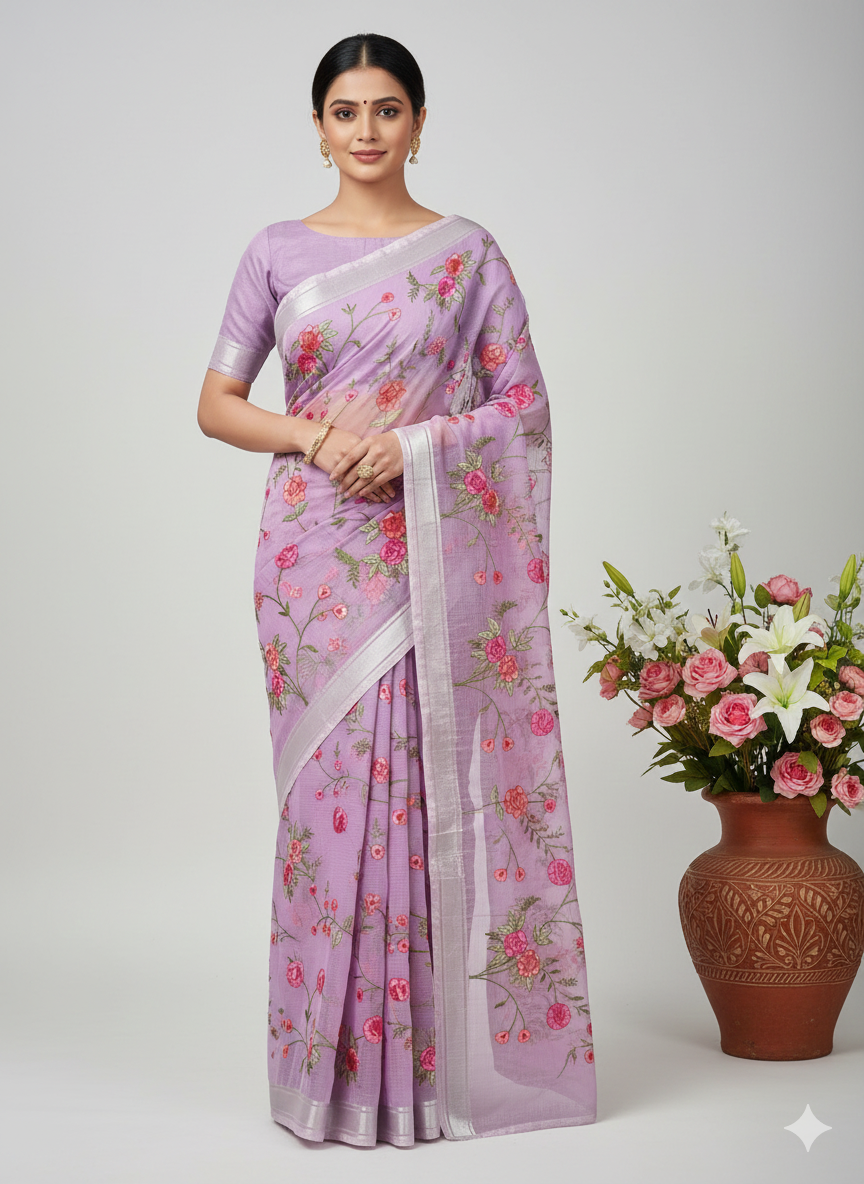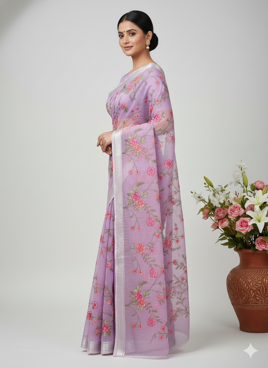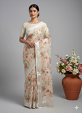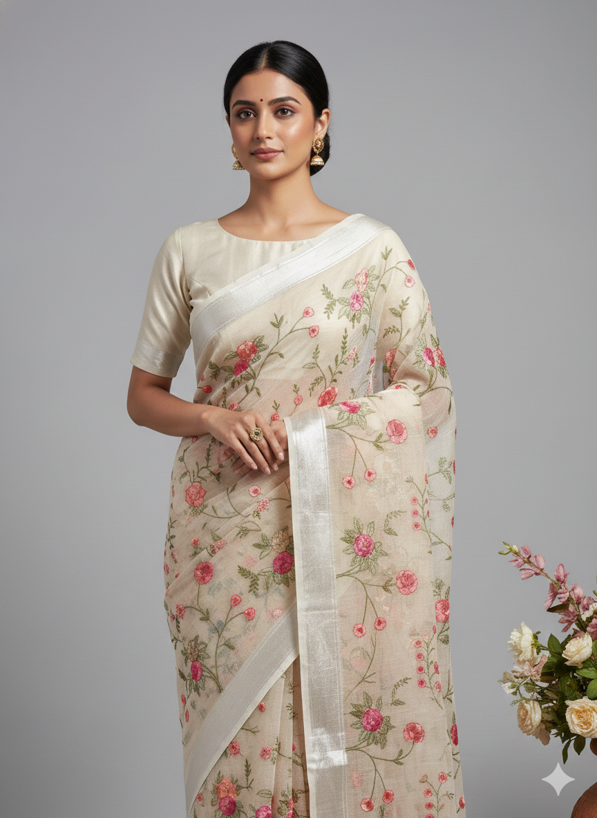 Elevate your ethnic wardrobe with this elegant ivory Kota Doriya saree, beautifully adorned with vibrant pink and peach floral embroidery. Crafted with fine detailing, the saree features intricate threadwork vines and blooming rose motifs, giving it a fresh, graceful, and feminine appeal.