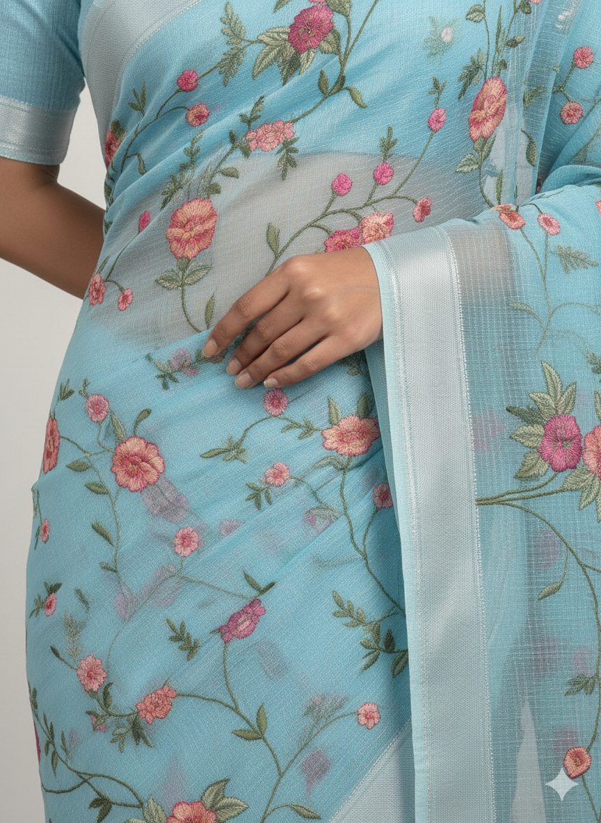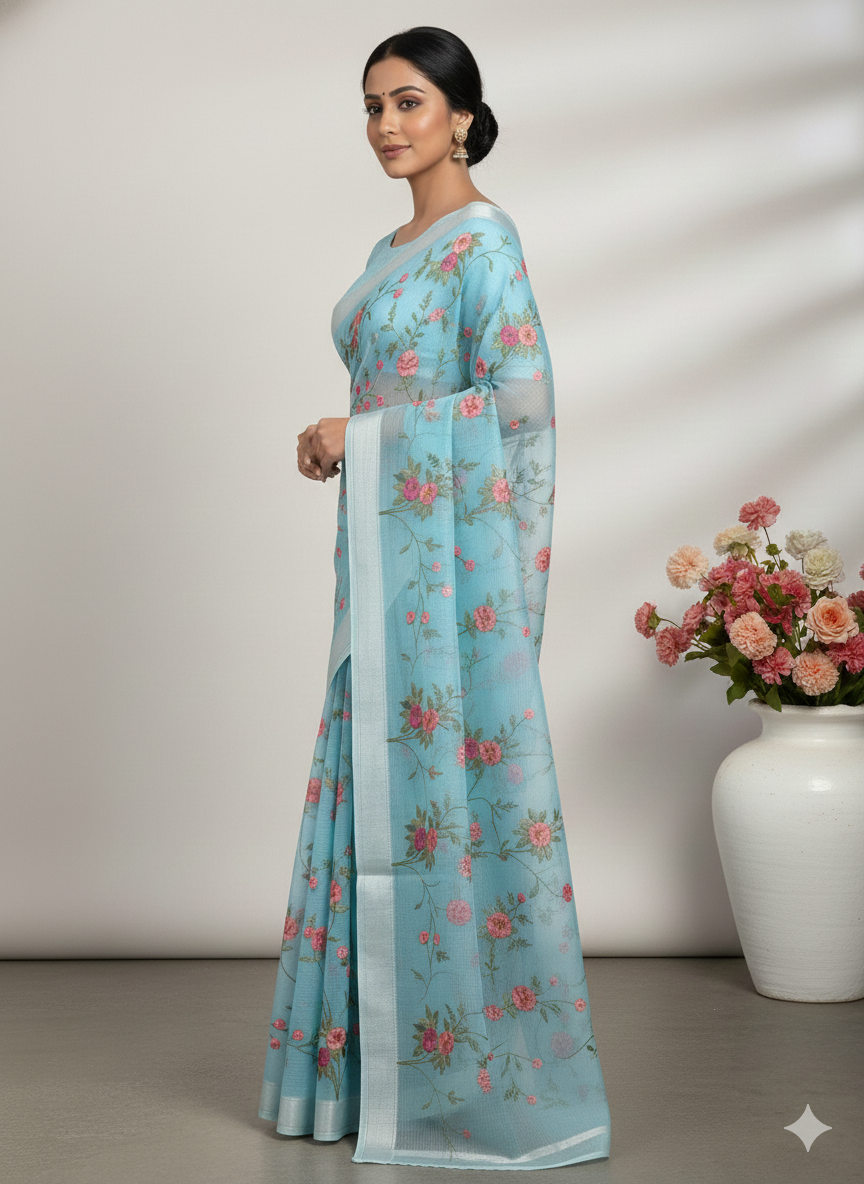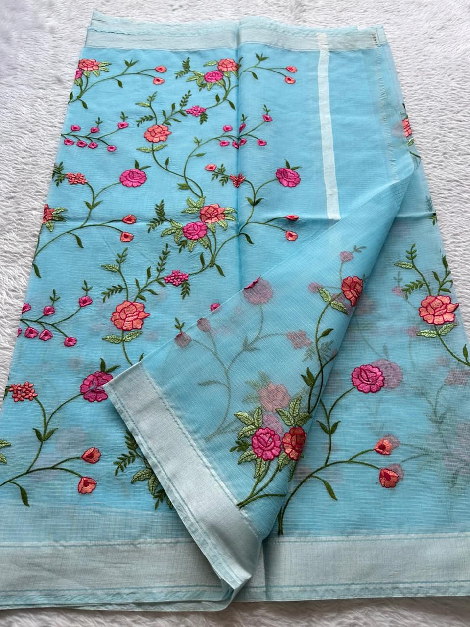 Elevate your ethnic wardrobe with this elegant ivory Kota Doriya saree, beautifully adorned with vibrant pink and peach floral embroidery. Crafted with fine detailing, the saree features intricate threadwork vines and blooming rose motifs, giving it a fresh, graceful, and feminine appeal.