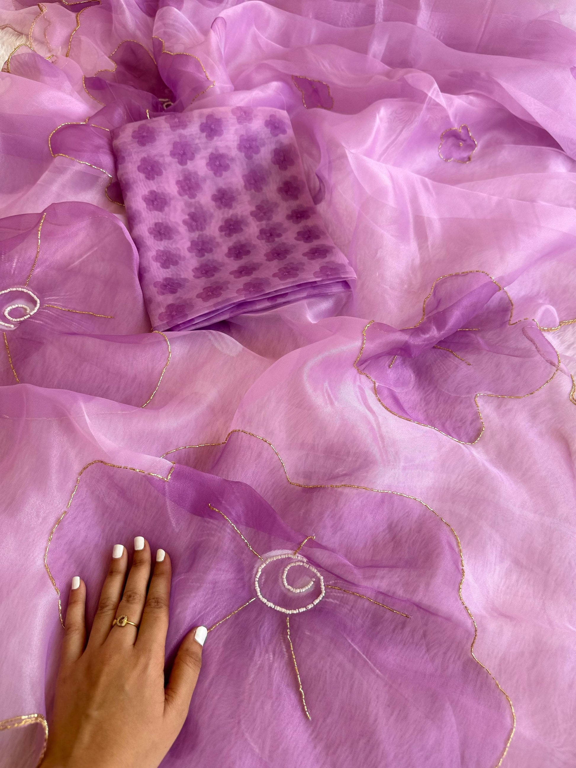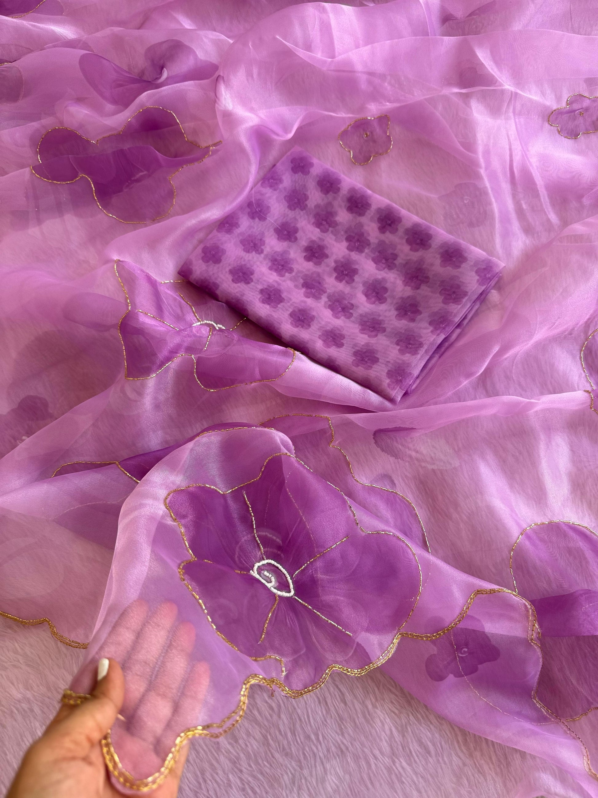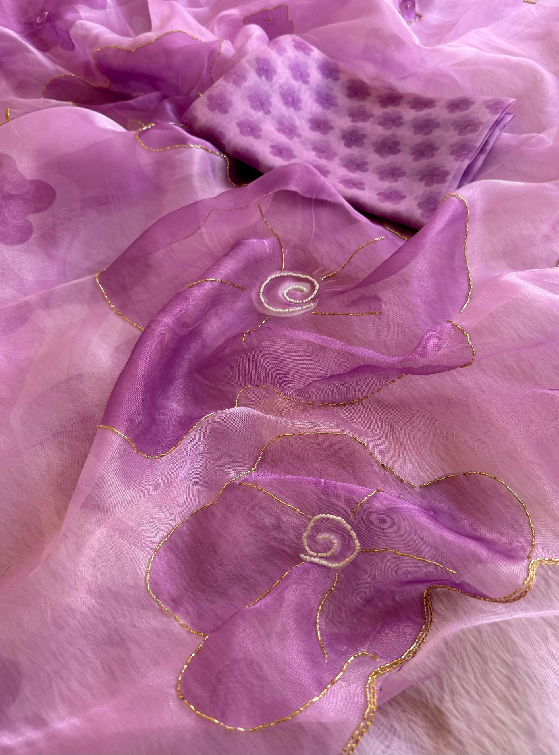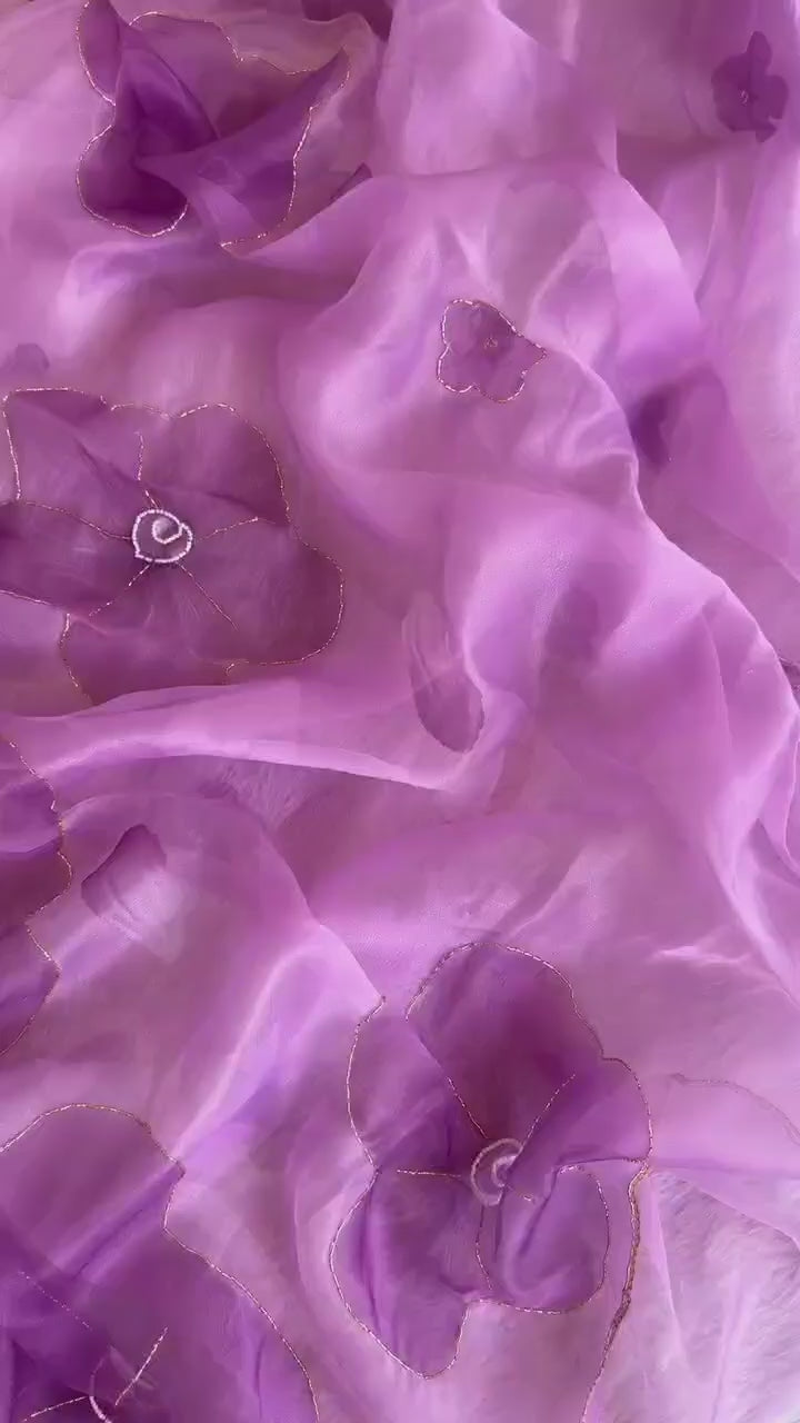 Step into elegance with this breathtaking Lavender Ombre Organza Saree. Designed for the modern woman who loves a touch of traditional craftsmanship, this saree features a seamless transition from a deep, rich mauve to a soft, ethereal lilac.
