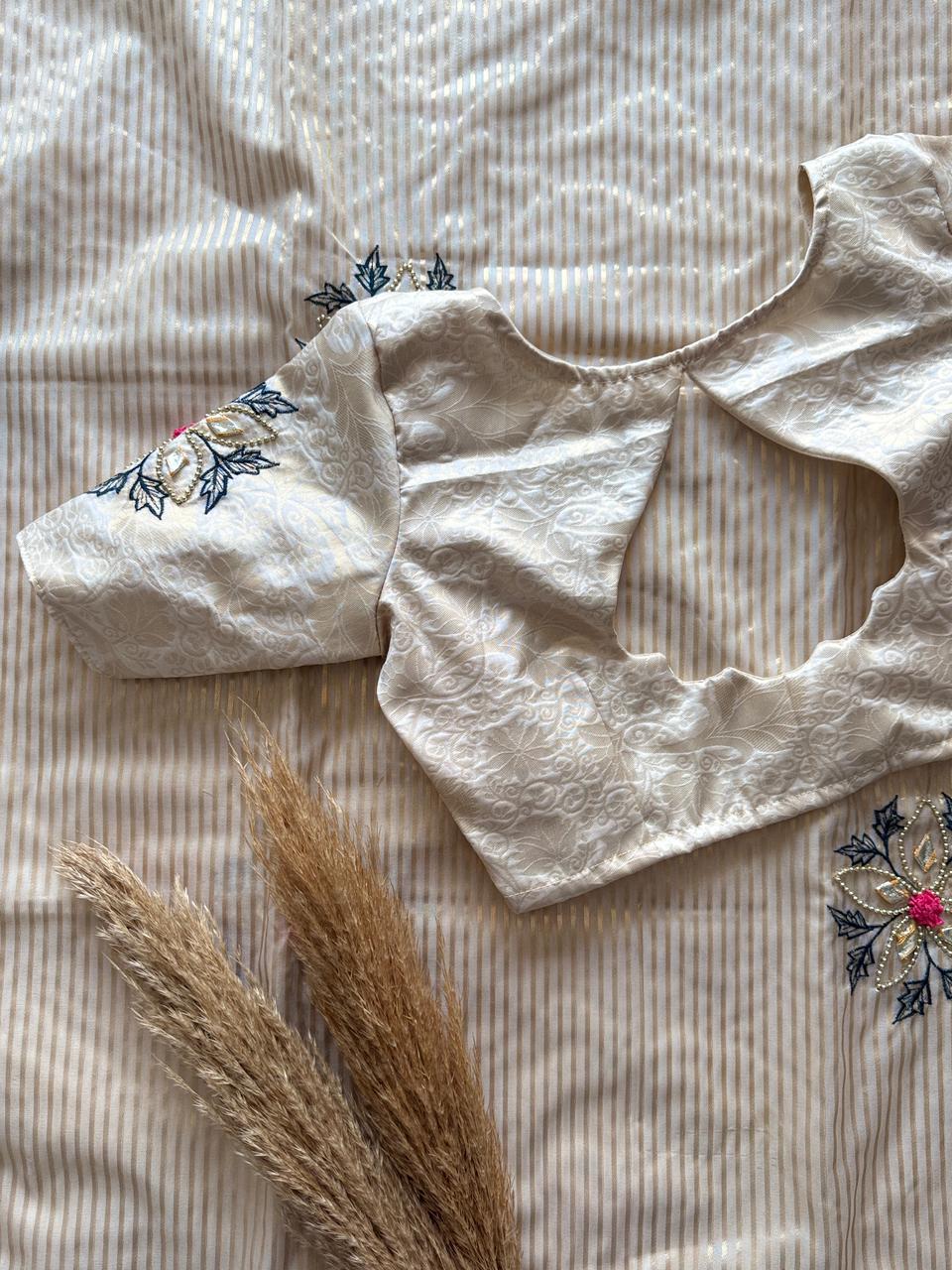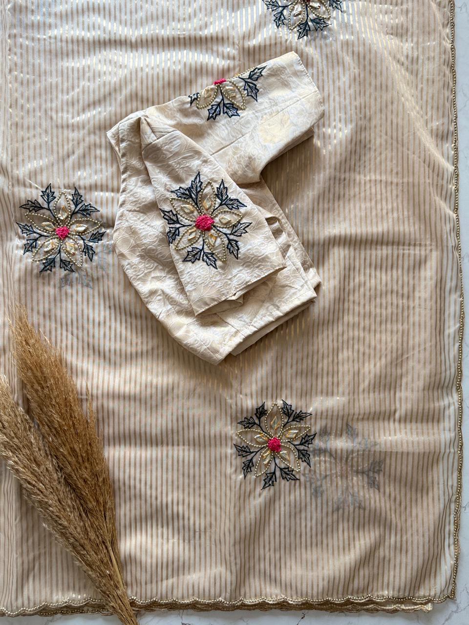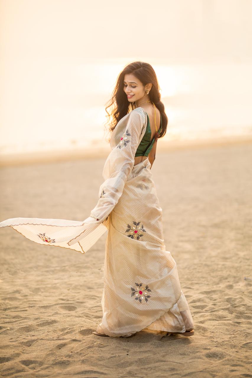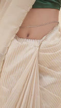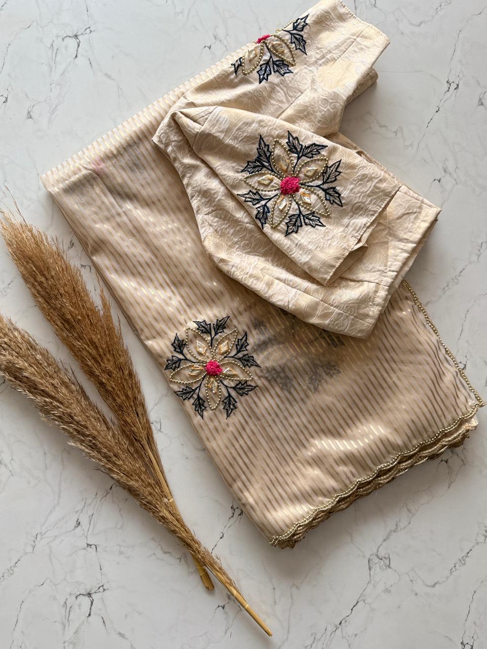 Embrace timeless elegance with this stunning ivory saree, designed with subtle golden stripes that add a refined touch of luxury. The soft, flowing drape enhances your natural grace, while the delicate scallop border brings a hint of sophistication. Paired with a rich Blouse Jeqacrd with Sleeves butta work , this saree creates a beautiful contrast perfect for festive occasions, photoshoots, family functions, or elegant evening events. A lightweight, comfortable, and effortlessly classy choice for every modern woman who loves minimal yet premium fashion.