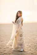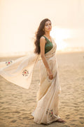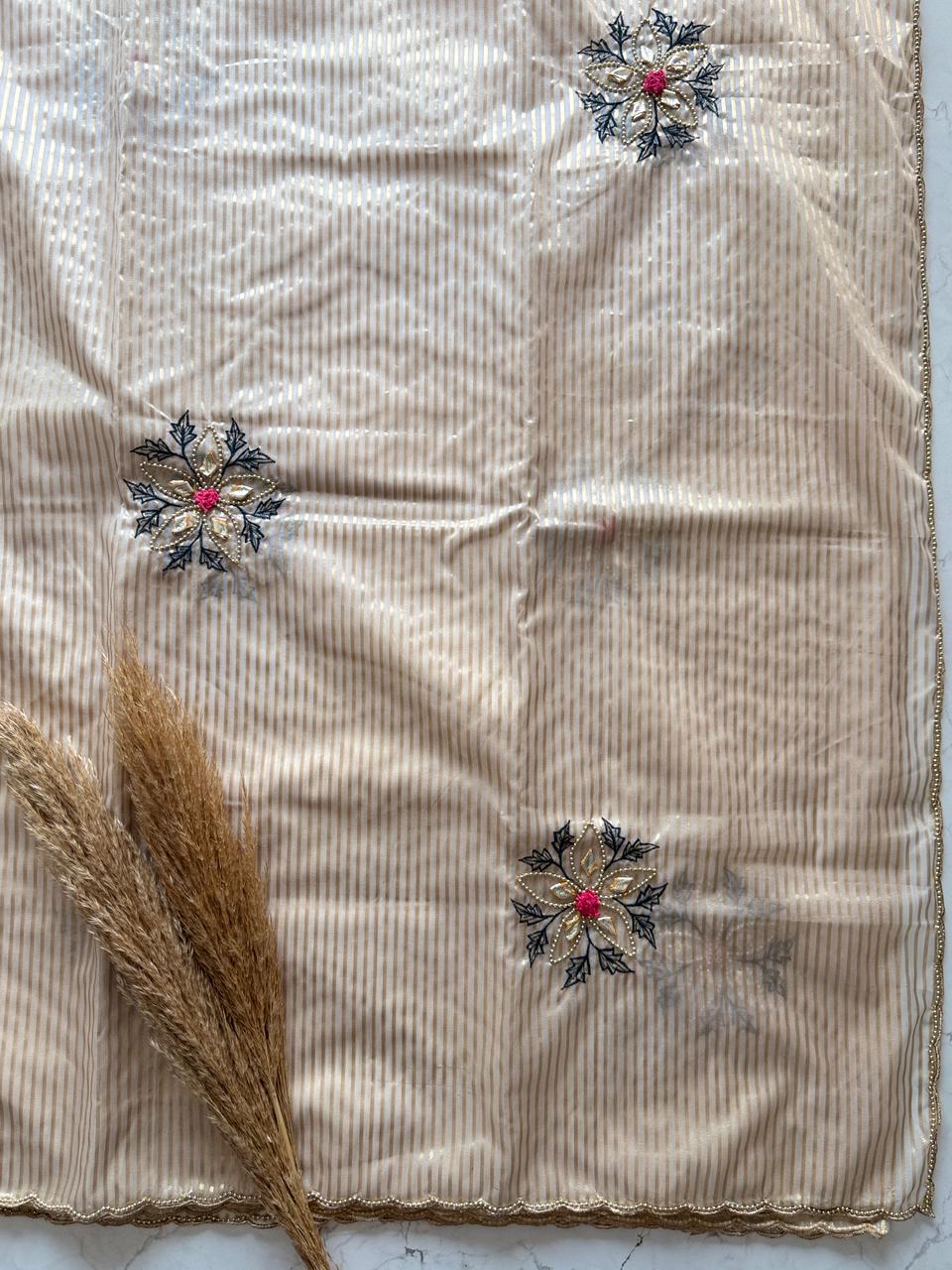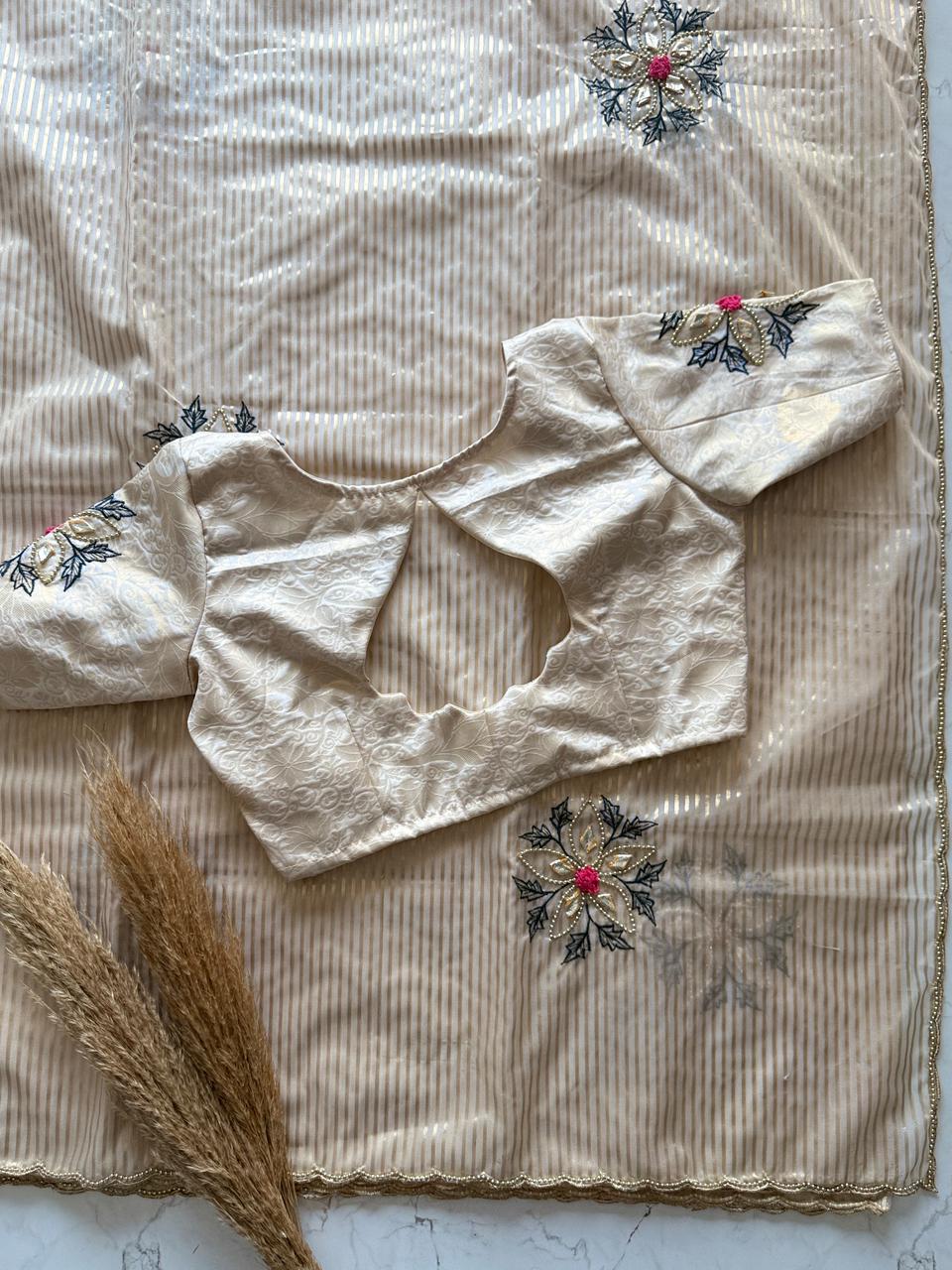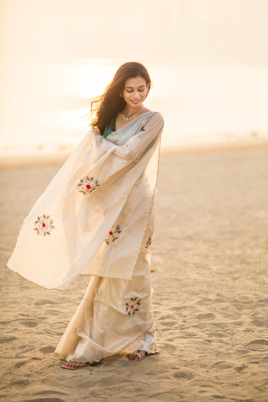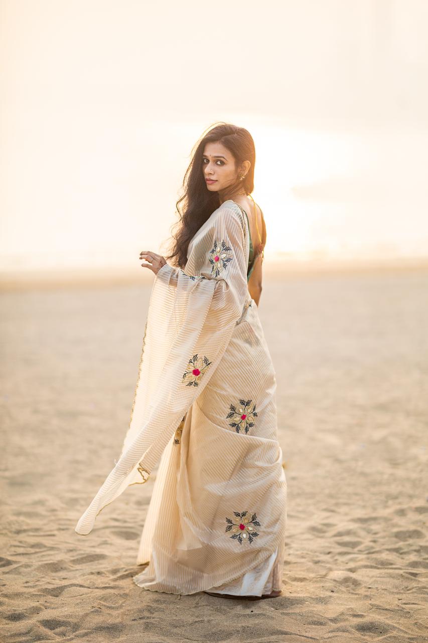Embrace timeless elegance with this stunning ivory saree, designed with subtle golden stripes that add a refined touch of luxury. The soft, flowing drape enhances your natural grace, while the delicate scallop border brings a hint of sophistication. Paired with a rich Blouse Jeqacrd with Sleeves butta work , this saree creates a beautiful contrast perfect for festive occasions, photoshoots, family functions, or elegant evening events. A lightweight, comfortable, and effortlessly classy choice for every modern woman who loves minimal yet premium fashion.