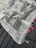 Pure soft Off-white silk organza saree with Lucknowi & silver zari touch up embroidered all over saree with tassels (zalar) in pallu border contrast silk matching blouse