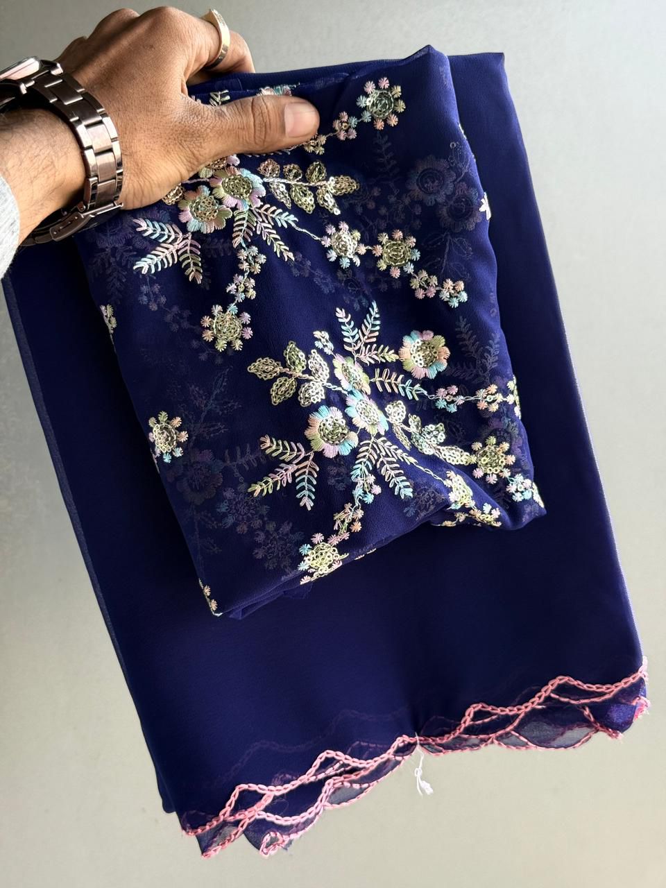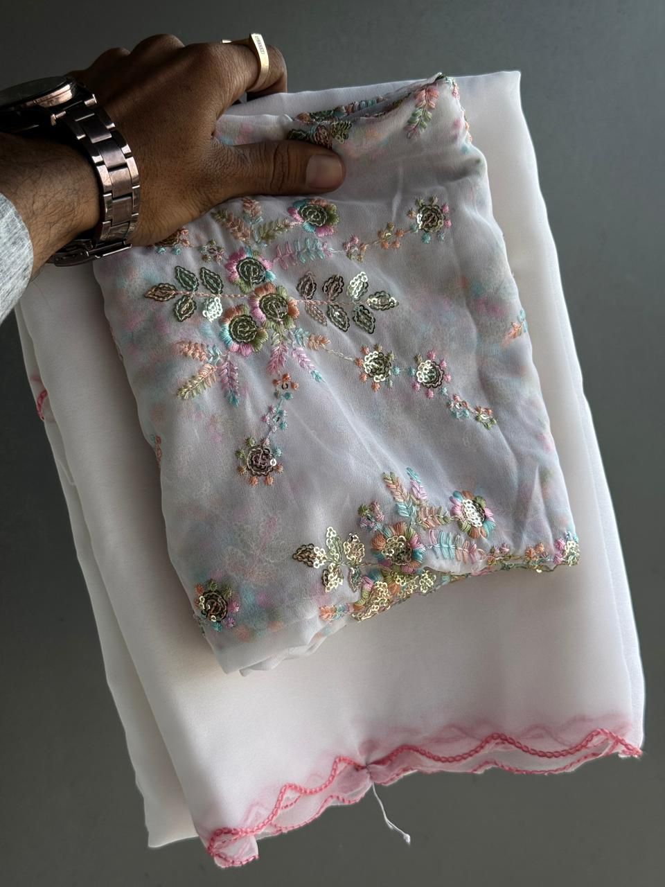 Celebrate in style with our latest Georgette collection. These sarees feature a stunning blend of multicolored floral embroidery and shimmering sequins that catch the light beautifully. The borders are finished with a delicate scalloped edge, adding a touch of feminine charm to the overall look.