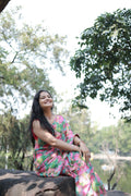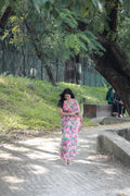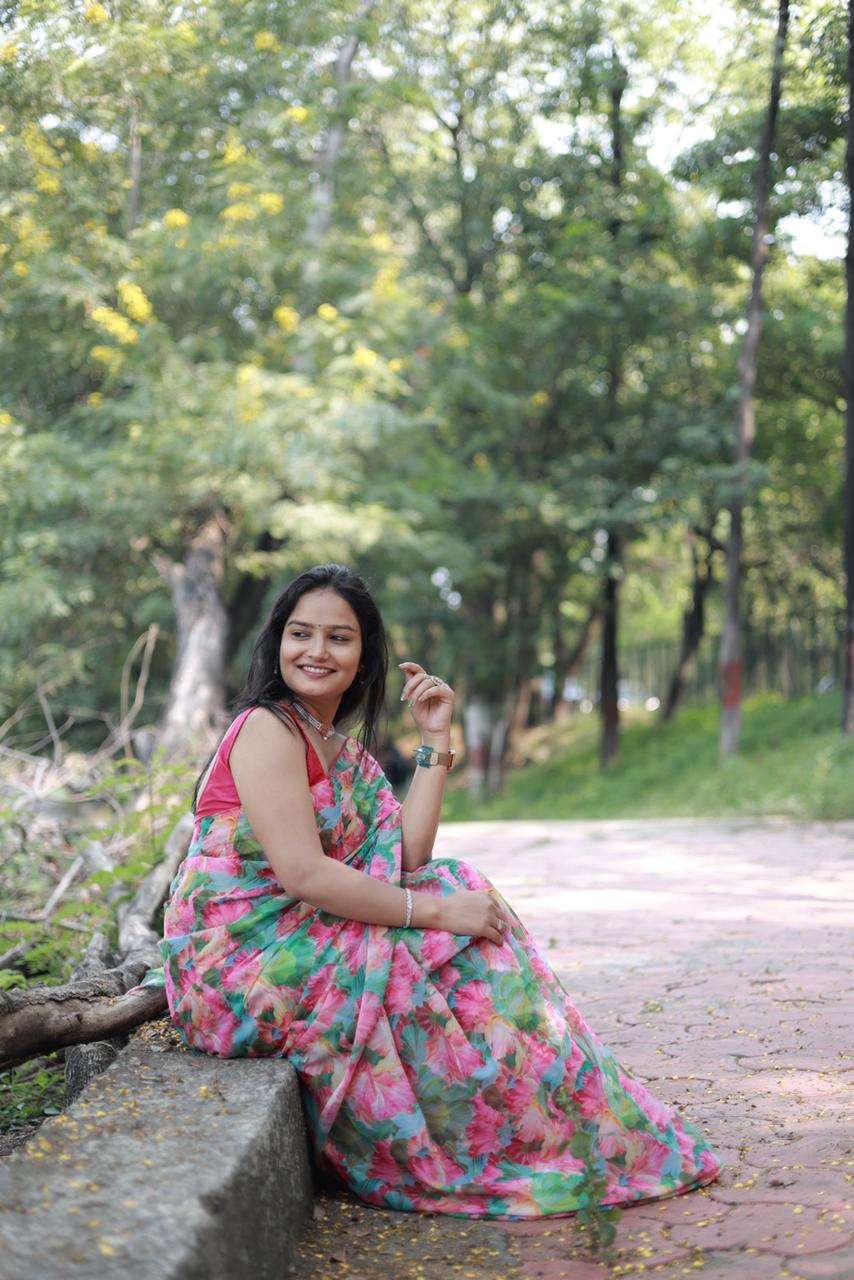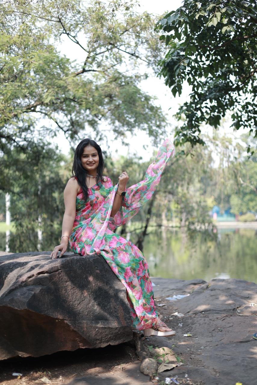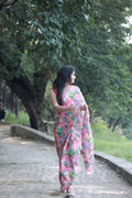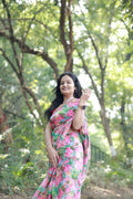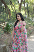 floral chiffon saree, featuring a vibrant mix of pink and green hues with beautifully detailed floral prints. Designed for the modern woman who loves tradition with a touch of freshness, this saree offers both comfort and elegance.