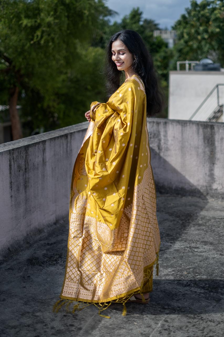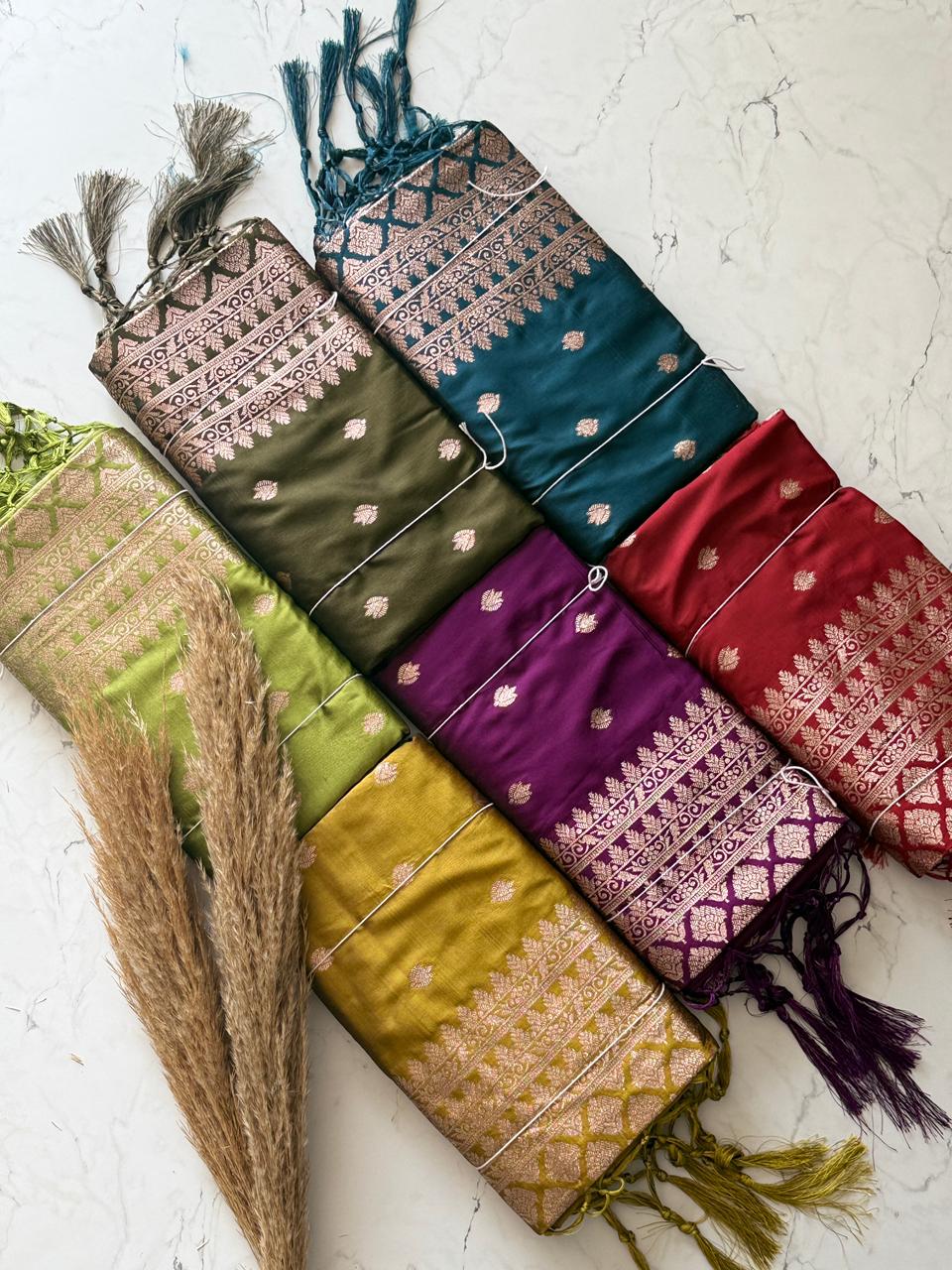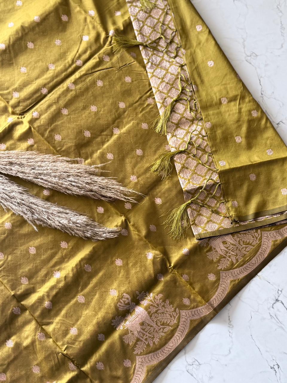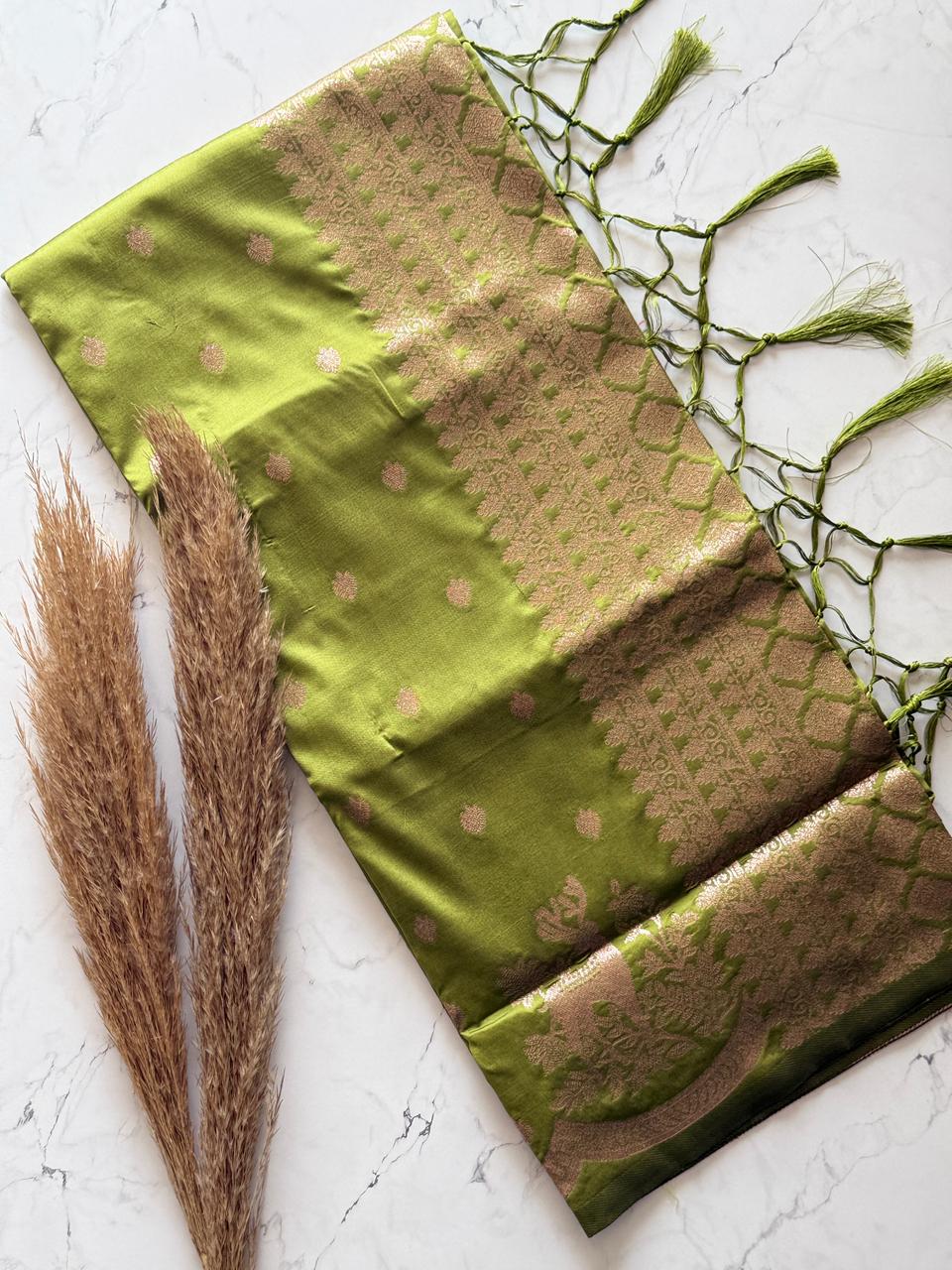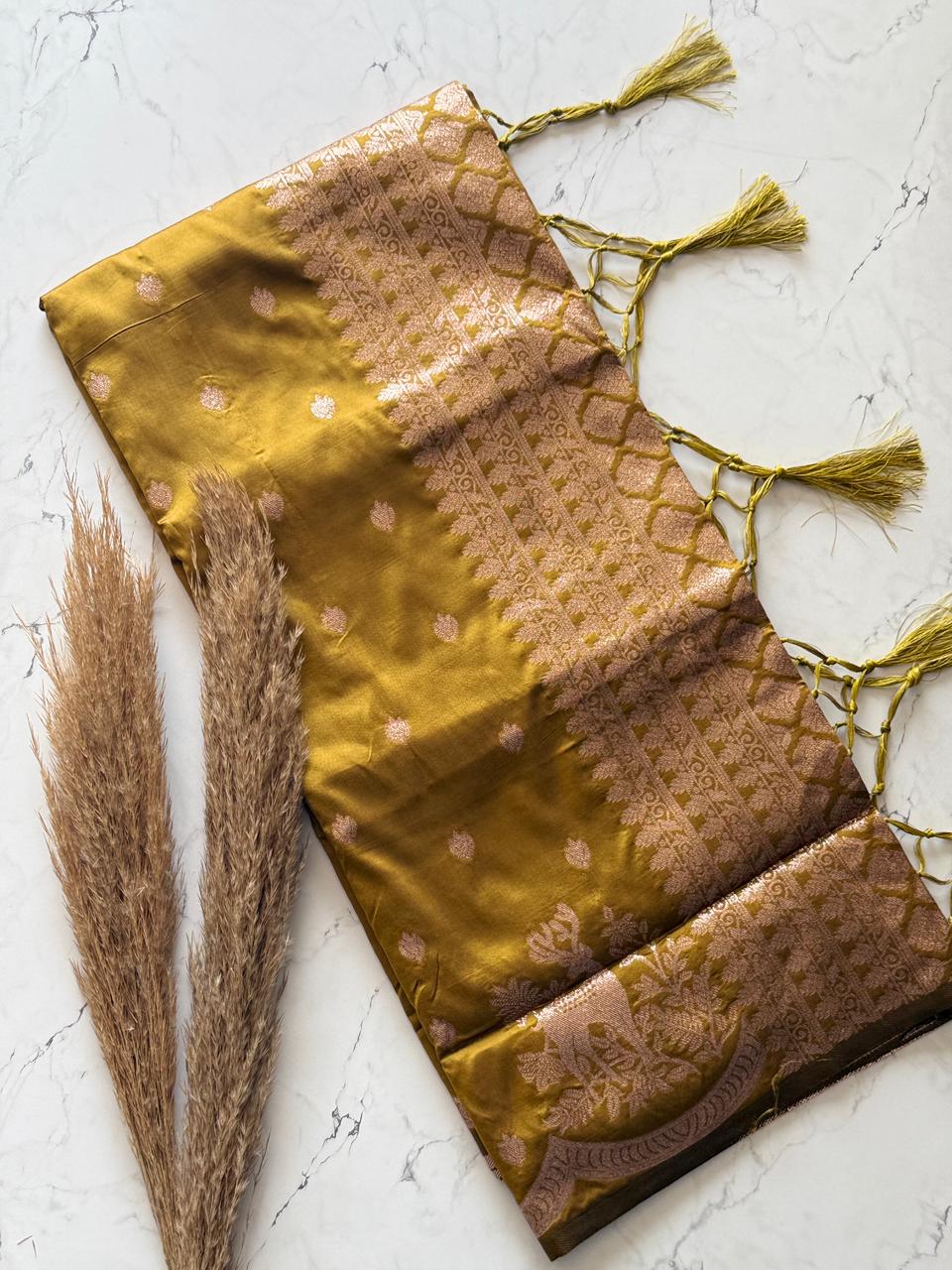 Premium Banarasi Zari Silk Saree, crafted to bring royal charm to every occasion. This saree features rich golden zari weaving, intricate butta motifs, and a beautifully designed scalloped pallu with traditional patterns. The luxurious silk blend fabric drapes gracefully, giving you a perfect festive and wedding-ready look.