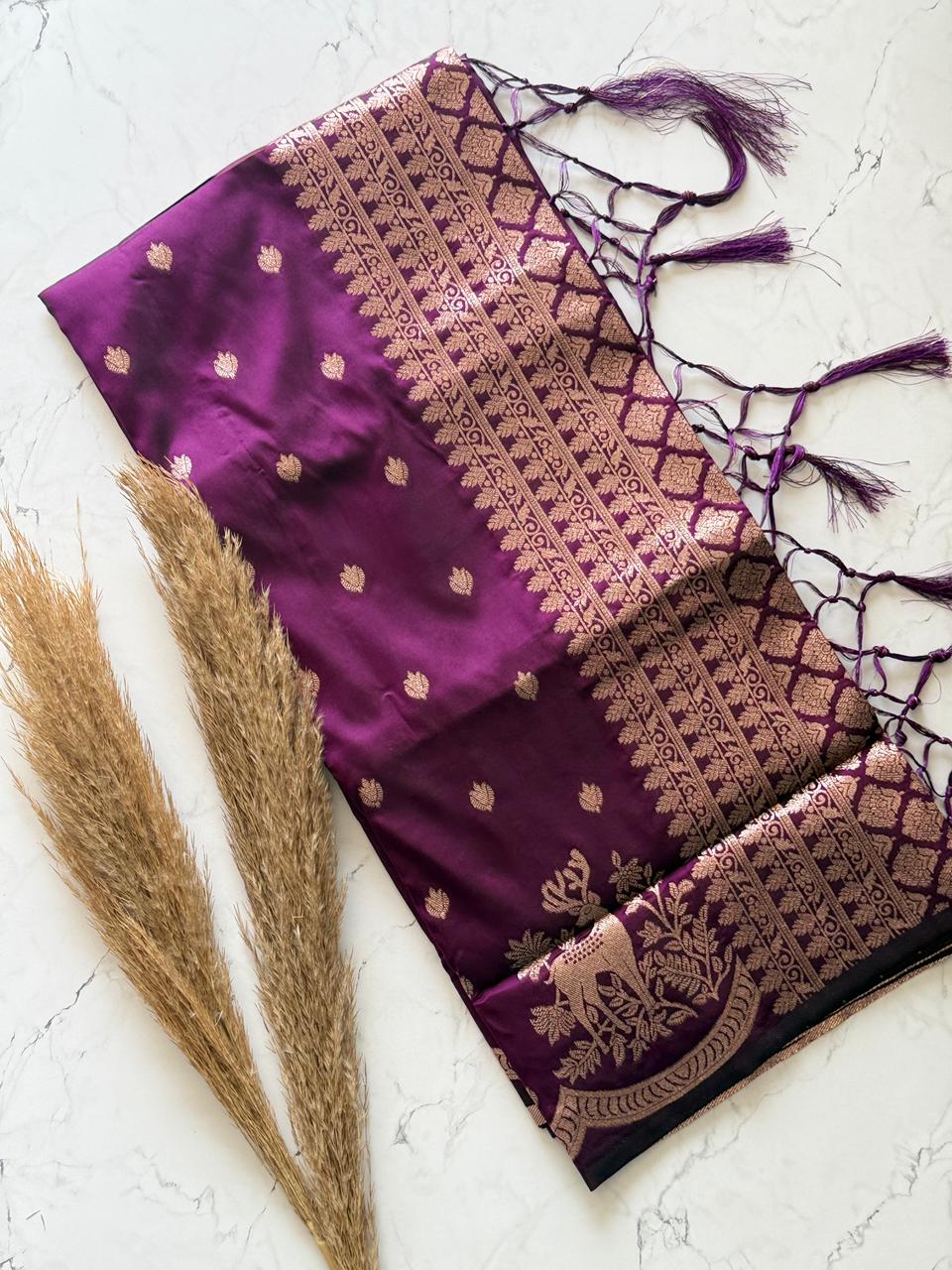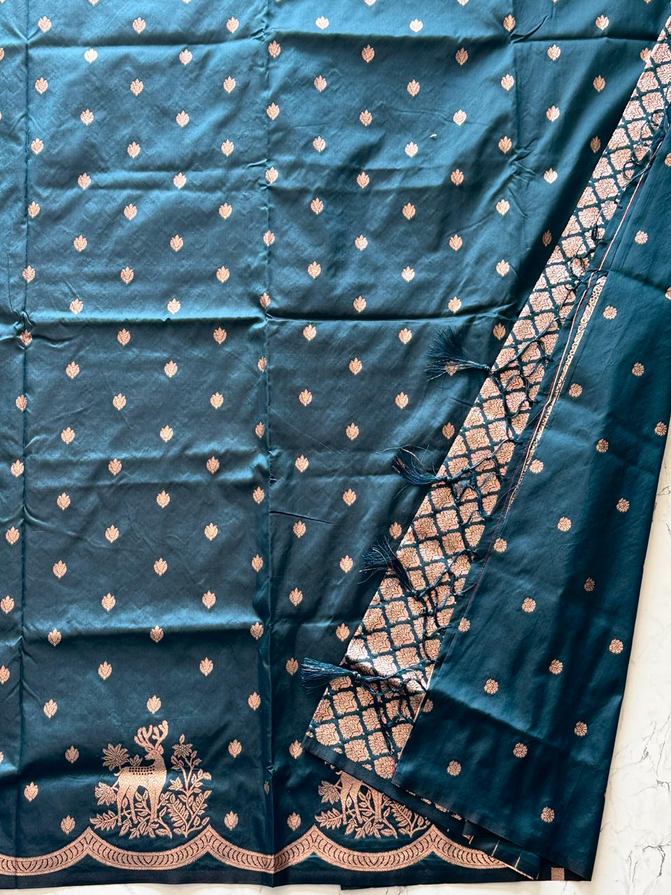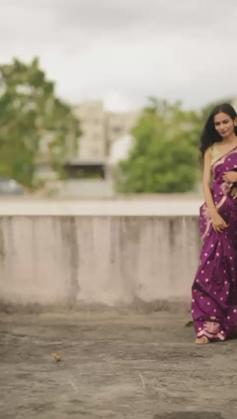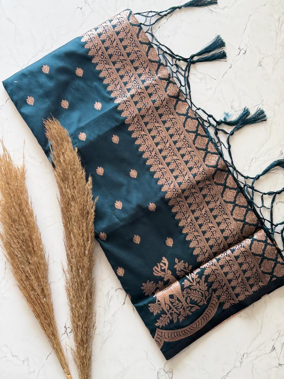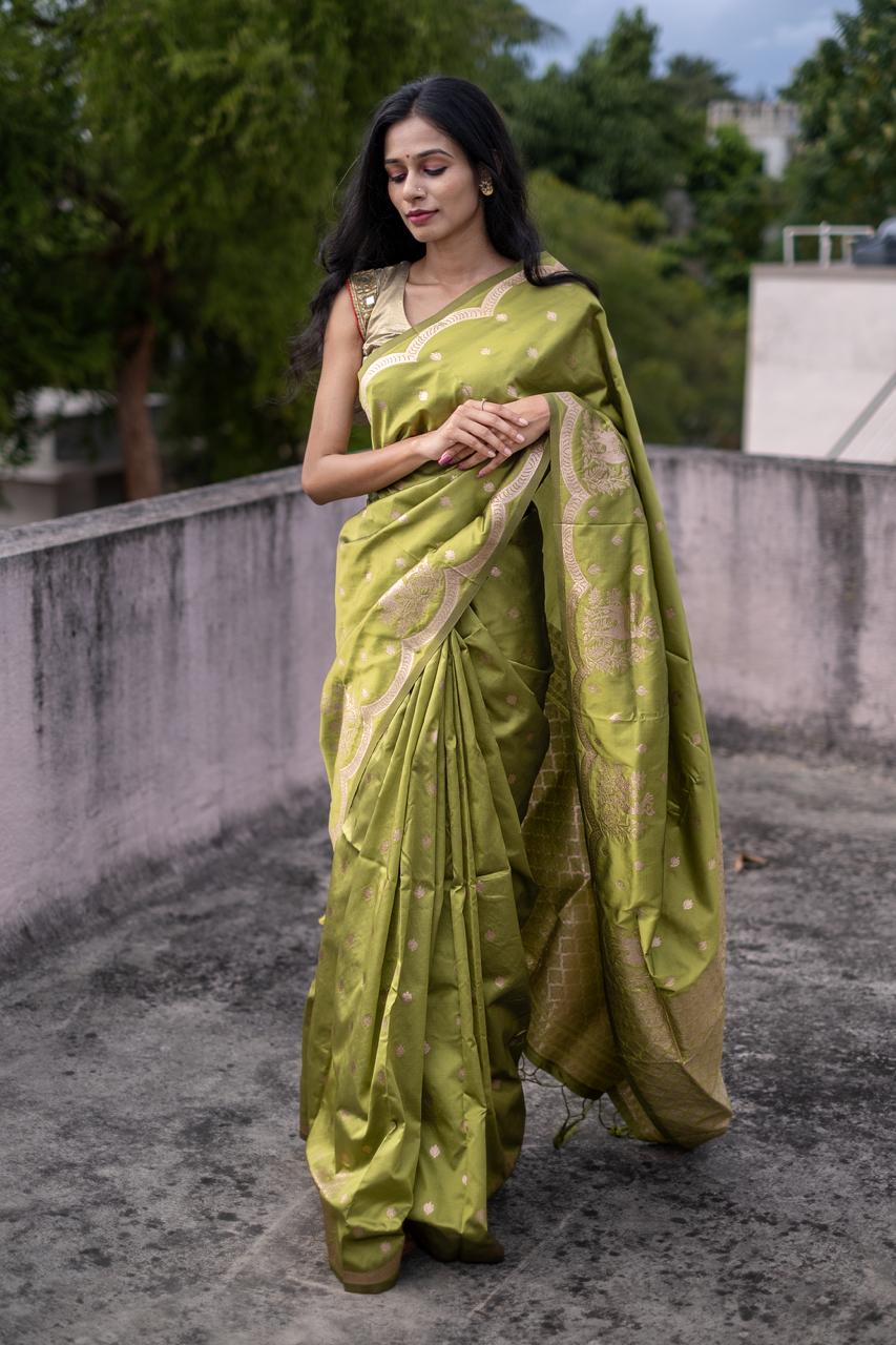 Premium Banarasi Zari Silk Saree, crafted to bring royal charm to every occasion. This saree features rich golden zari weaving, intricate butta motifs, and a beautifully designed scalloped pallu with traditional patterns. The luxurious silk blend fabric drapes gracefully, giving you a perfect festive and wedding-ready look.