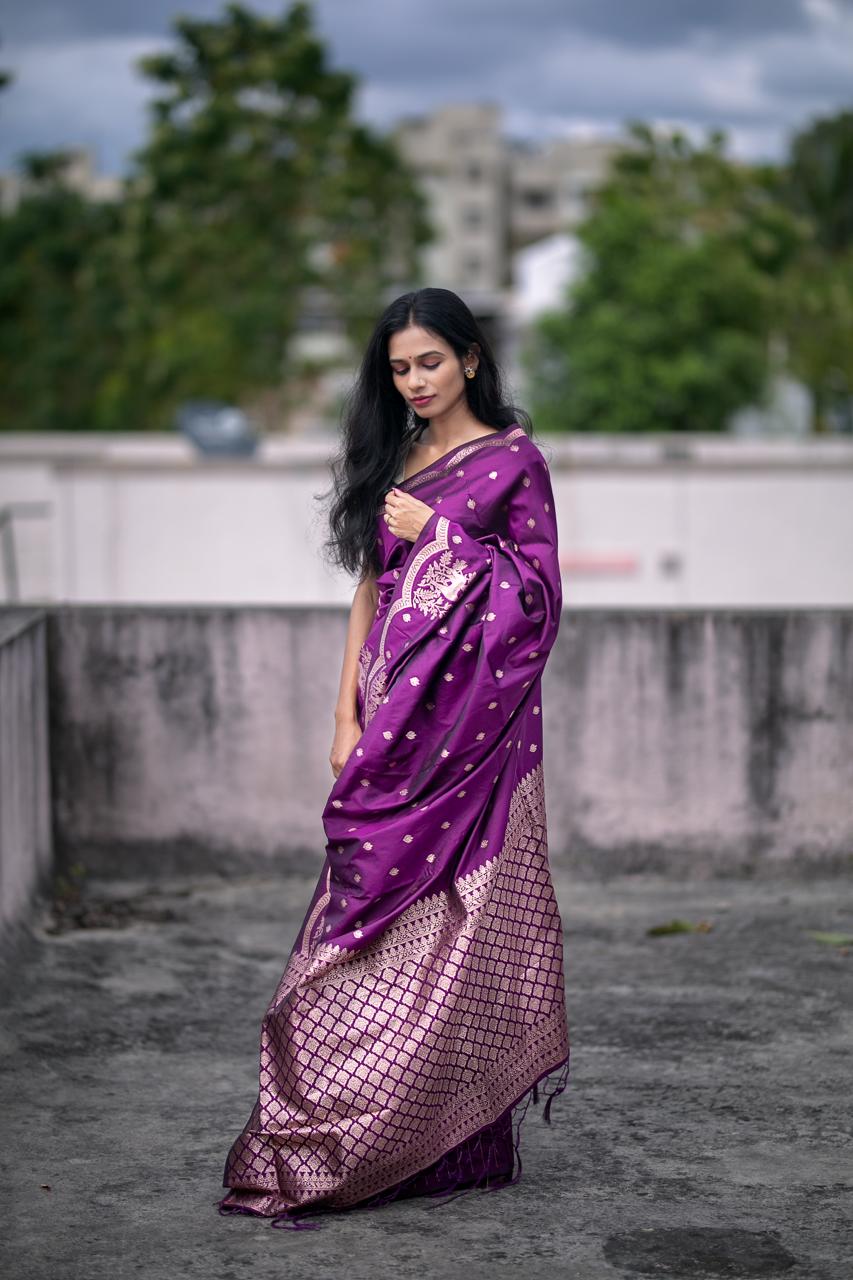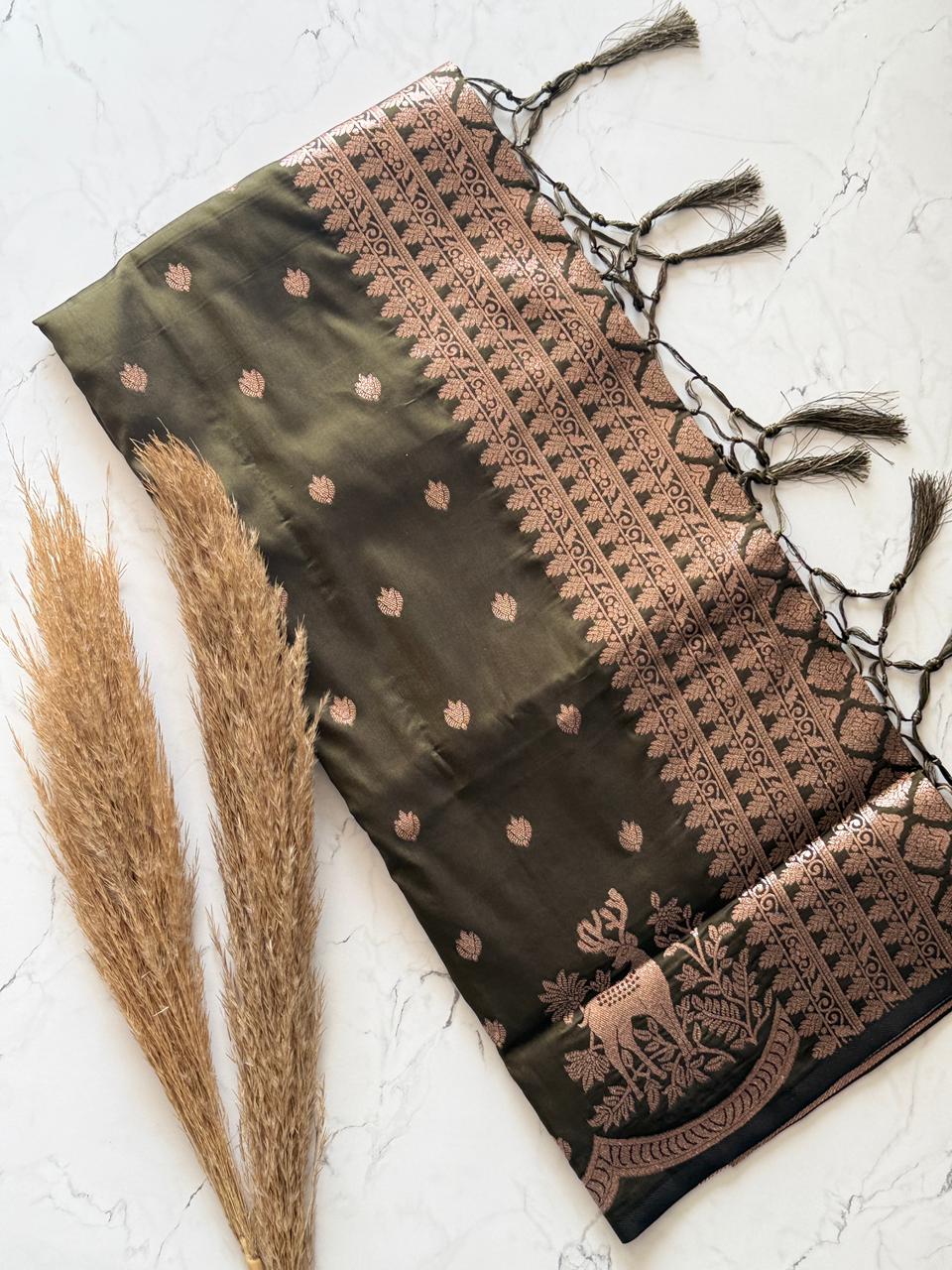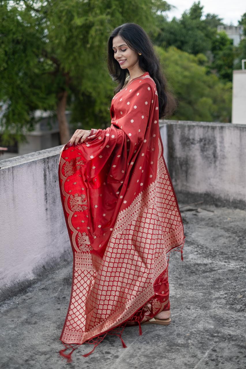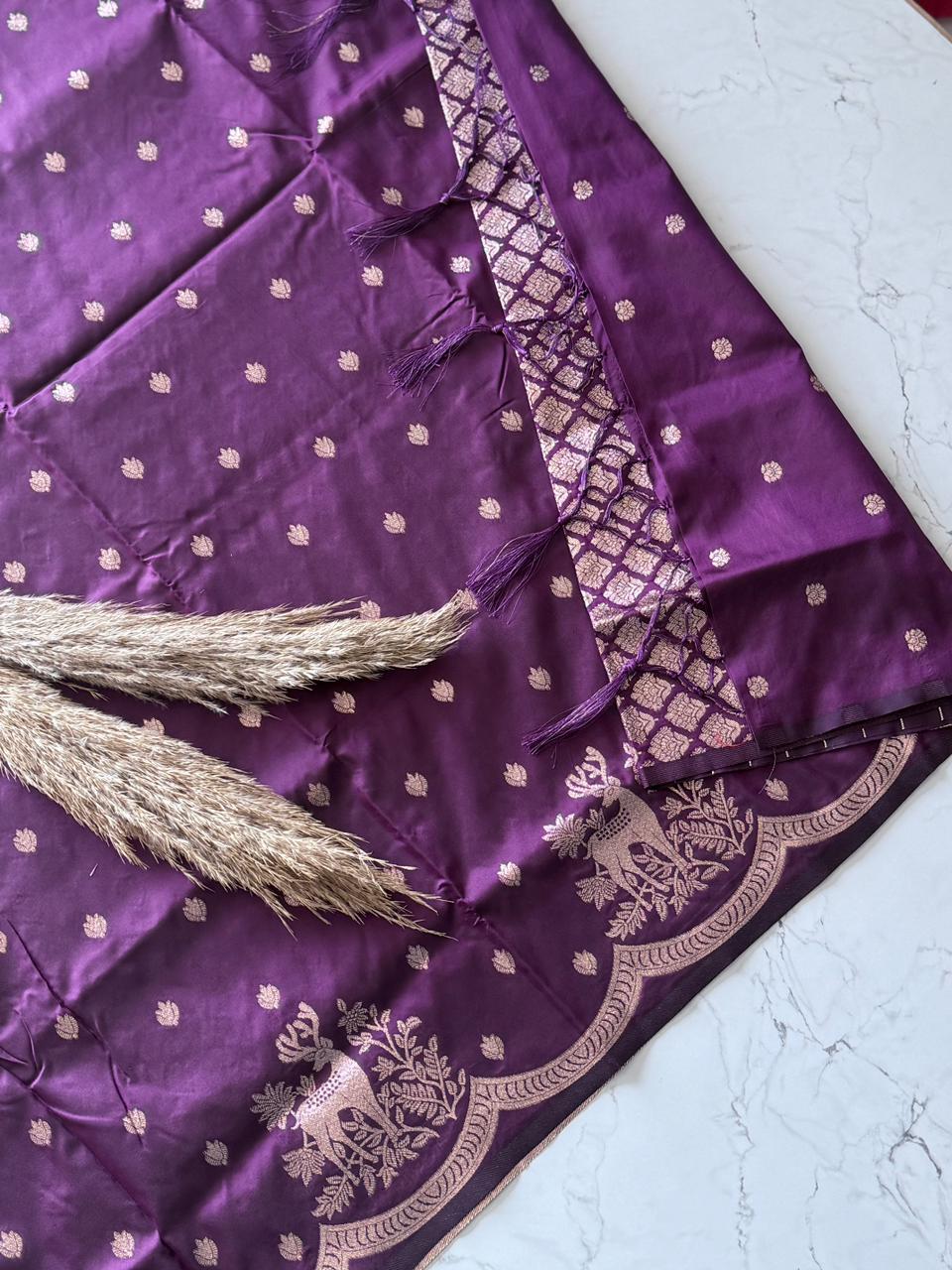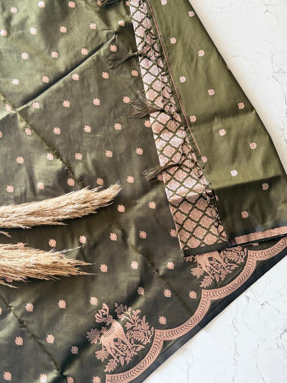 Premium Banarasi Zari Silk Saree, crafted to bring royal charm to every occasion. This saree features rich golden zari weaving, intricate butta motifs, and a beautifully designed scalloped pallu with traditional patterns. The luxurious silk blend fabric drapes gracefully, giving you a perfect festive and wedding-ready look.