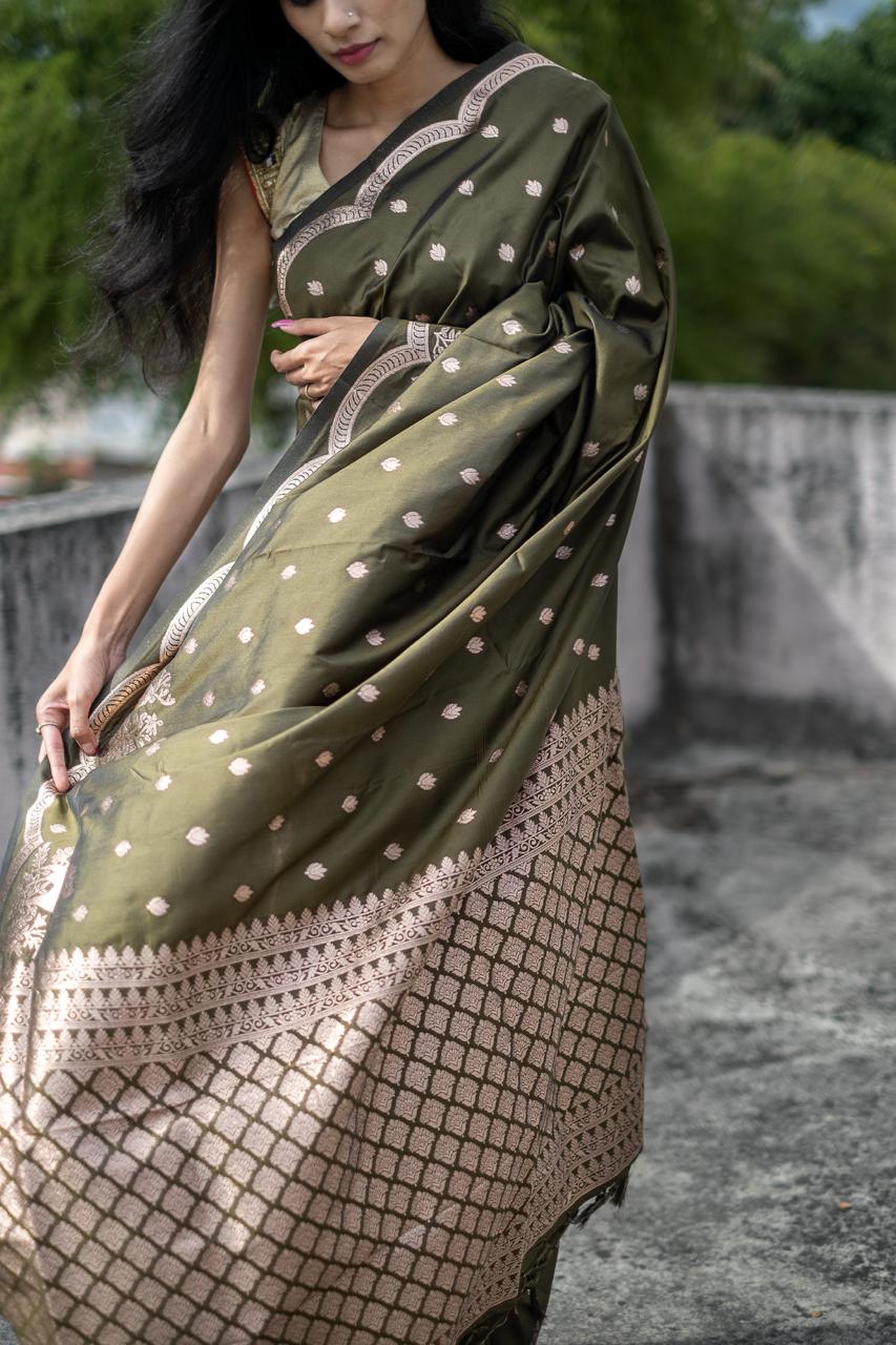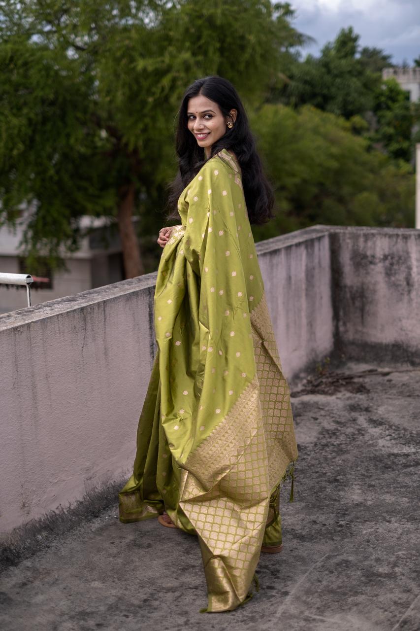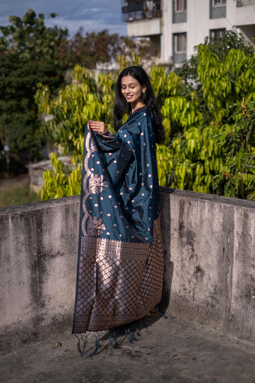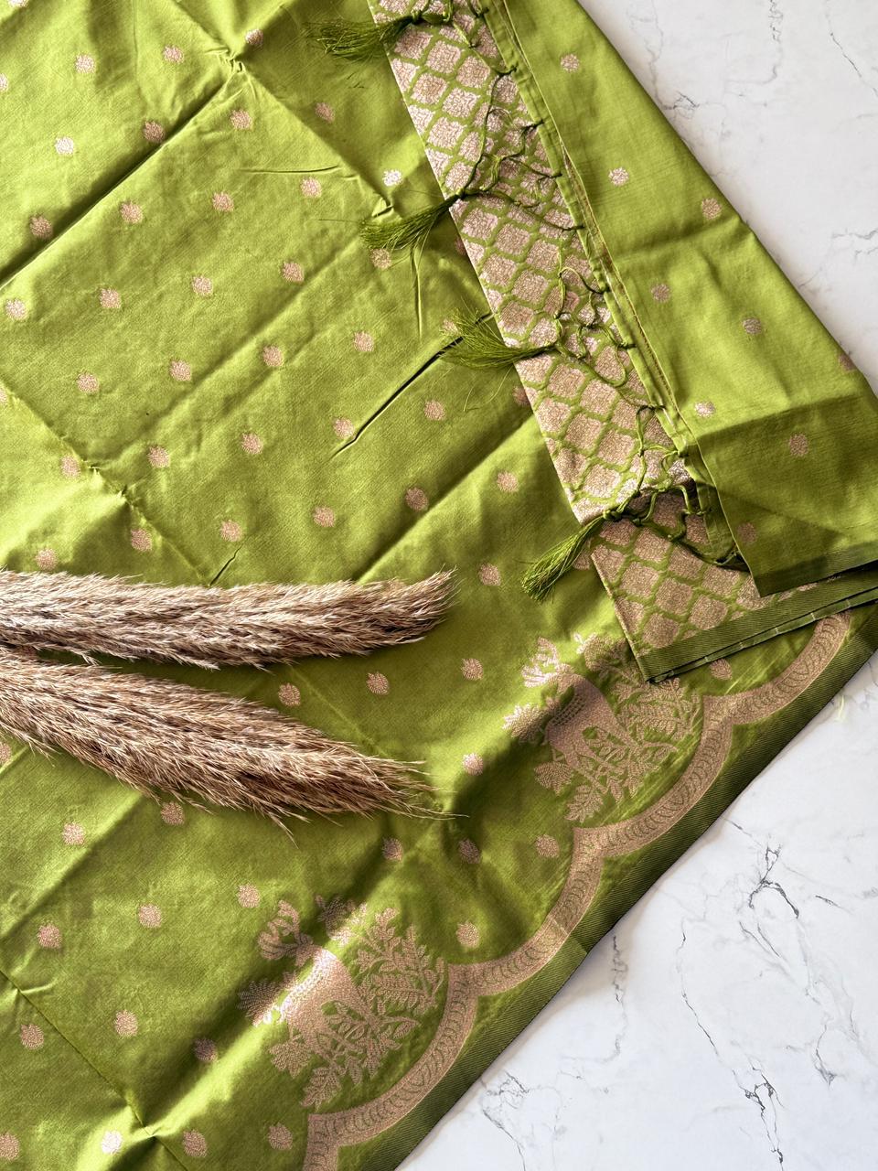 Fabric: Premium Silk Blend, Weaving: Fine Golden Zari Work Design: Traditional butta motifs with scalloped border, Pallu: Heavy rich zari pallu with intricate detailing, Blouse: Matching woven blouse piece included, Look: Perfect for weddings, festive celebrations & partywear , Drapes beautifully with a soft, smooth finish