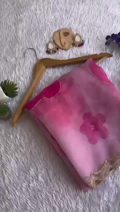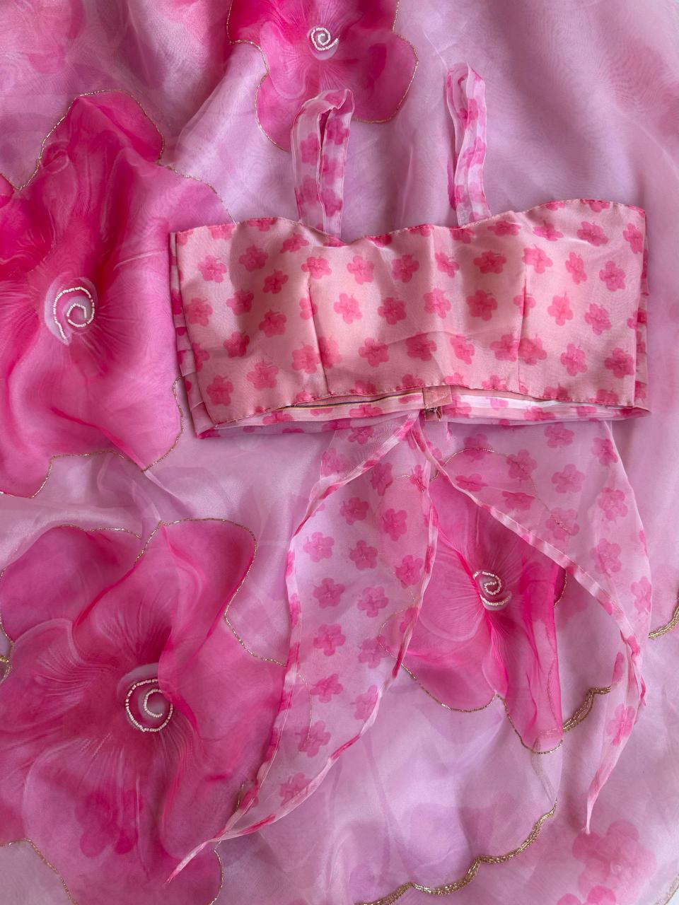 Step into a floral fantasy with this exquisite pink organza saree. The saree features oversized, hand-painted style pink blossoms with shimmering gold-wired edging, creating a 3D effect that is both modern and romantic. The look is completed with a trendy sleeveless cropped blouse featuring a delicate pink floral print and a stylish back tie-up detail.