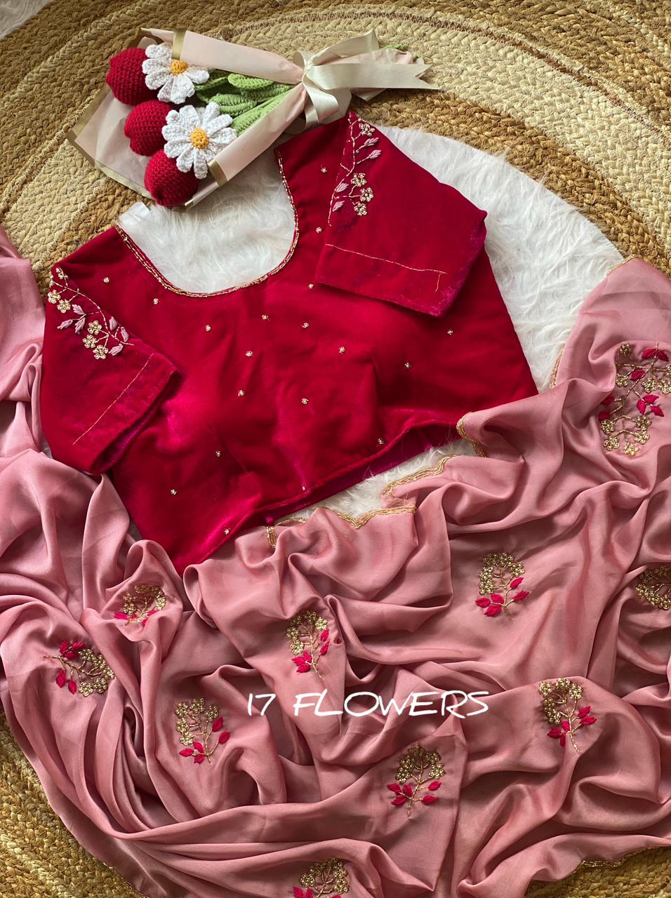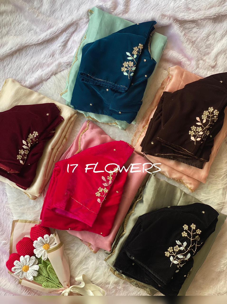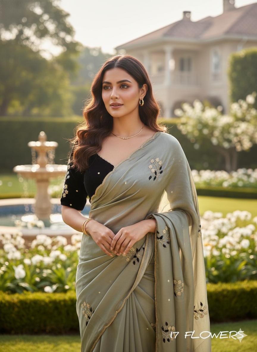 Elevate your ethnic wardrobe with our latest masterpiece. This collection features lightweight, fluid drapes paired with luxurious velvet blouses. Each blouse is meticulously crafted with a signature "17 Flowers" floral embroidery on the sleeves, adding a touch of vintage royalty to a modern silhouette.