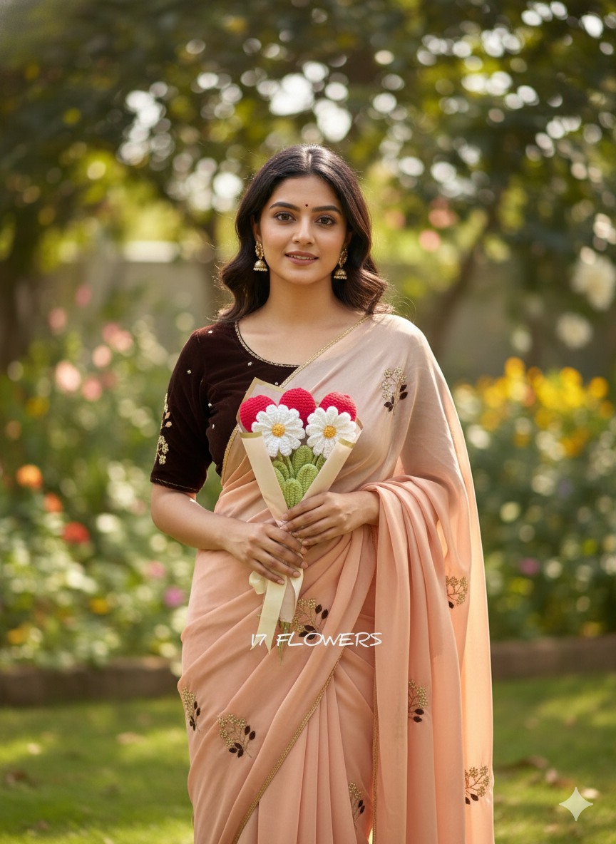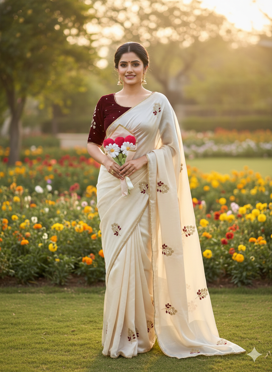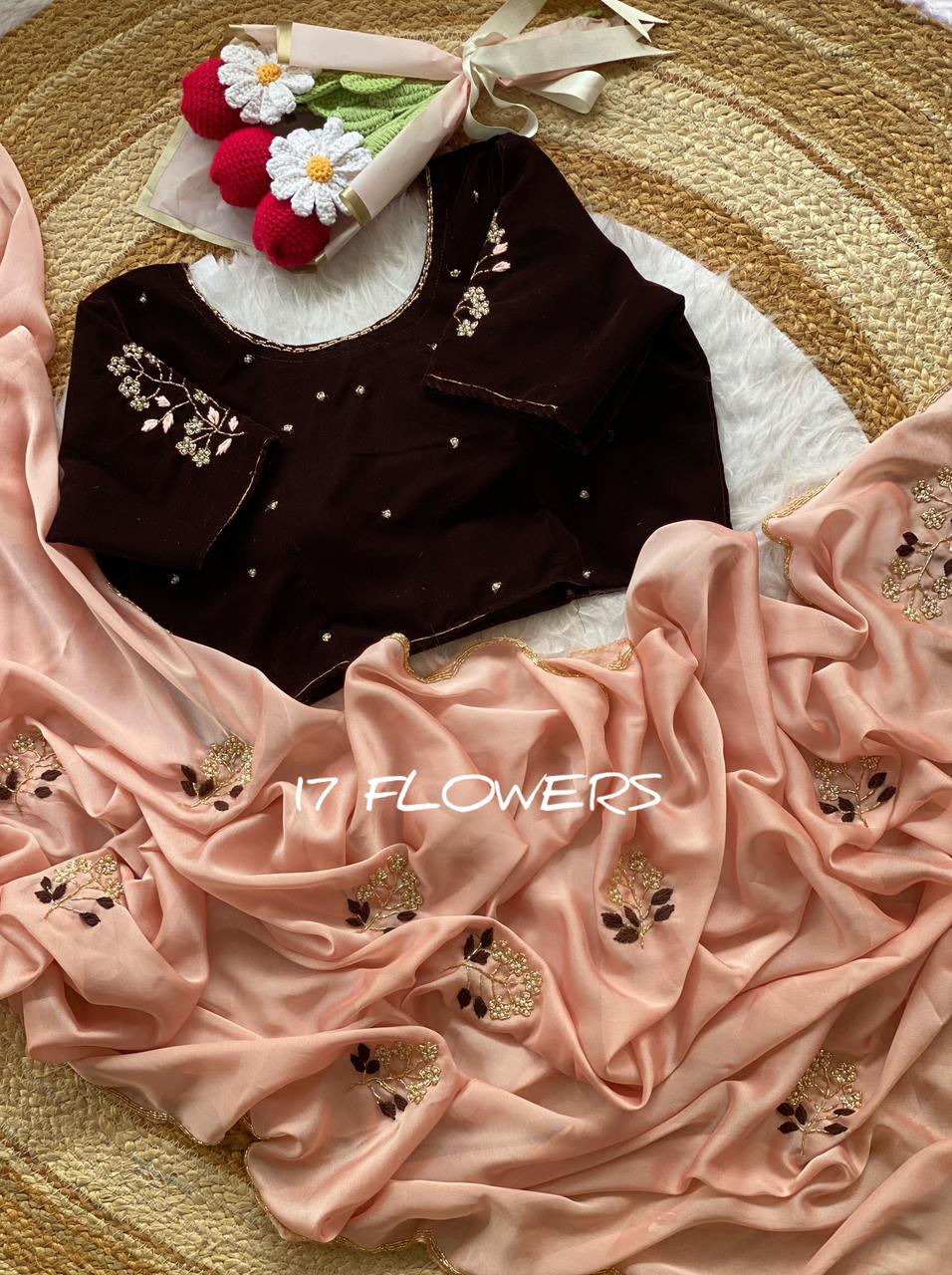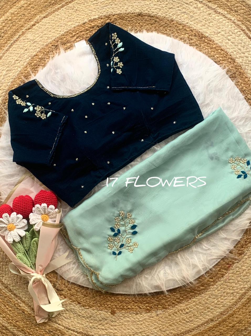 Elevate your ethnic wardrobe with our latest masterpiece. This collection features lightweight, fluid drapes paired with luxurious velvet blouses. Each blouse is meticulously crafted with a signature "17 Flowers" floral embroidery on the sleeves, adding a touch of vintage royalty to a modern silhouette.
