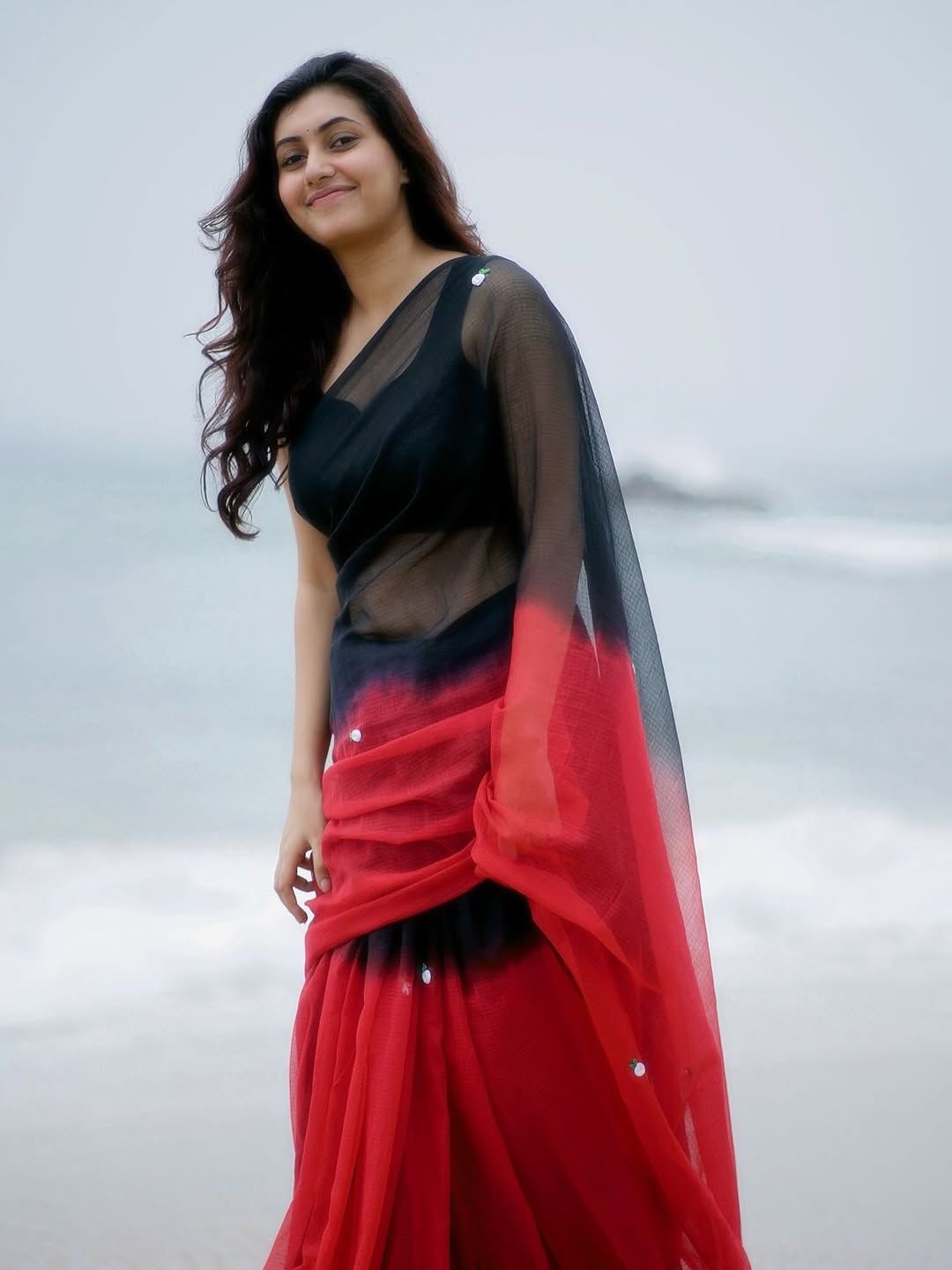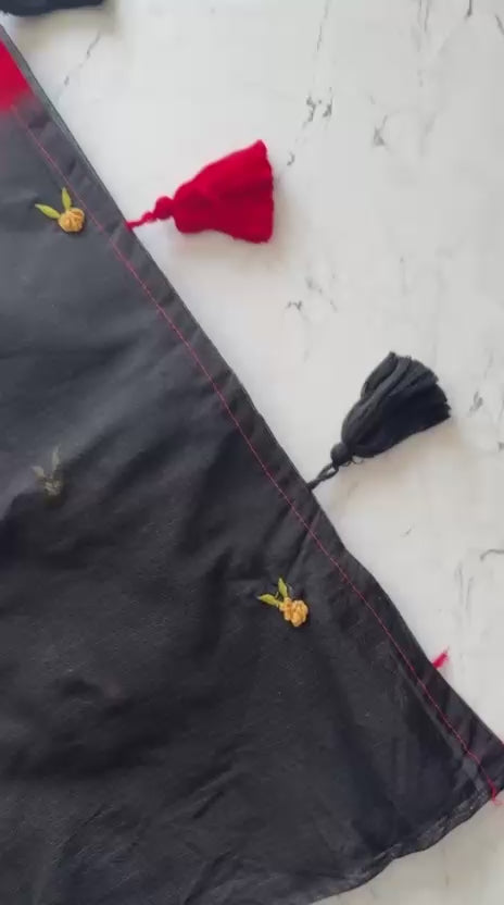 A captivating black kota doriya saree featuring a bold, vibrant scarlet red border and pallu. The sheer black fabric beautifully contrasts with the rich red, creating a dramatic and elegant look perfect for a resort or evening occasion