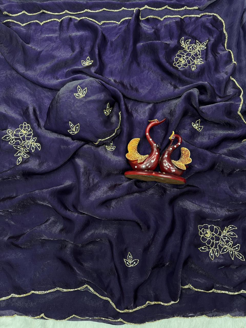 This exquisite dark purple saree offers a blend of traditional motifs and contemporary styling. The lightweight fabric ensures comfort for long hours, while the gold embroidery provides just the right amount of sparkle.
