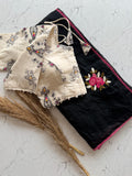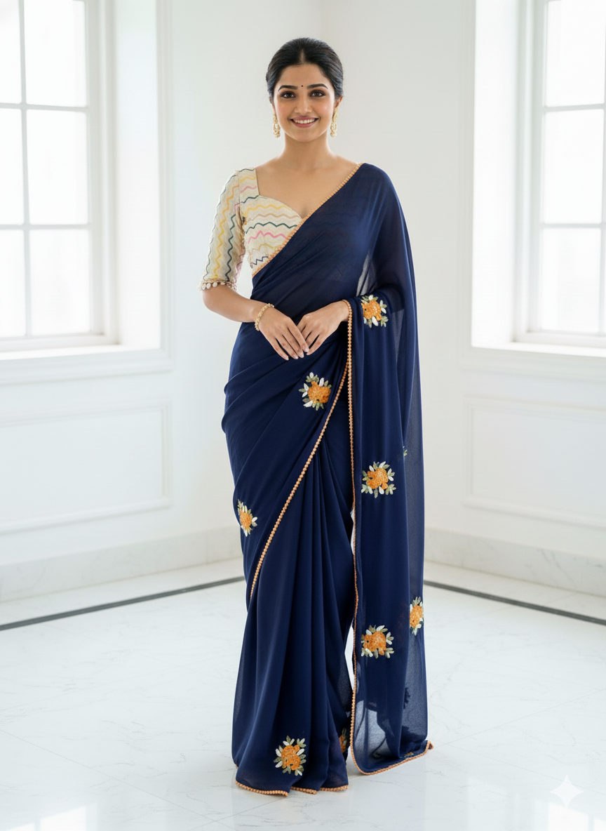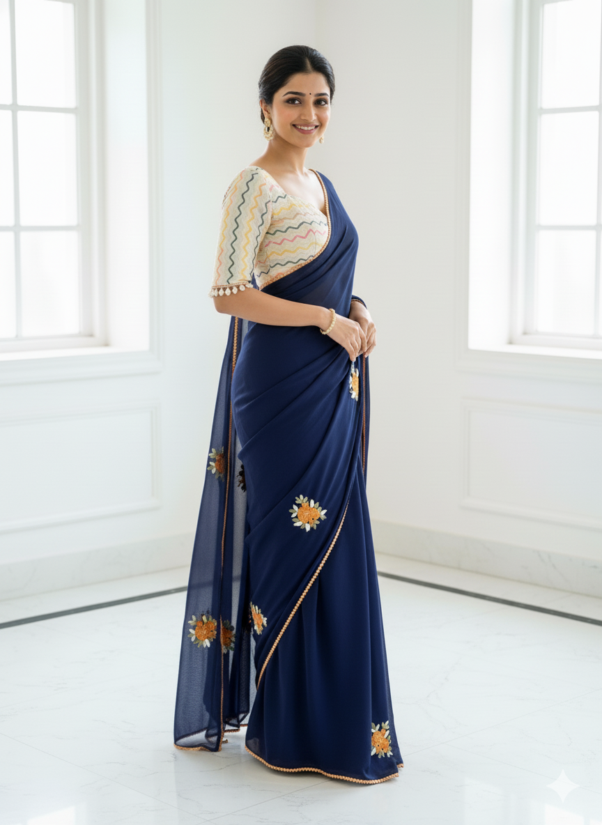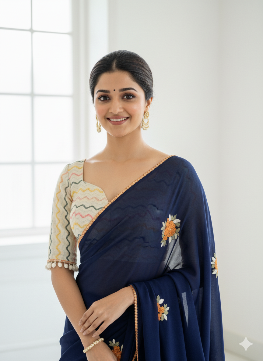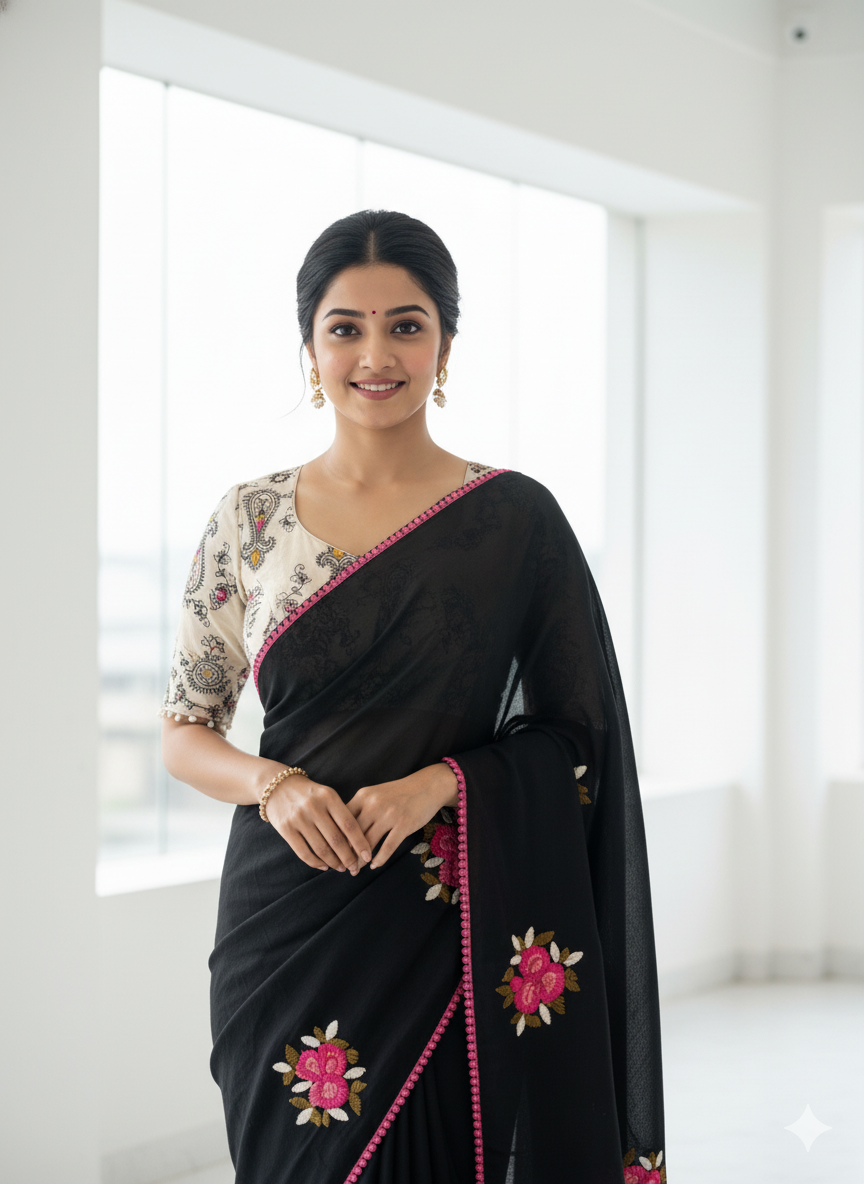 Saree Fabric & Color: Luxurious, lightweight black Georgette or Chiffon that drapes effortlessly and maintains a sleek silhouette. Â Â