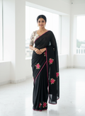 🖤 The Empress Saree: Black Georgette with Handcrafted Pink Blooms
