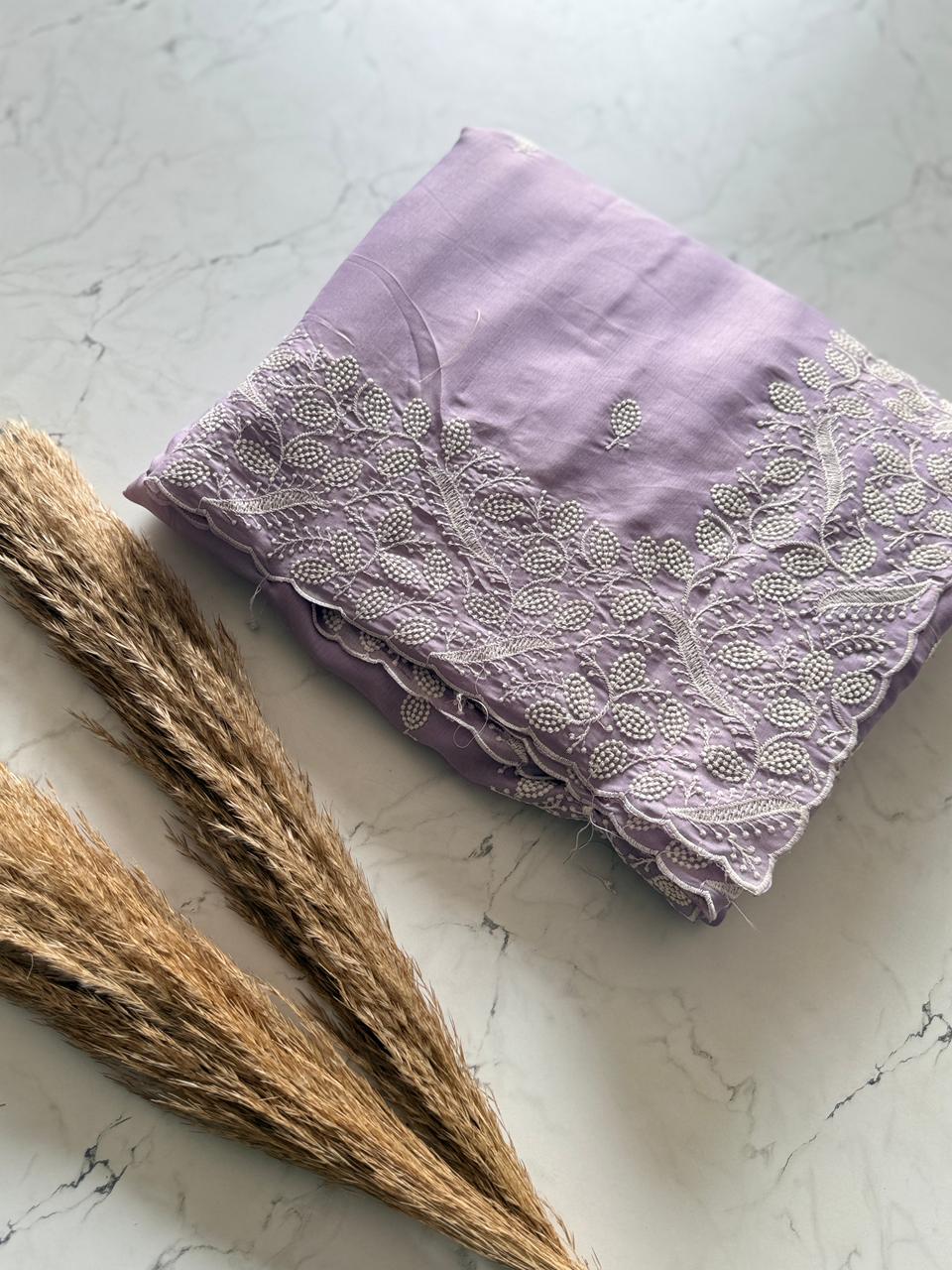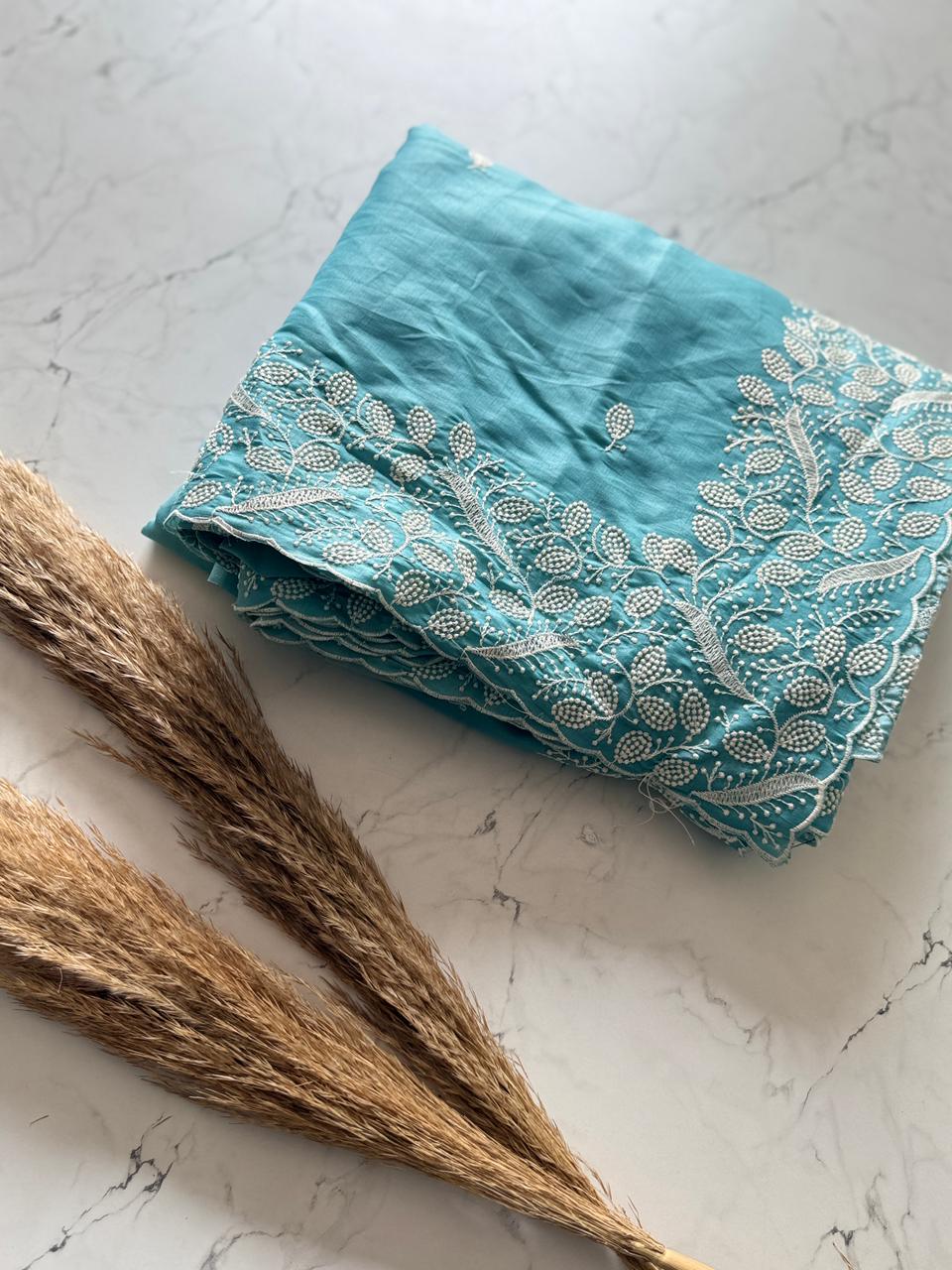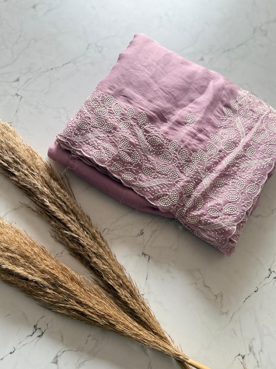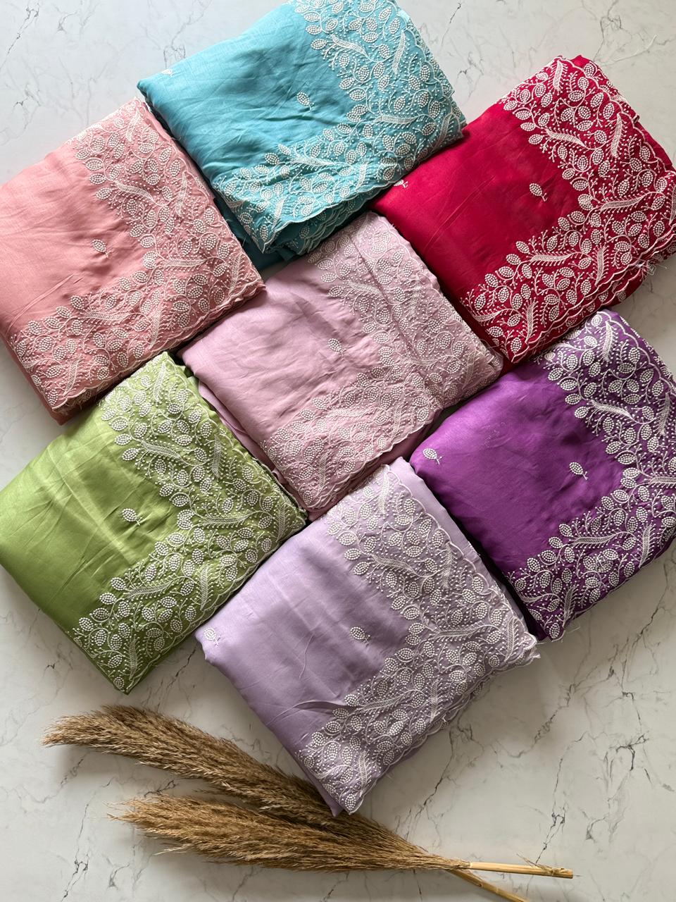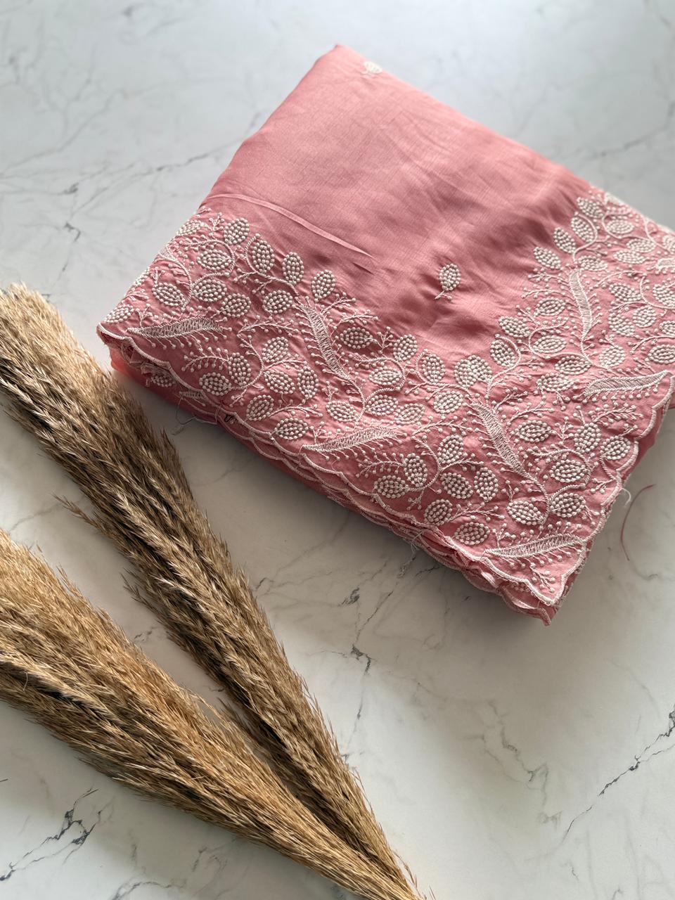 levate your ethnic wardrobe with our latest collection of lightweight, hand-worked sarees. Featuring intricate white bead embroidery along a scalloped border, these sarees strike the perfect balance between traditional craftsmanship and modern minimalism.