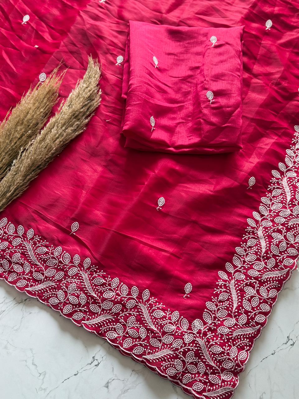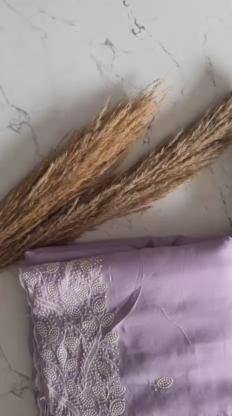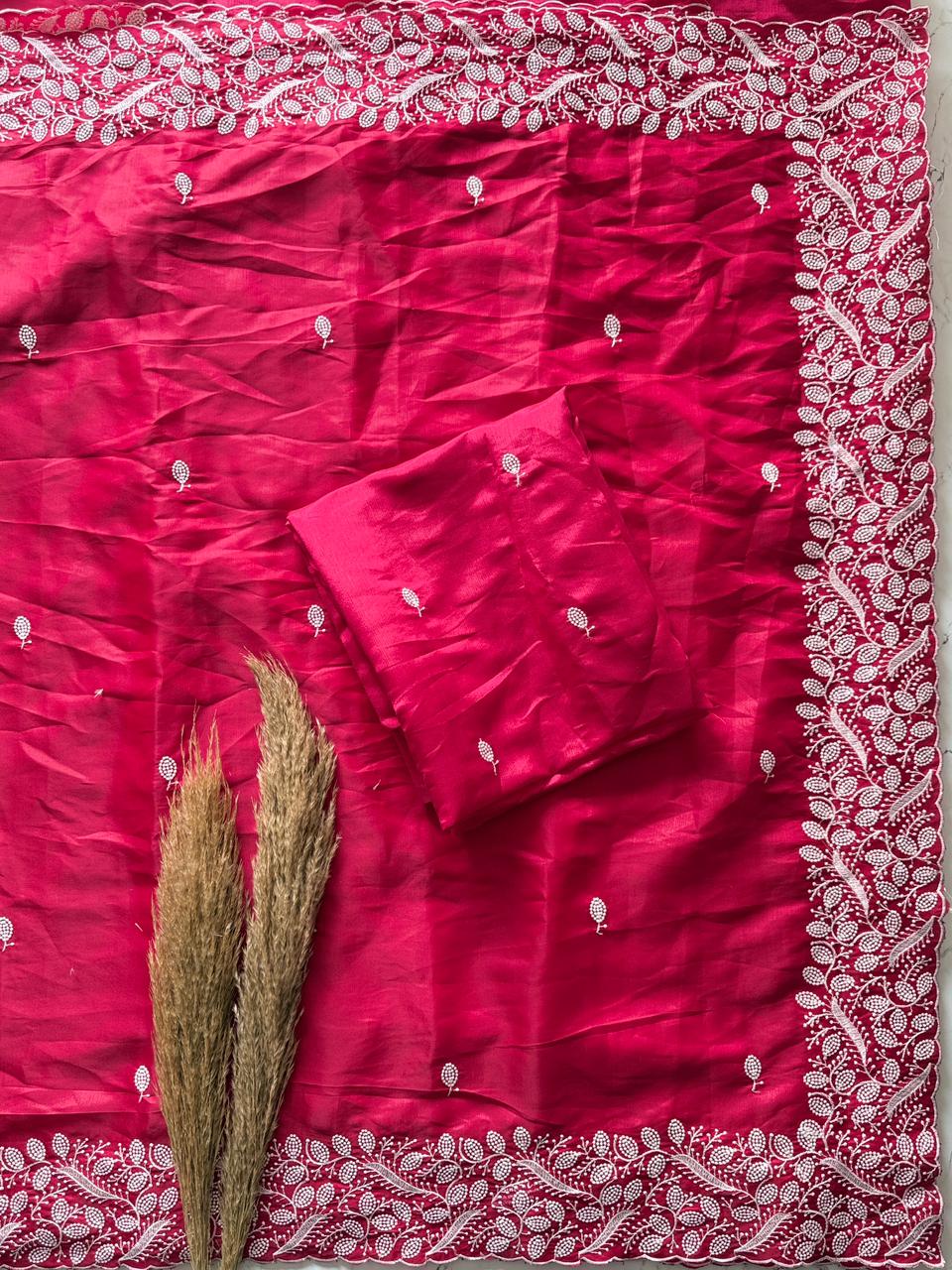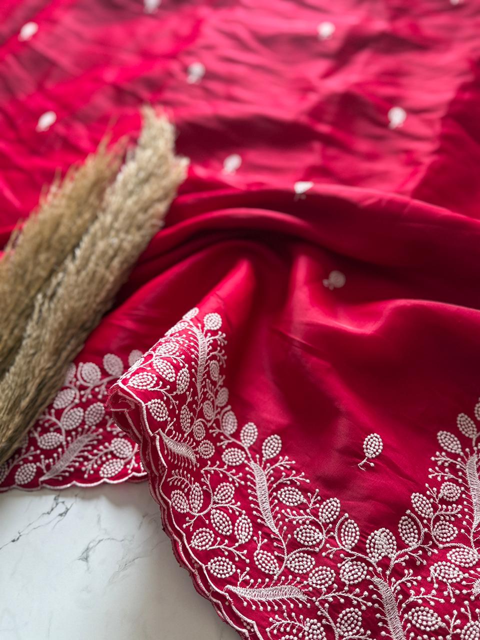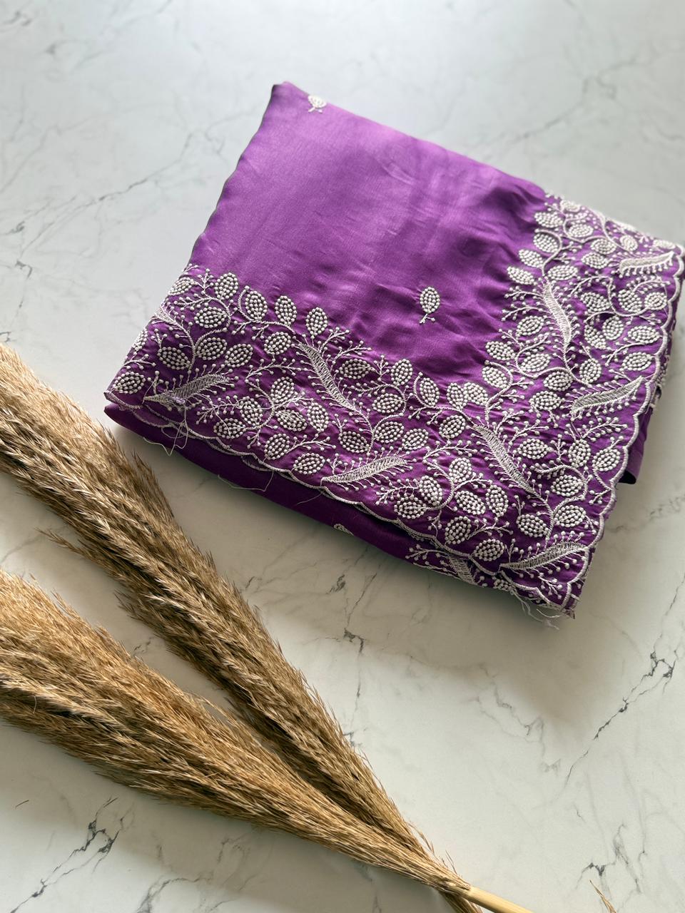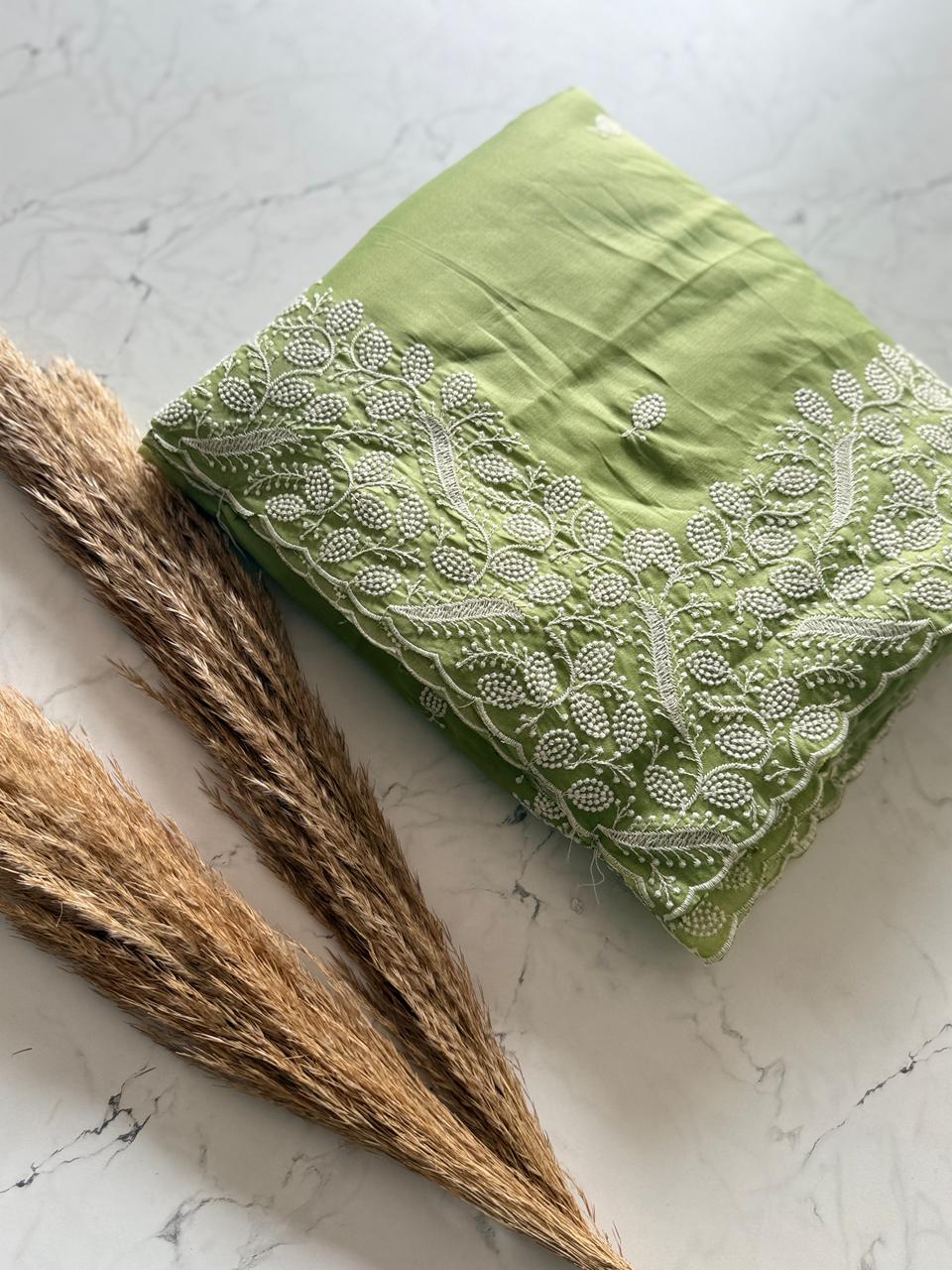 levate your ethnic wardrobe with our latest collection of lightweight, hand-worked sarees. Featuring intricate white bead embroidery along a scalloped border, these sarees strike the perfect balance between traditional craftsmanship and modern minimalism.
