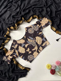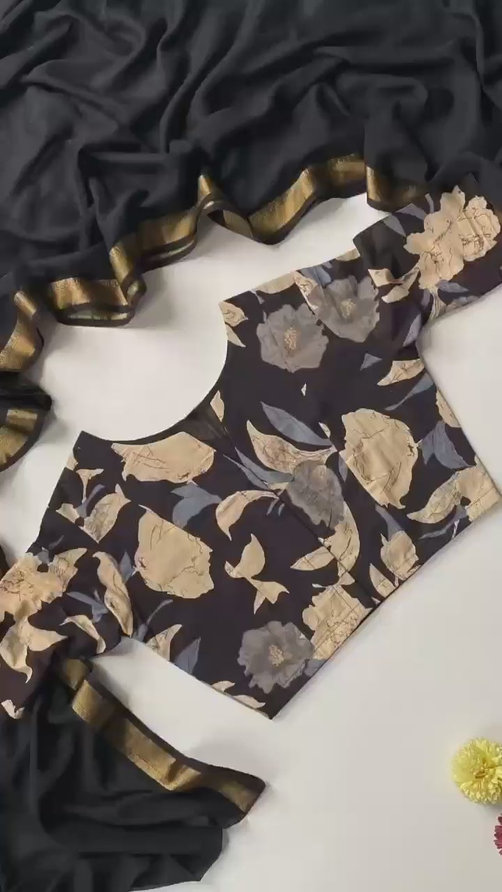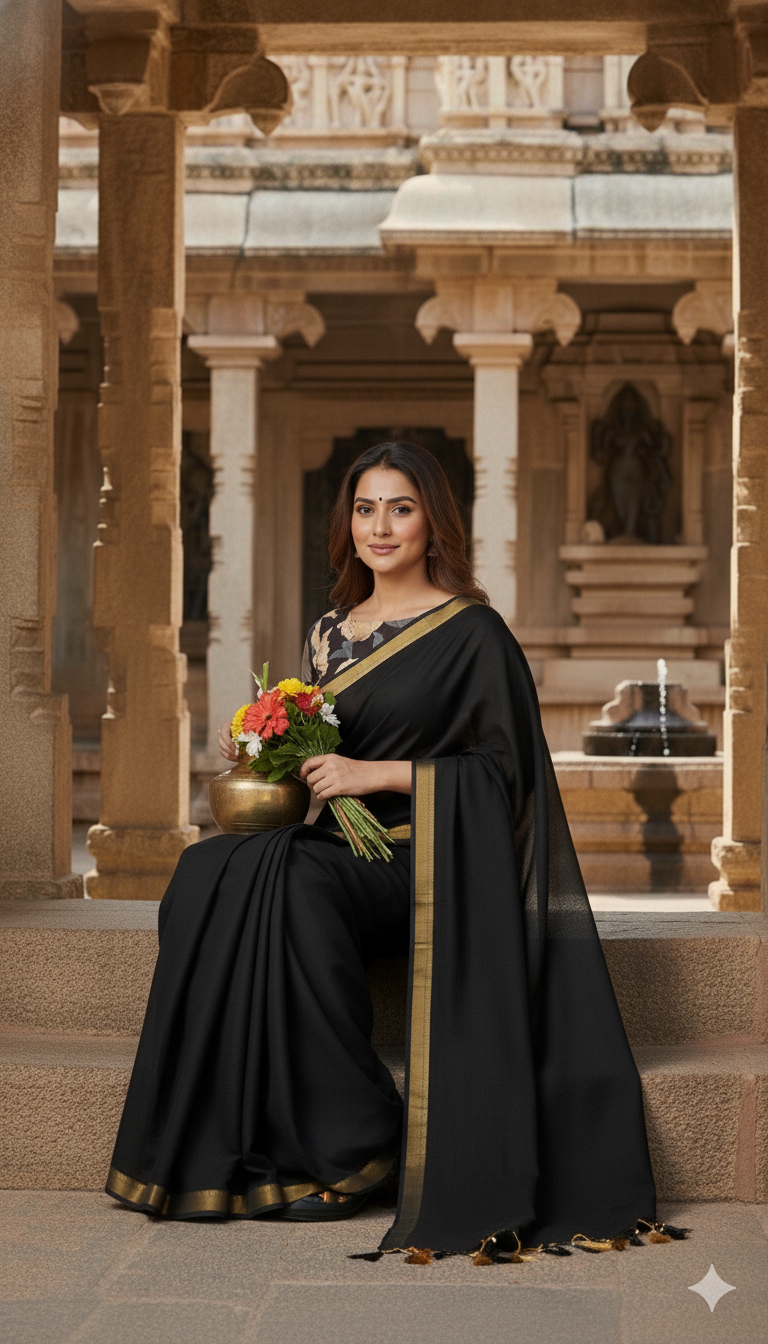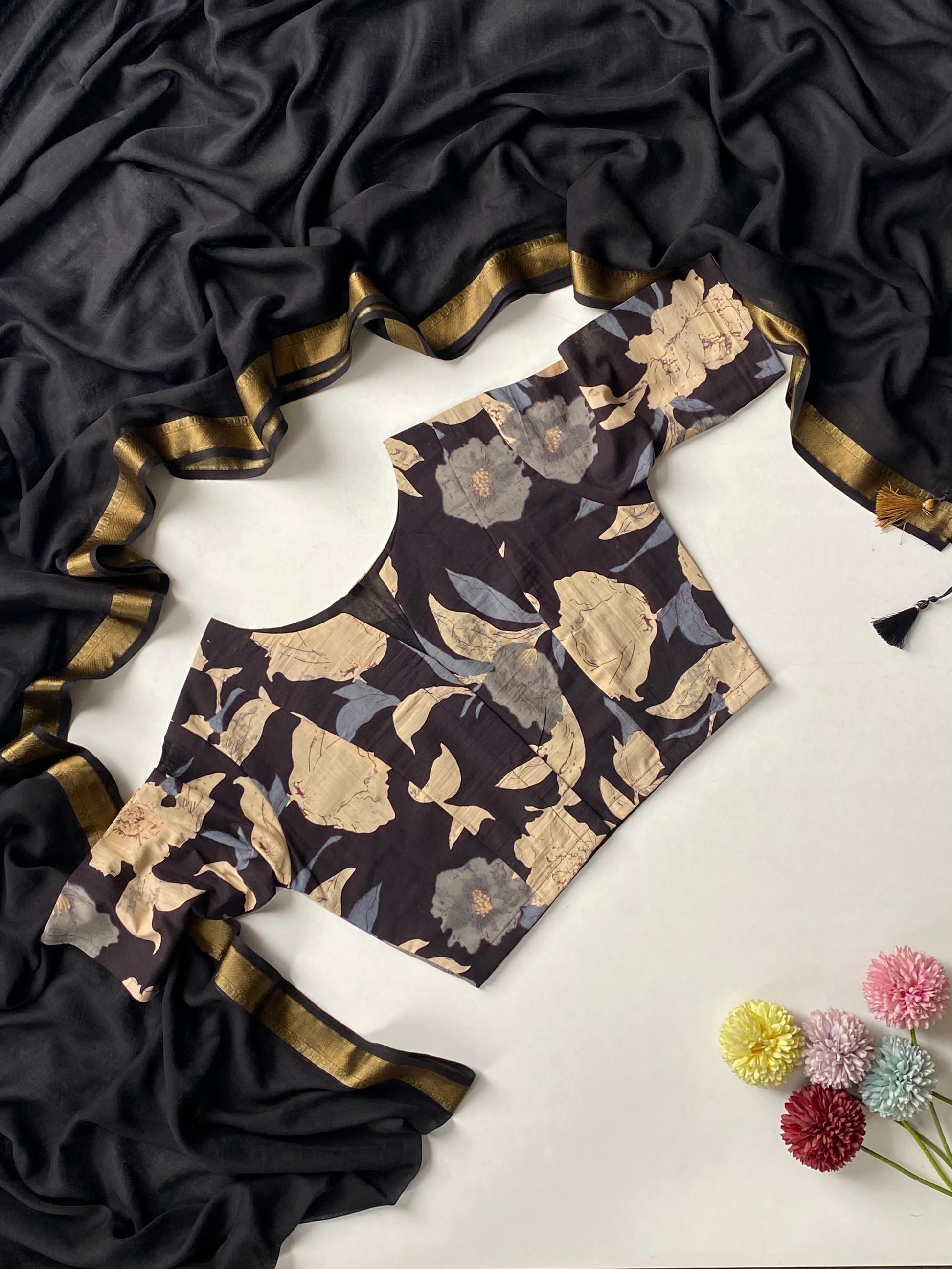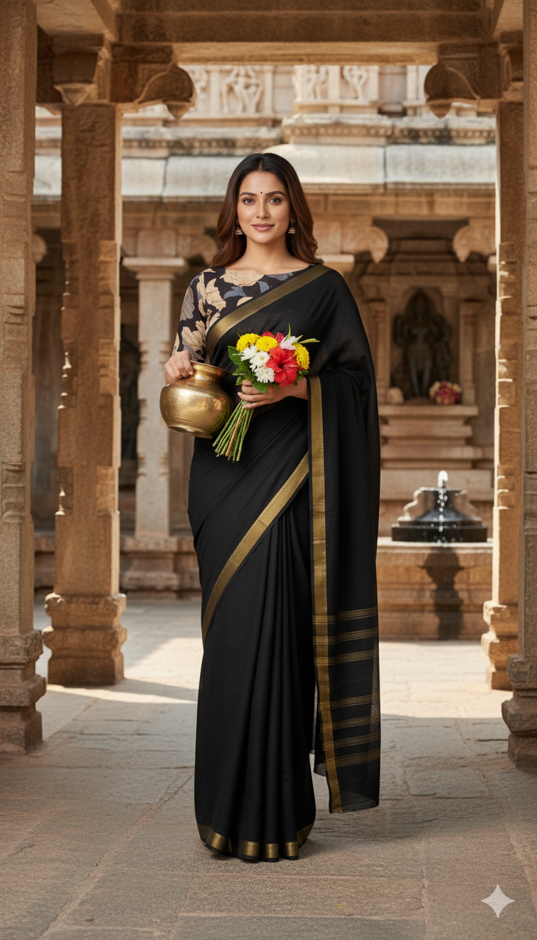 elegance of our Midnight Gold Weave Saree. Crafted from luxurious Cotton Silk, this saree is the epitome of understated grandeur, perfect for everything from formal office events to festive gatherings and family functions. ย ย Color & Fabric: A deep, rich Black & Marron provides a stunning canvas for the gold accents. The premium Cotton Silk blend ensures a soft drape and comfortable wear throughout the day. The Pallu: The plain pallu offers a clean, contemporary look, beautifully finished with handcrafted dual-toned tassels (one gold, one black) that add movement and playful texture.The Blouse: Paired with a stylish printed blouse (as seen on the model) that features a high-neck and elegant sleeves, offering a beautiful contrast and a modern silhouette.