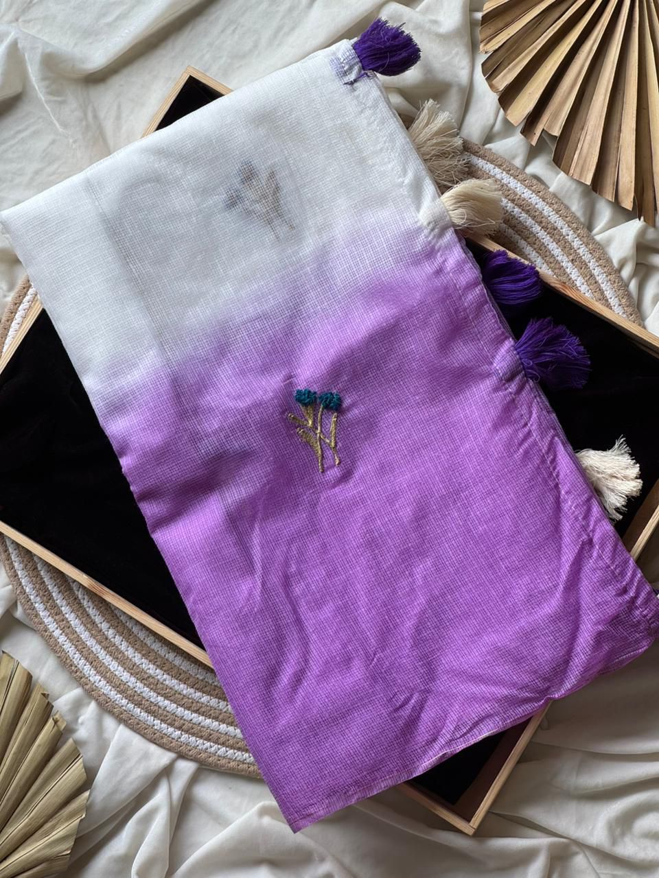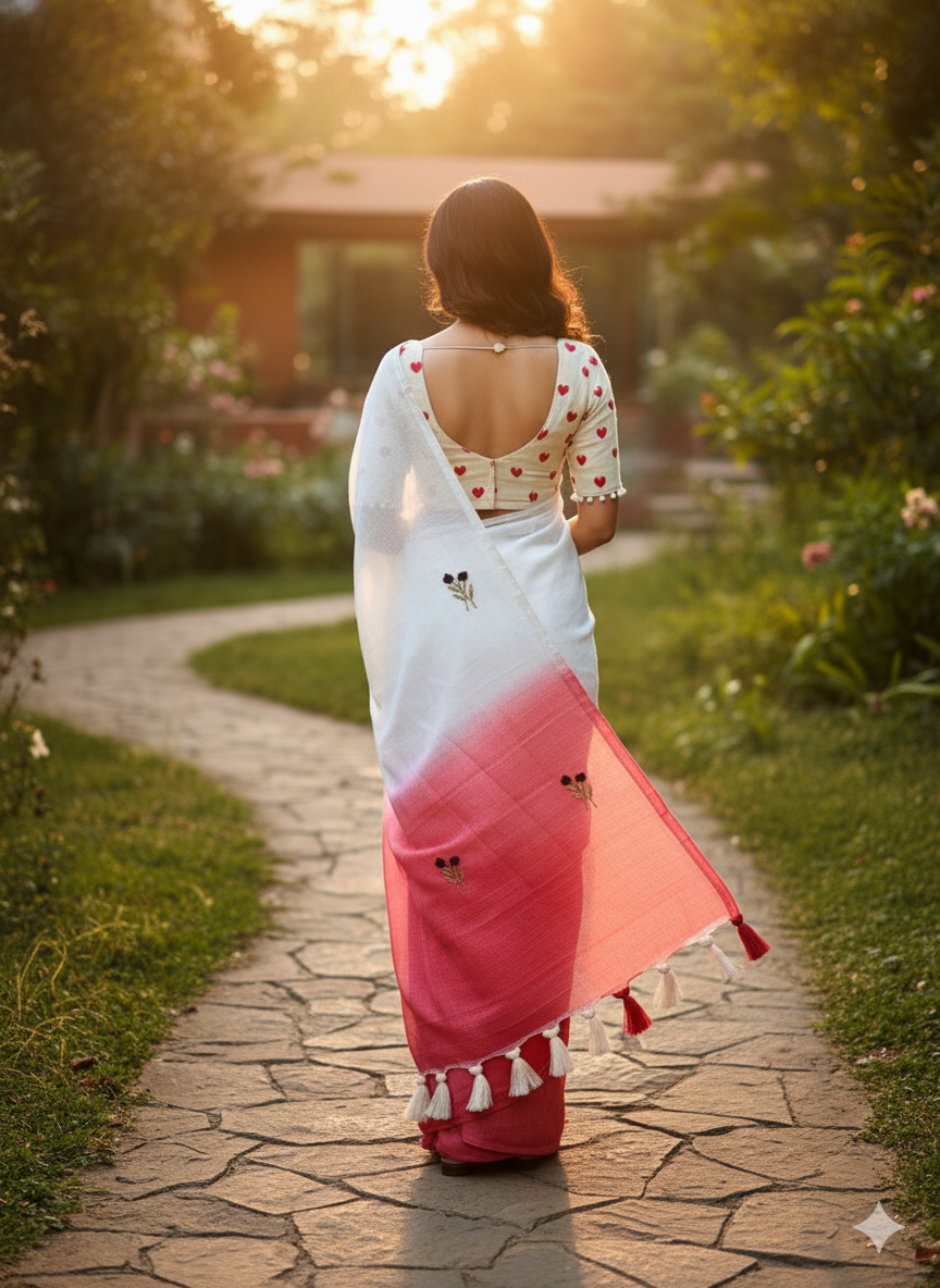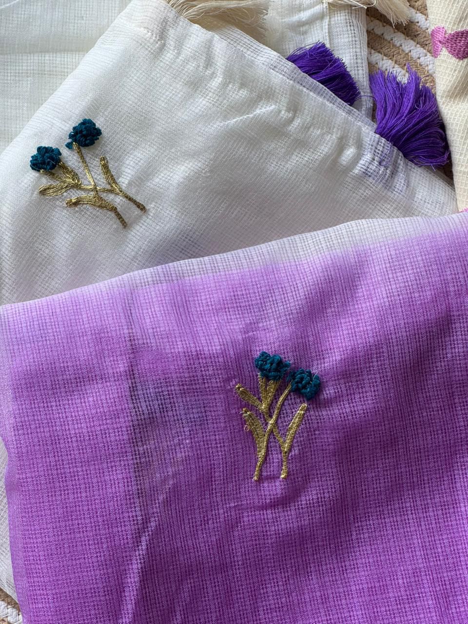 Soft Ombre Floral Embroidered Tassel Saree .. Our Most Industrial Kota viscose Chex With hand knot Embroidery Work Ton Too. This elegant saree features a beautiful ombre transition from pastel blue to soft pink, enhanced with delicate floral embroidered motifs placed gracefully across the pallu. The saree is crafted from a lightweight, flowy fabric that drapes effortlessly, giving a refined and feminine look. The highlight of the design is the handcrafted tassel edging on the pallu, adding a stylish and contemporary touch. Perfect for festive occasions, daytime events, pre-wedding functions, and elegant celebrations.