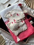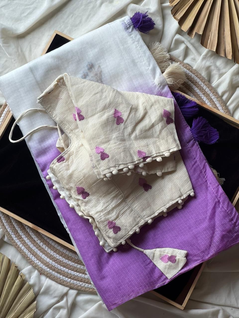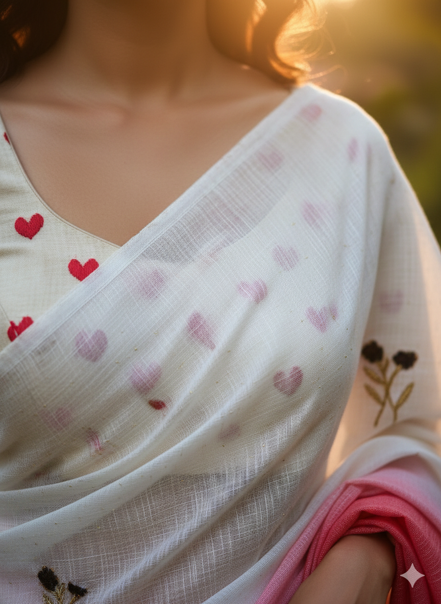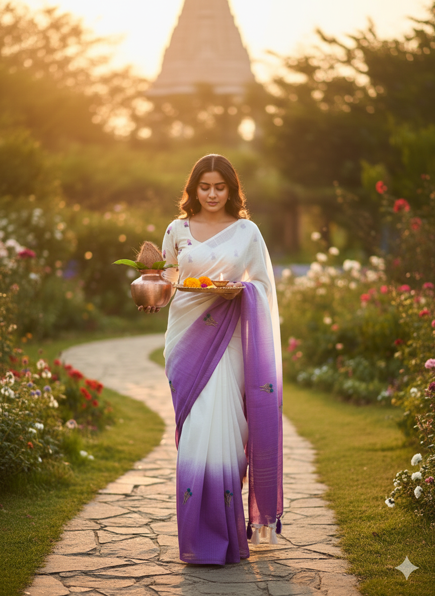 Soft Ombre Floral Embroidered Tassel Saree .. Our Most Industrial Kota viscose Chex With hand knot Embroidery Work Ton Too. This elegant saree features a beautiful ombre transition from pastel blue to soft pink, enhanced with delicate floral embroidered motifs placed gracefully across the pallu. The saree is crafted from a lightweight, flowy fabric that drapes effortlessly, giving a refined and feminine look. The highlight of the design is the handcrafted tassel edging on the pallu, adding a stylish and contemporary touch. Perfect for festive occasions, daytime events, pre-wedding functions, and elegant celebrations.