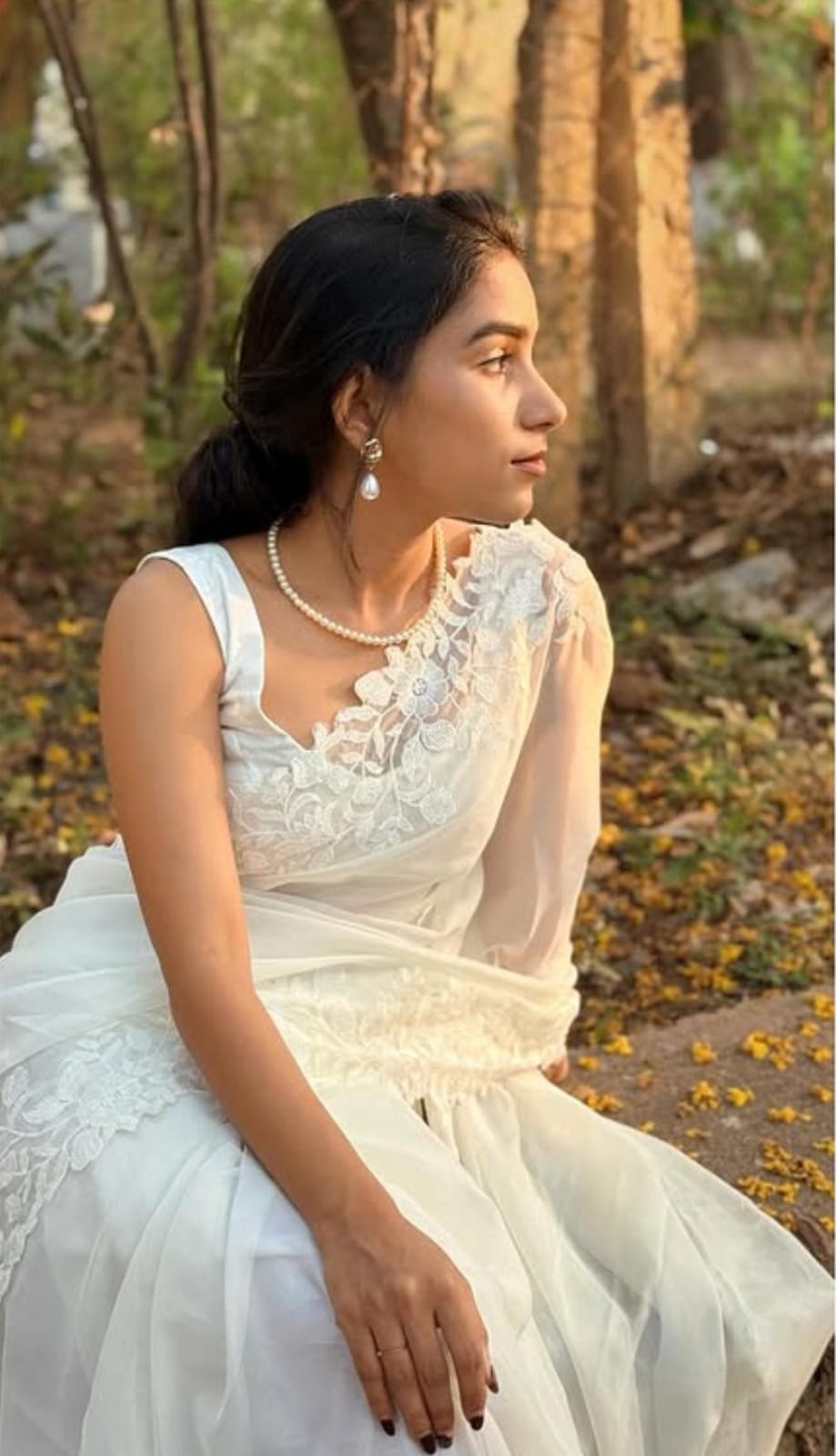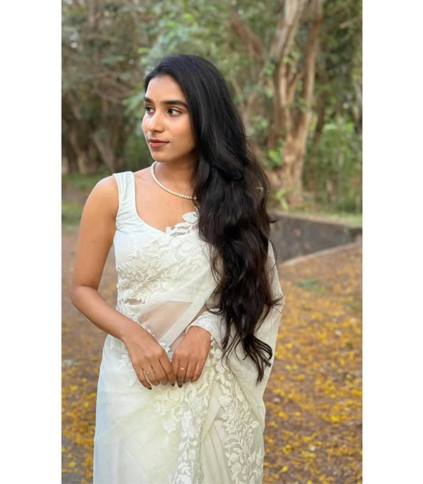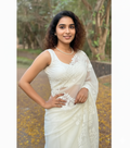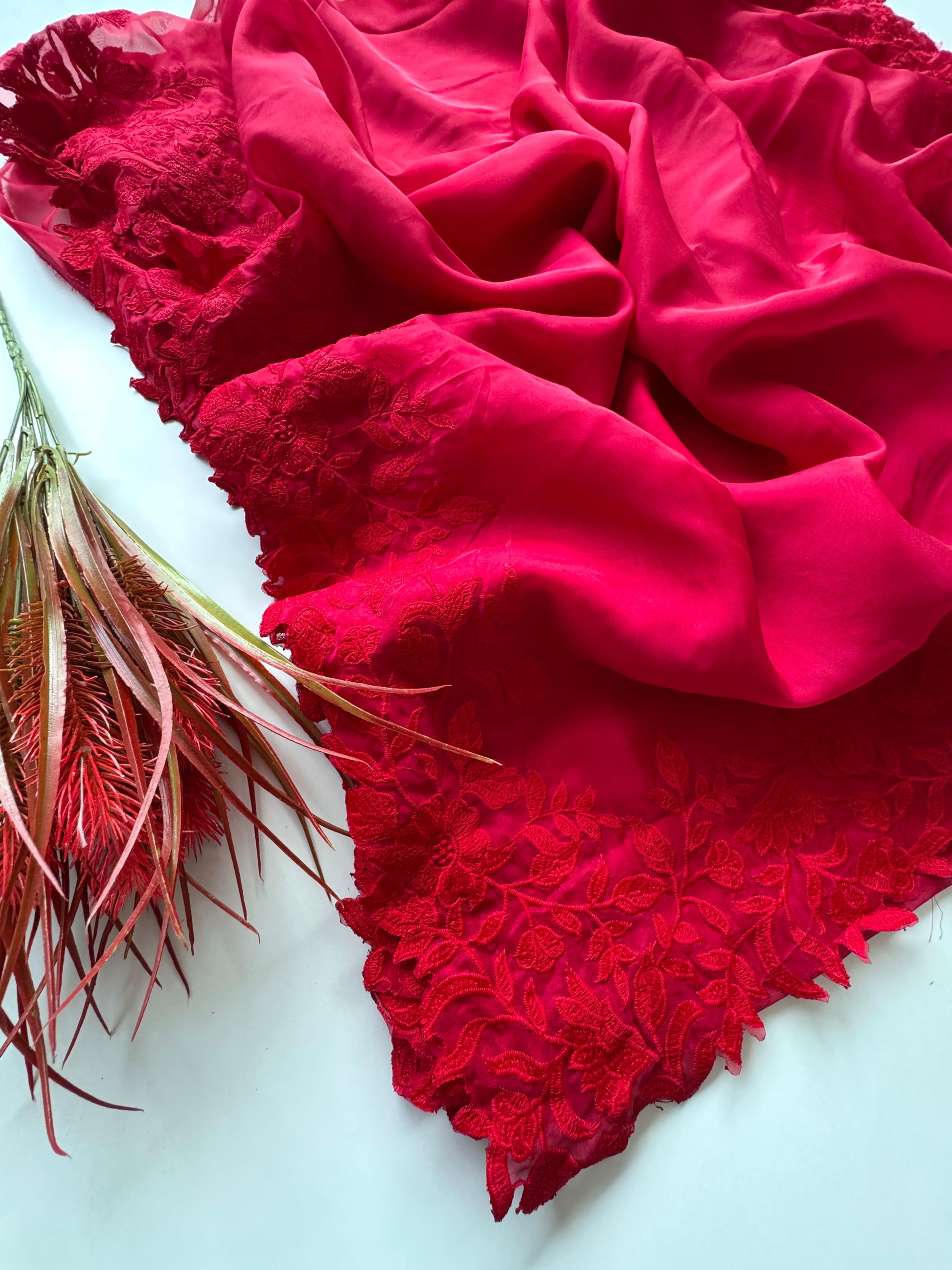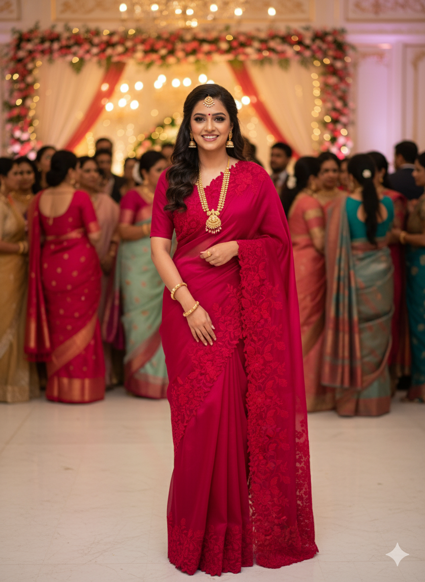 The Empress Drape, a striking saree in a vibrant Cherry Red & White that commands attention. Perfect for weddings, engagement parties, and grand festive occasions, this piece is an embodiment of traditional grace meeting contemporary luxury Vibrant Hue: A gorgeous, celebratory shade of Cherry Red/Rani Pink that flatters every skin tone.Intricate Work: The entire border and Pallu feature heavy, delicate floral cutwork  Pair it with traditional temple jewelry, as seen on the model, or keep it modern with sleek gold accessories for a standout look.A lightweight, saree fabric ( Organza ) provides a dreamy, flowing drape that is comfortable yet luxurious.