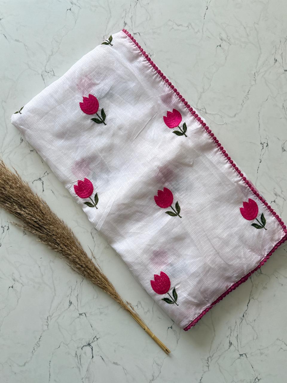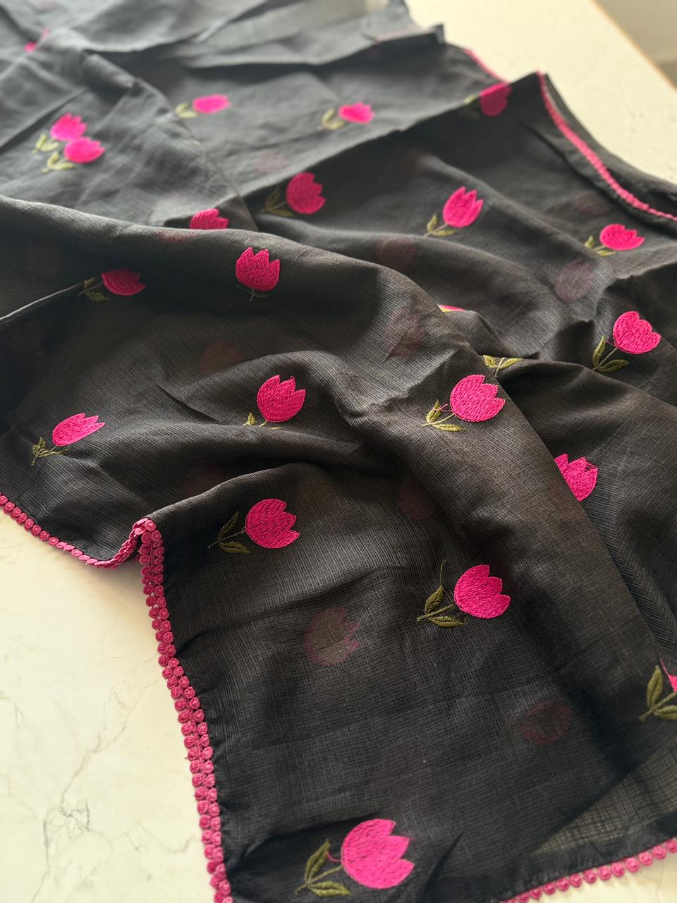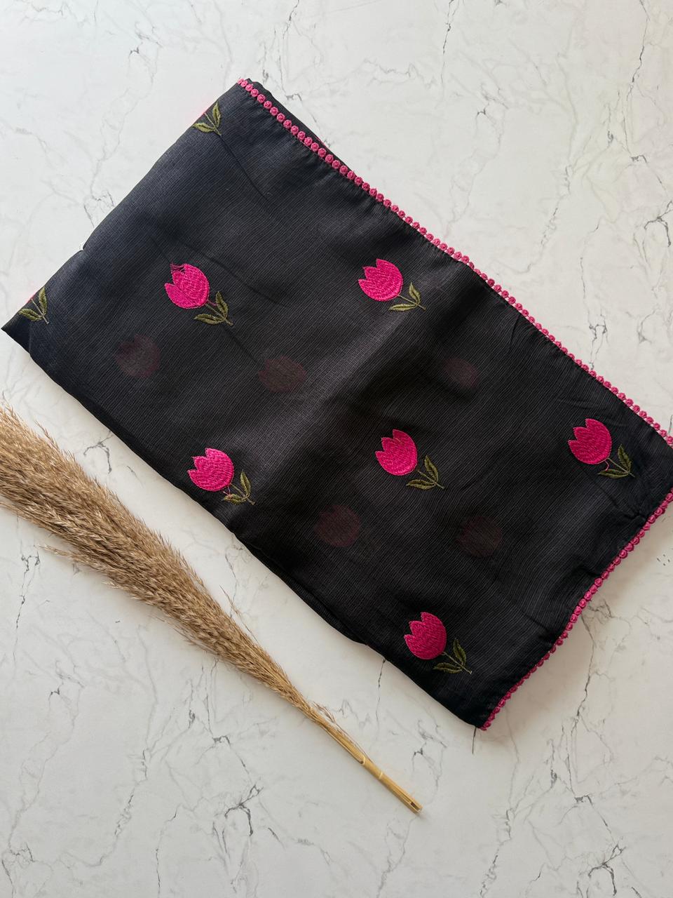 Why choose one when you can have both? β¨ Our newest arrival features the perfect contrast of timeless colors and playful floral details. Whether you're feeling the "Dark Aesthetic" or "Dreamy White" vibes, these tulip-embroidered sarees are designed to make heads turn.