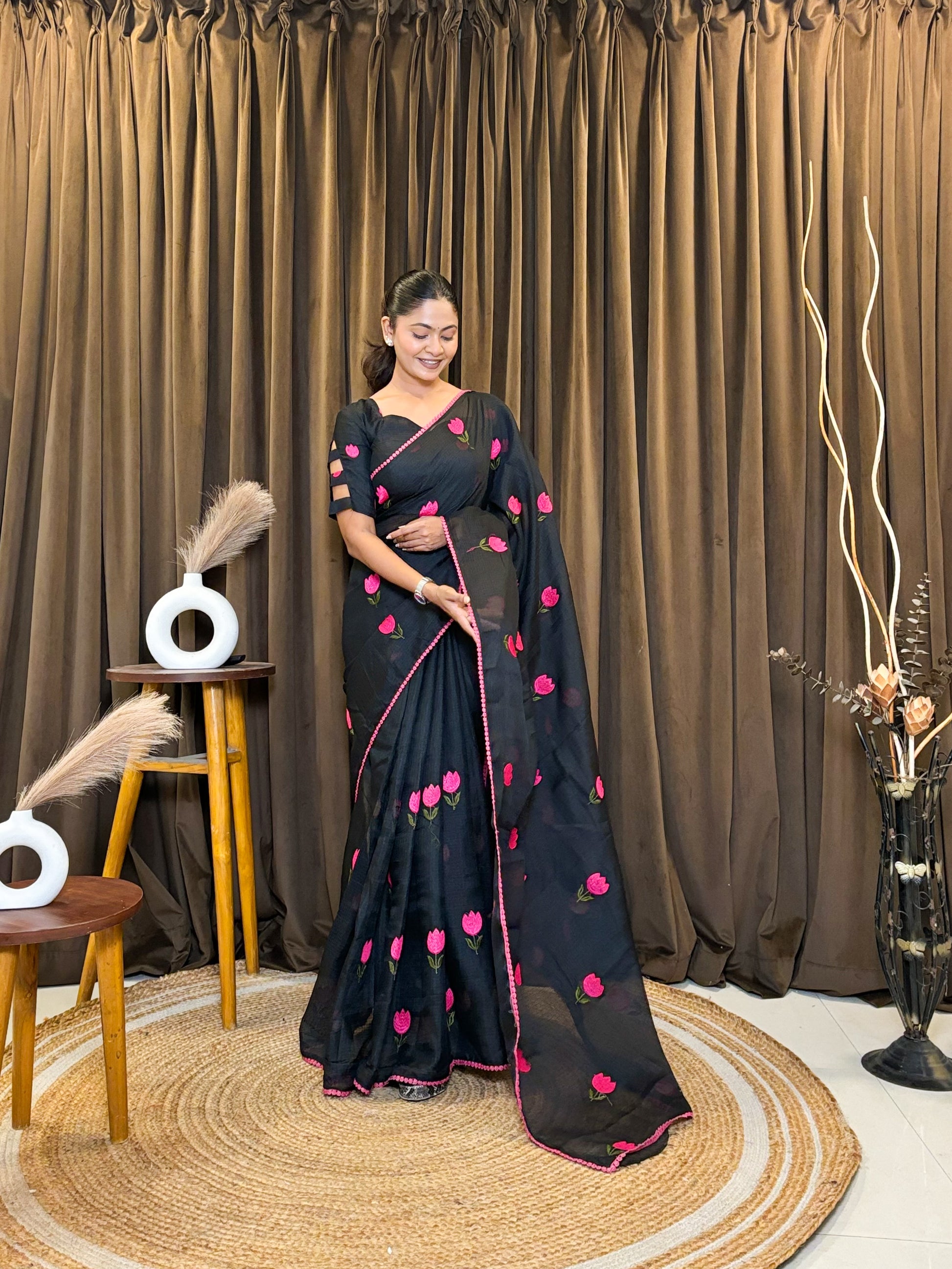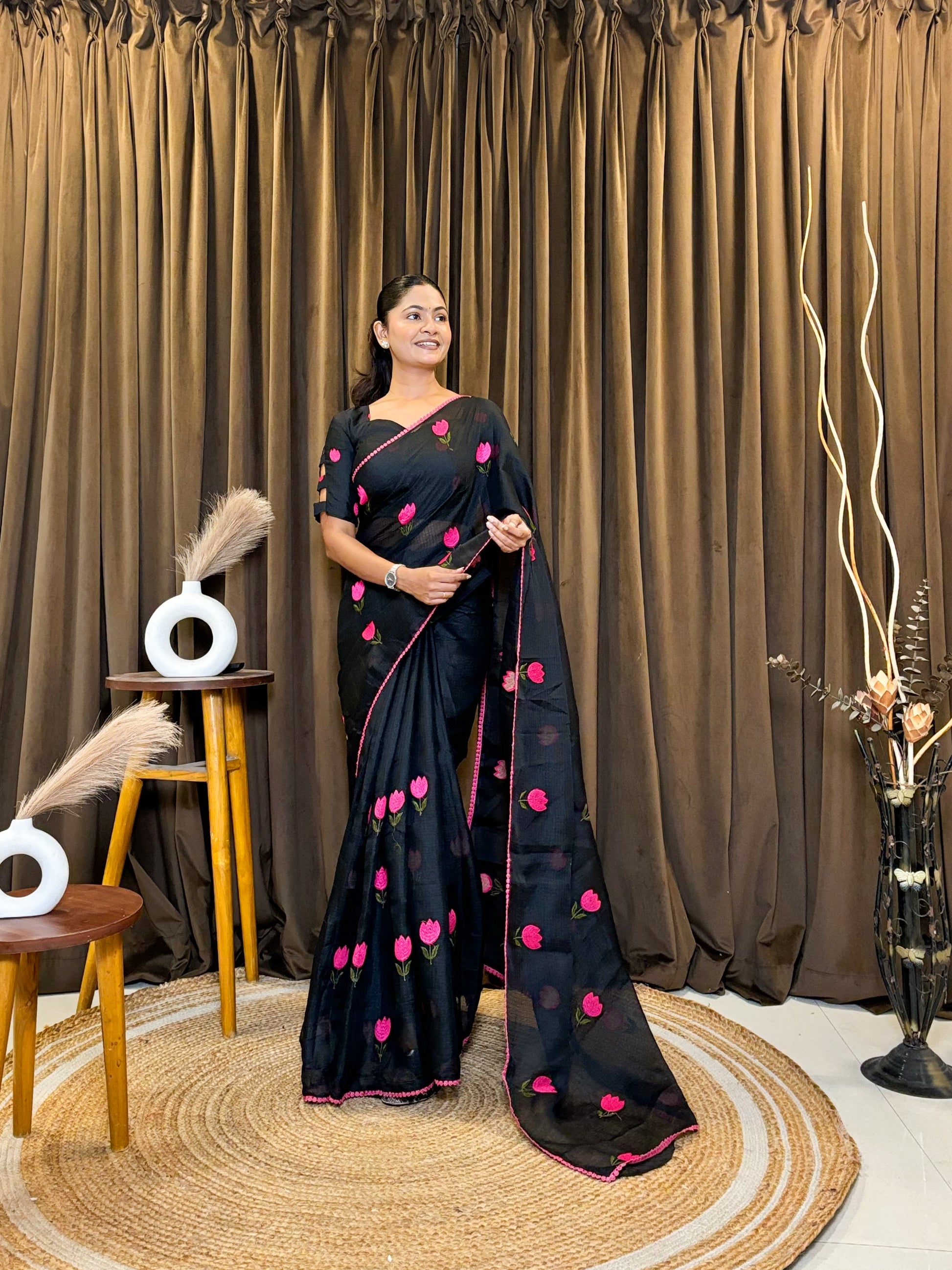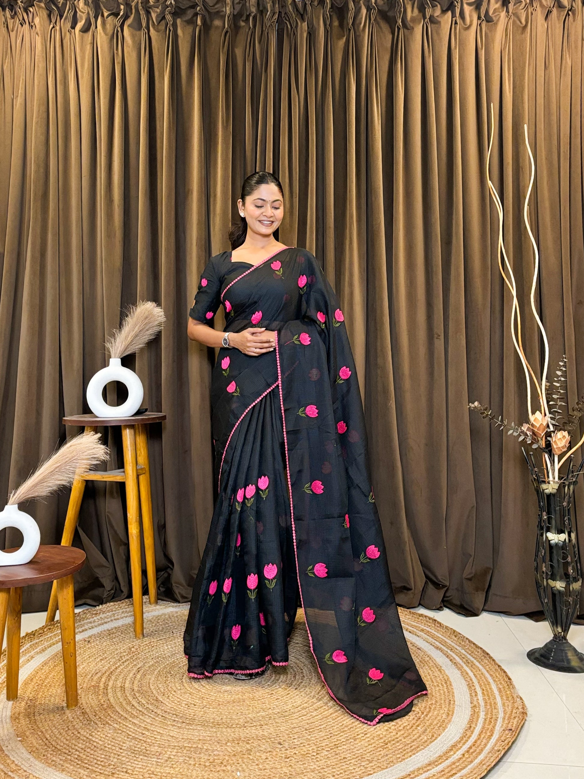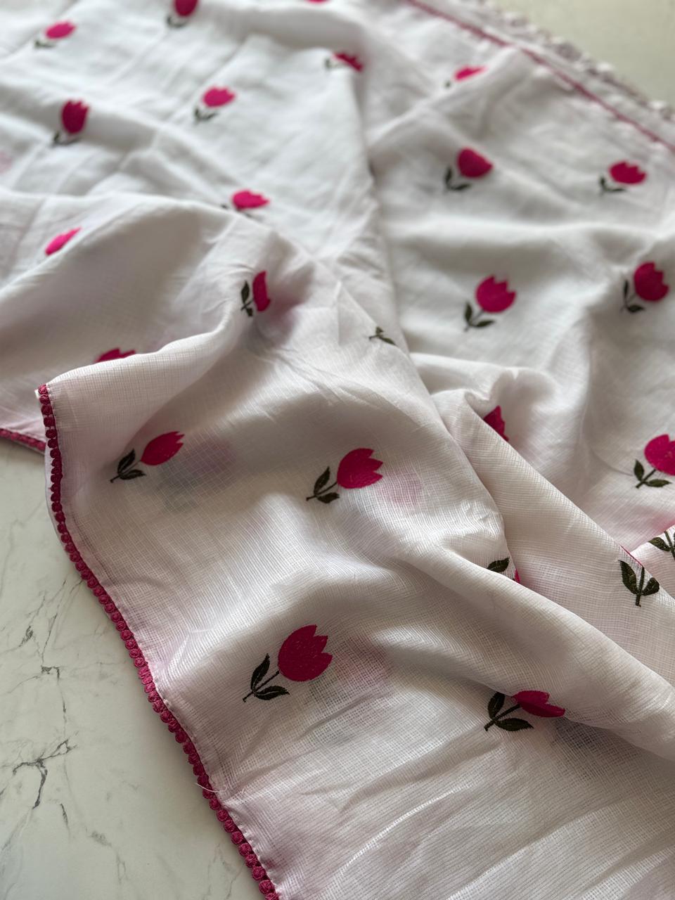 Why choose one when you can have both? β¨ Our newest arrival features the perfect contrast of timeless colors and playful floral details. Whether you're feeling the "Dark Aesthetic" or "Dreamy White" vibes, these tulip-embroidered sarees are designed to make heads turn.